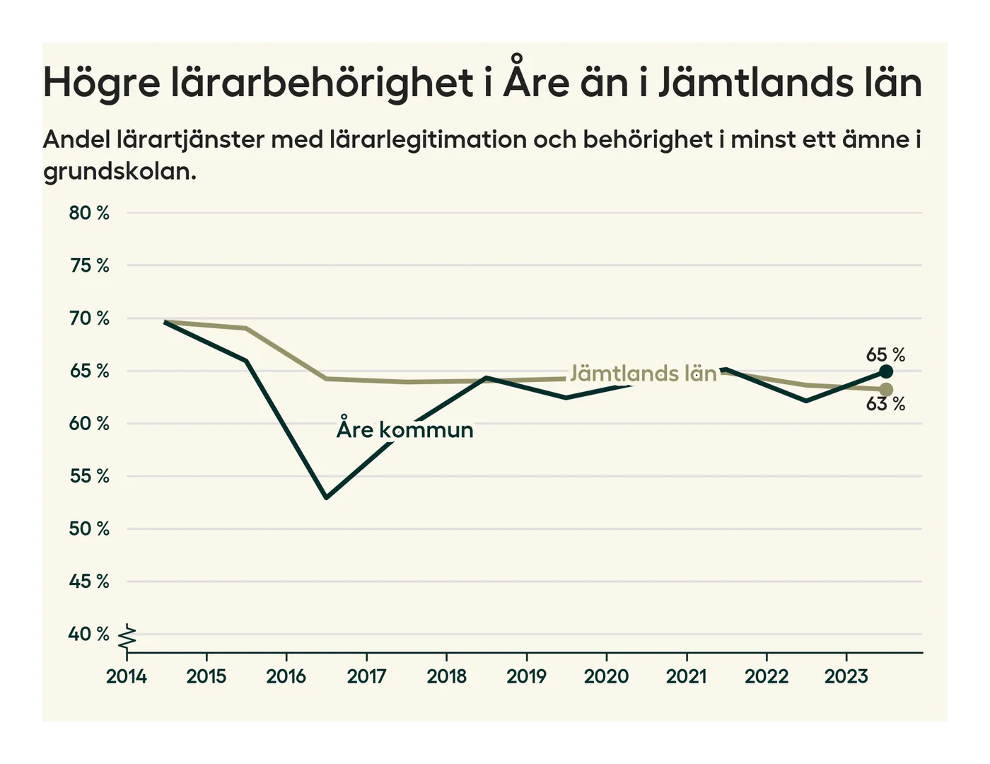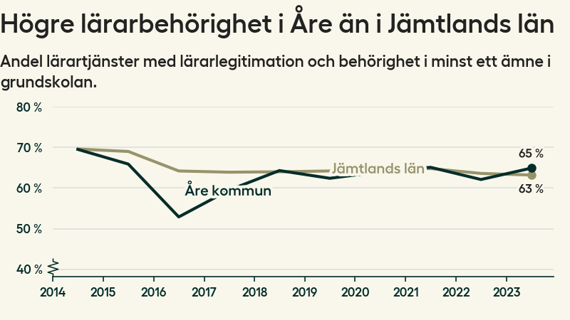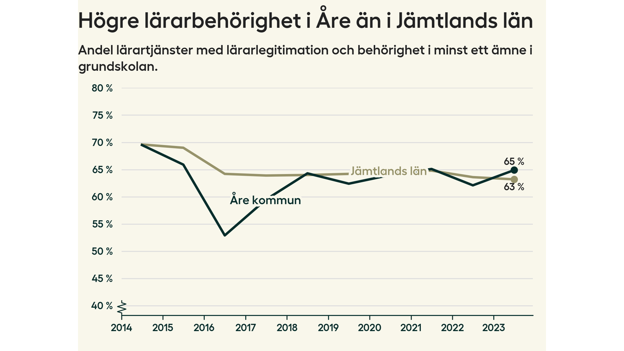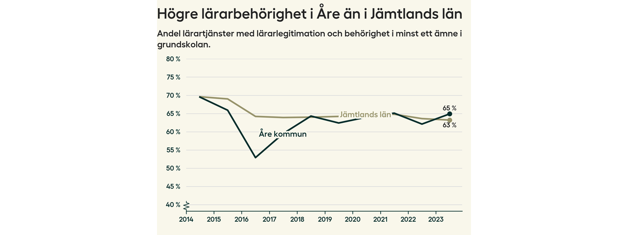I oktober 2023 hade motsvarande 65 procent av lärarna​​1 i grundskolan i Åre kommun lärarlegitimation och behörighet i minst ett ämne. Det är en ökning med tre procentenheter jämfört med året innan.