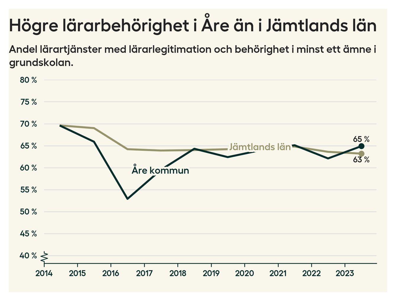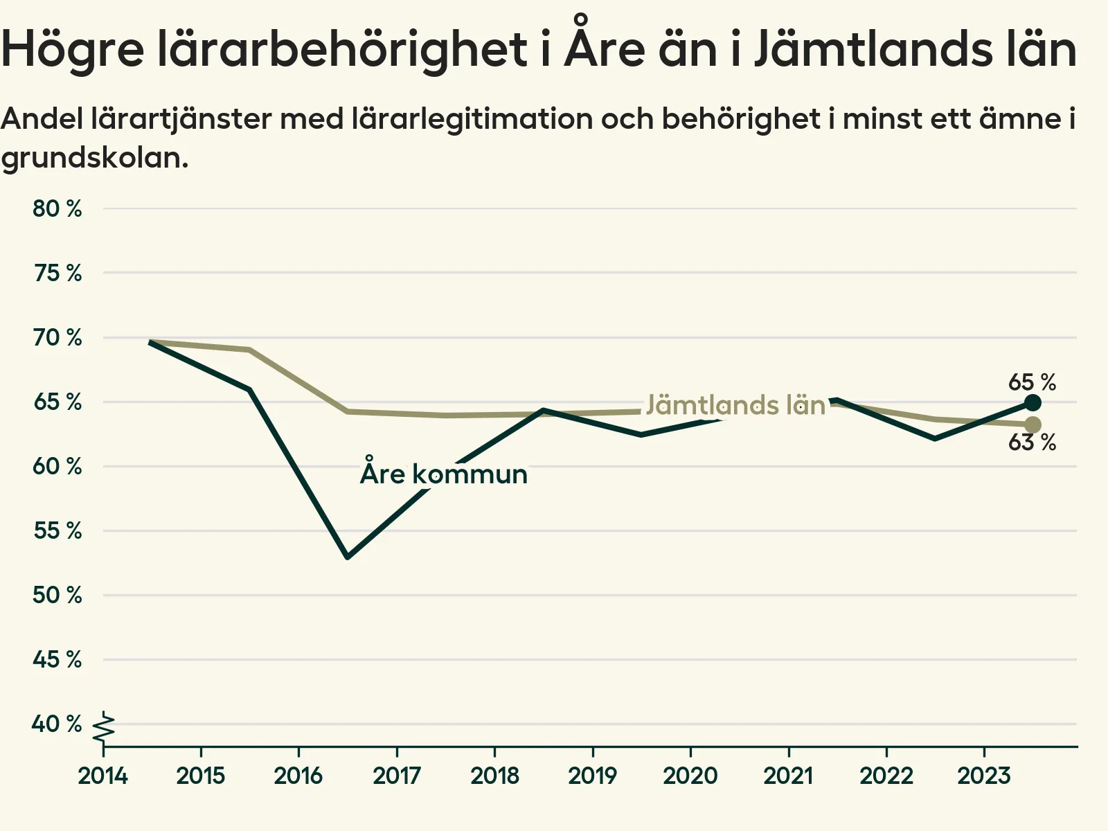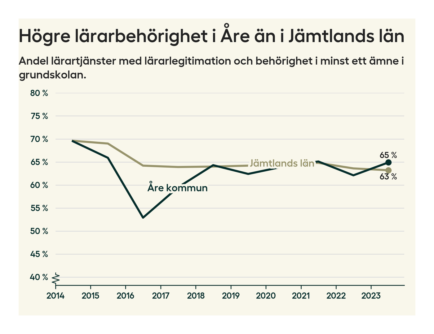 I oktober 2023 hade motsvarande 65 procent av lärarna​​1 i grundskolan i Åre kommun lärarlegitimation och behörighet i minst ett ämne. Det är en ökning med tre procentenheter jämfört med året innan.