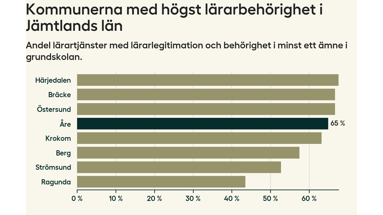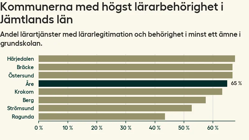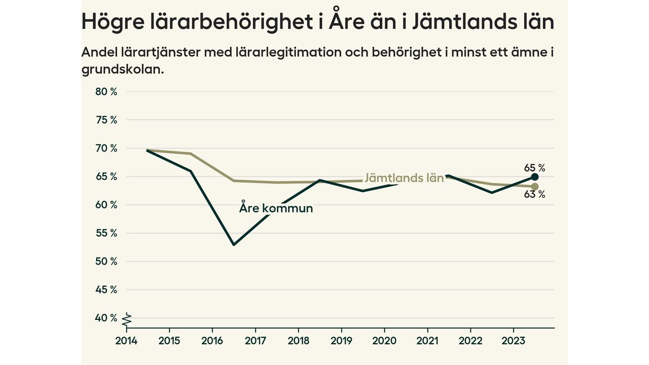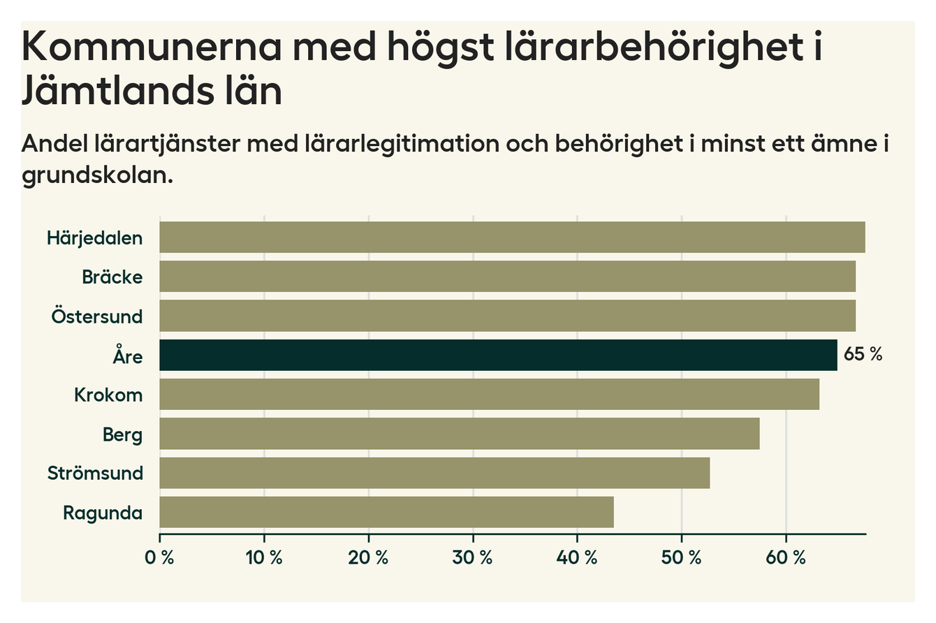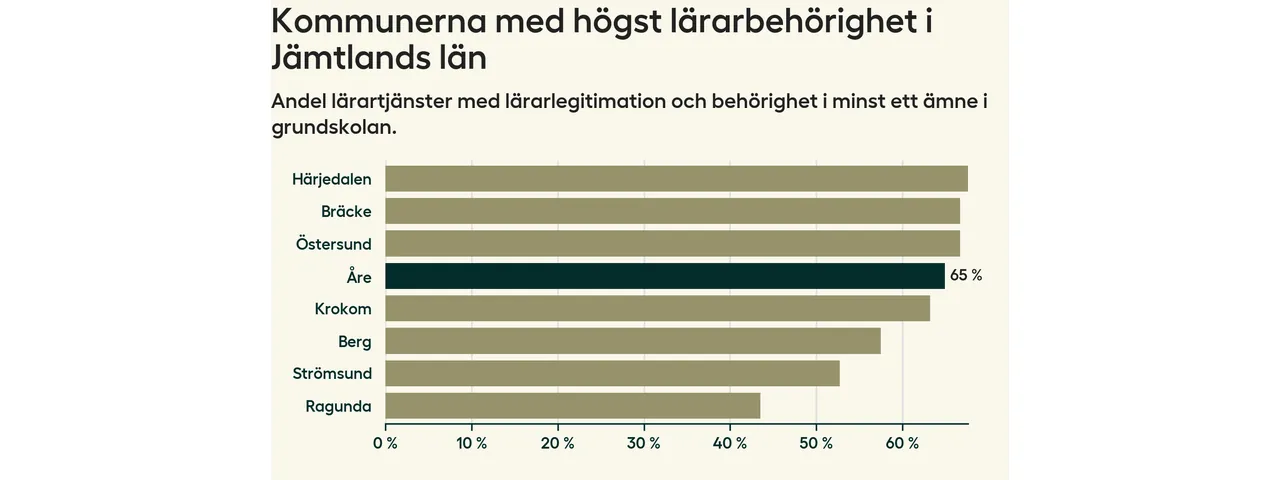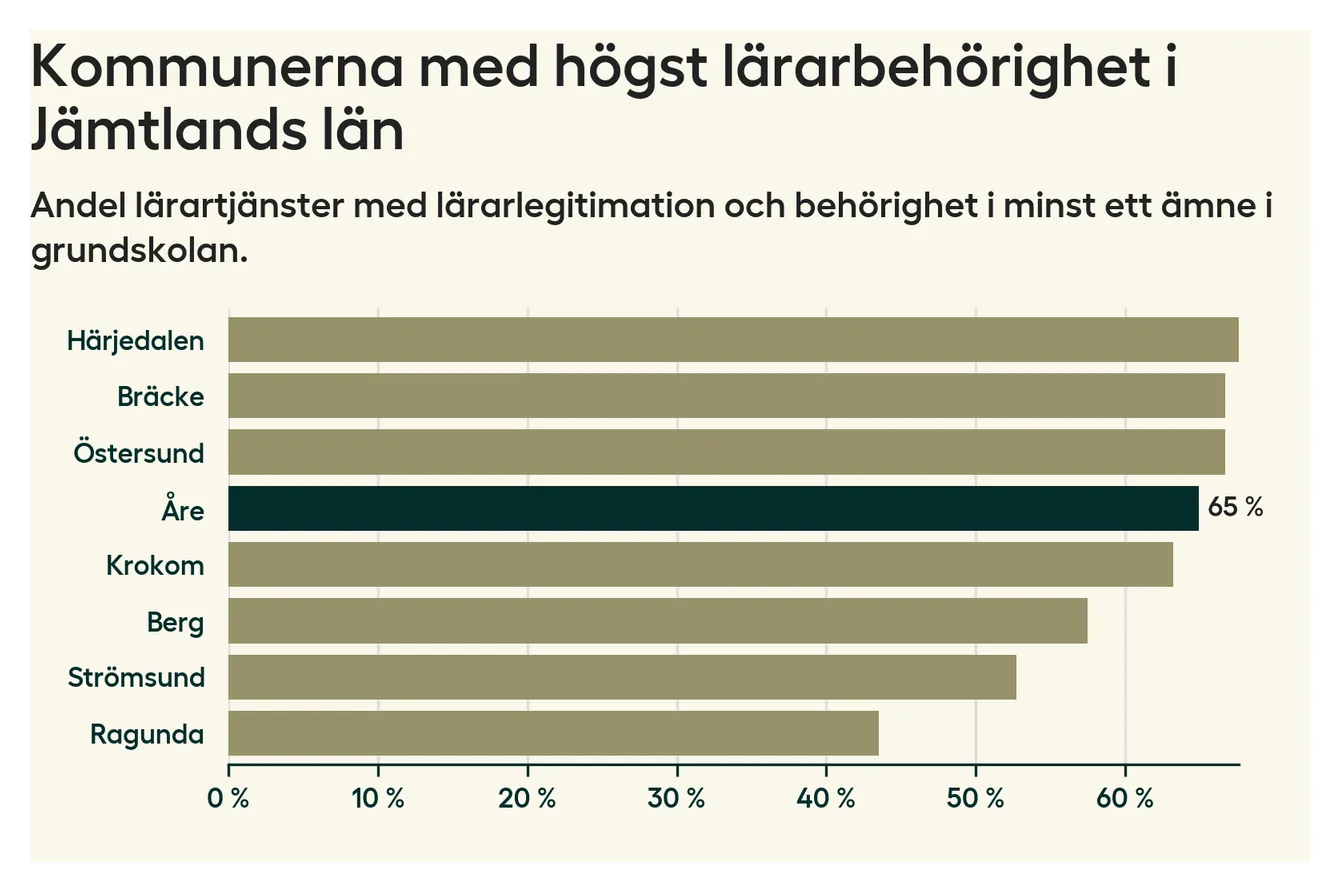 Av de sammanlagt 118 heltidstjänsterna i grundskolan i Åre kommun (motsvarande 133 lärare) var det 77 som hade lärarlegitimation och behörighet i minst ett ämne.