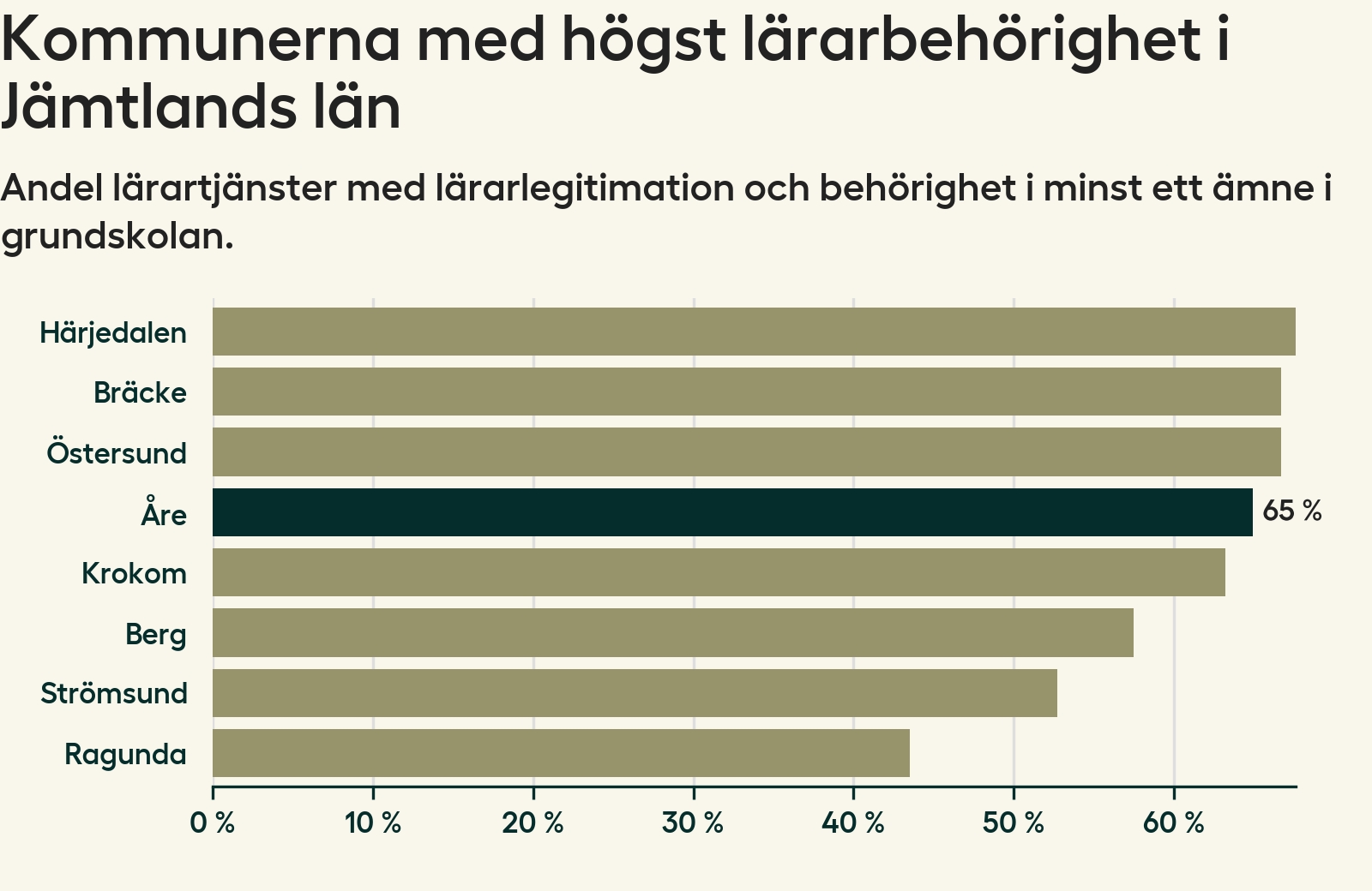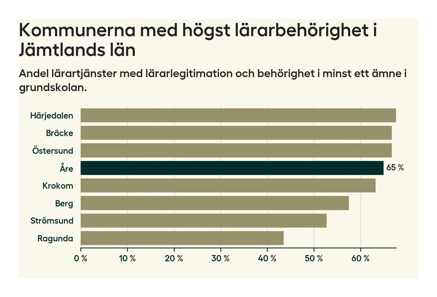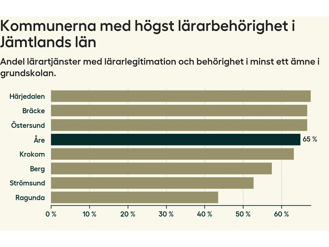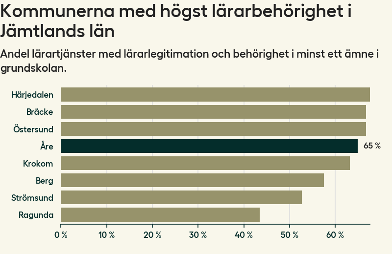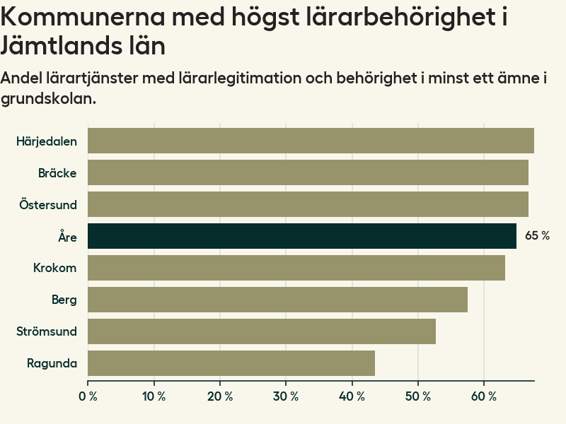 Av de sammanlagt 118 heltidstjänsterna i grundskolan i Åre kommun (motsvarande 133 lärare) var det 77 som hade lärarlegitimation och behörighet i minst ett ämne.