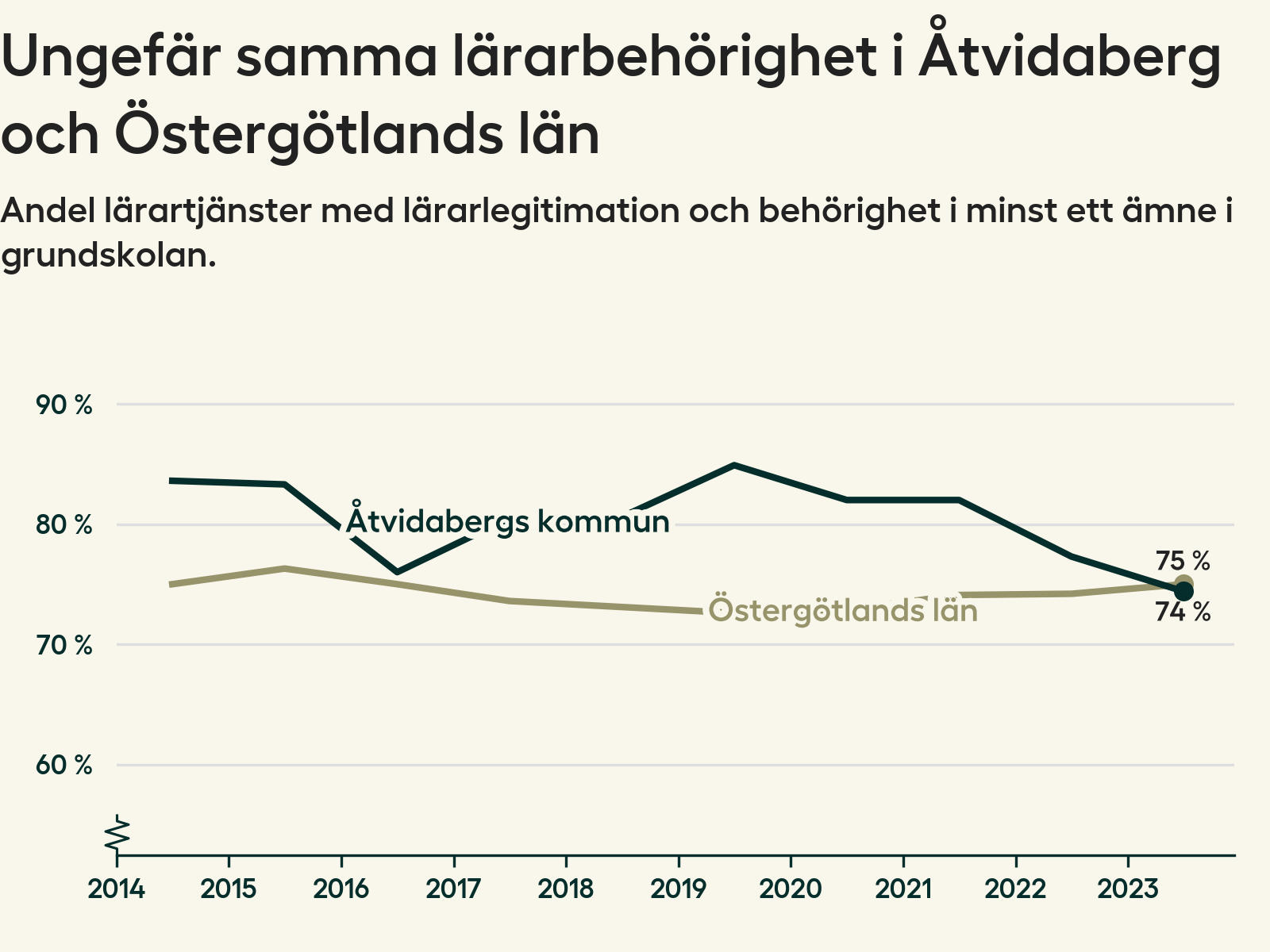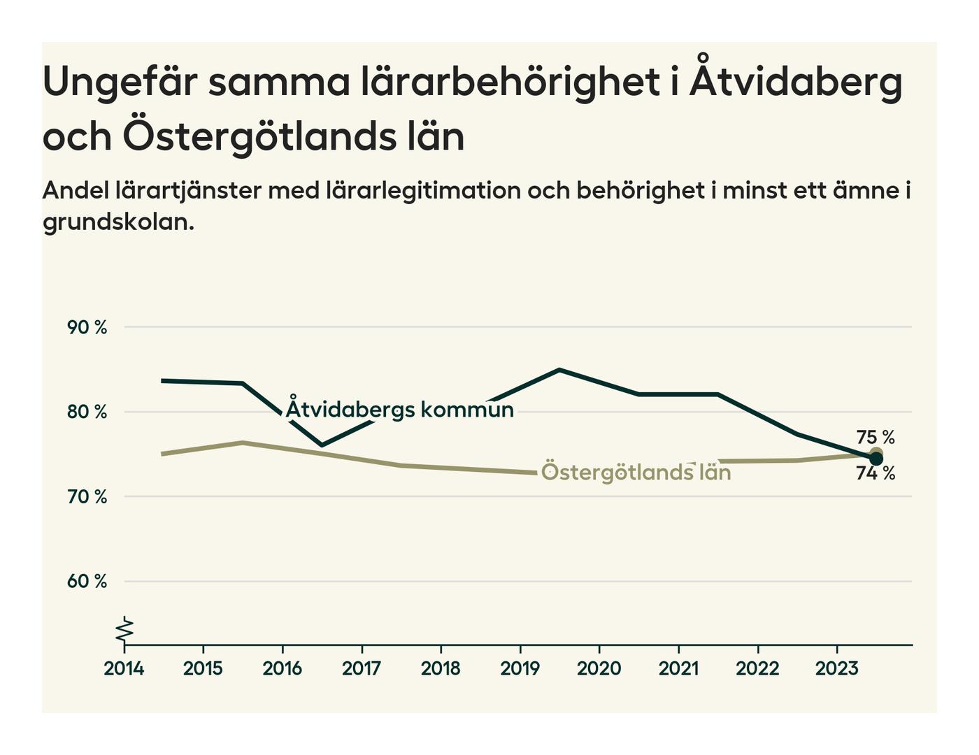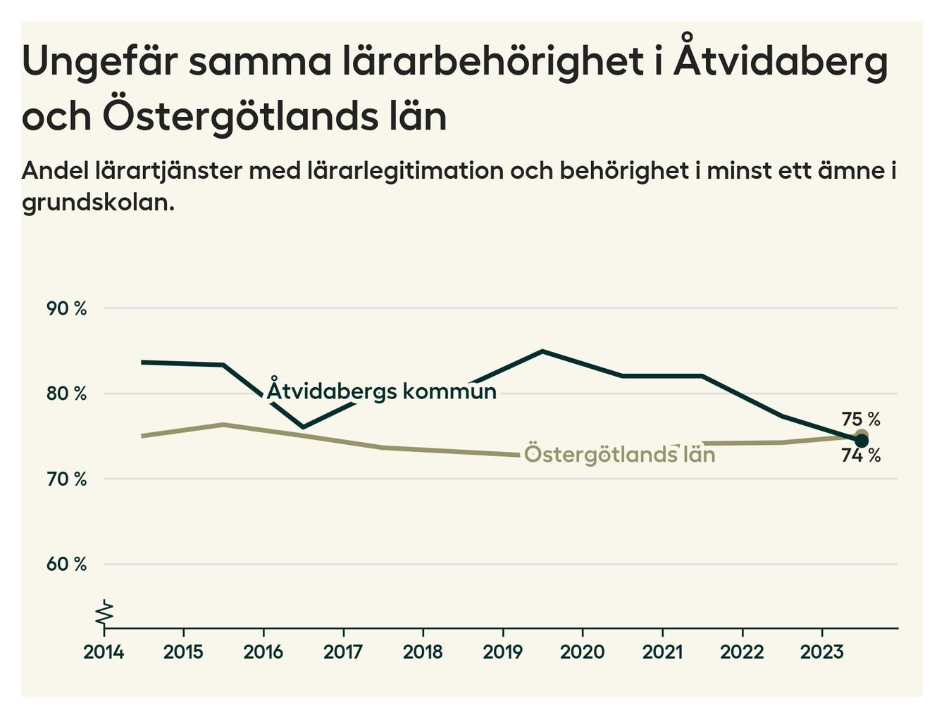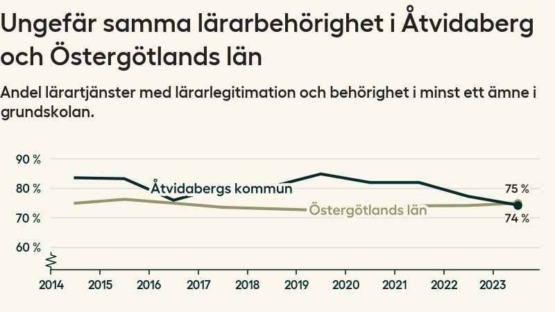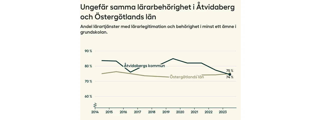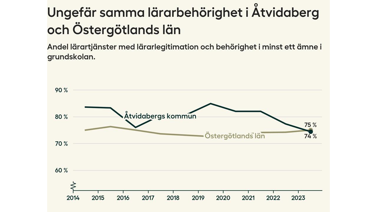 I oktober 2023 hade motsvarande 74 procent av lärarna1 i grundskolan i Åtvidabergs kommun lärarlegitimation och behörighet i minst ett ämne. Det är en minskning med tre procentenheter jämfört med året innan och den lägsta nivån som noterats sedan 2014.