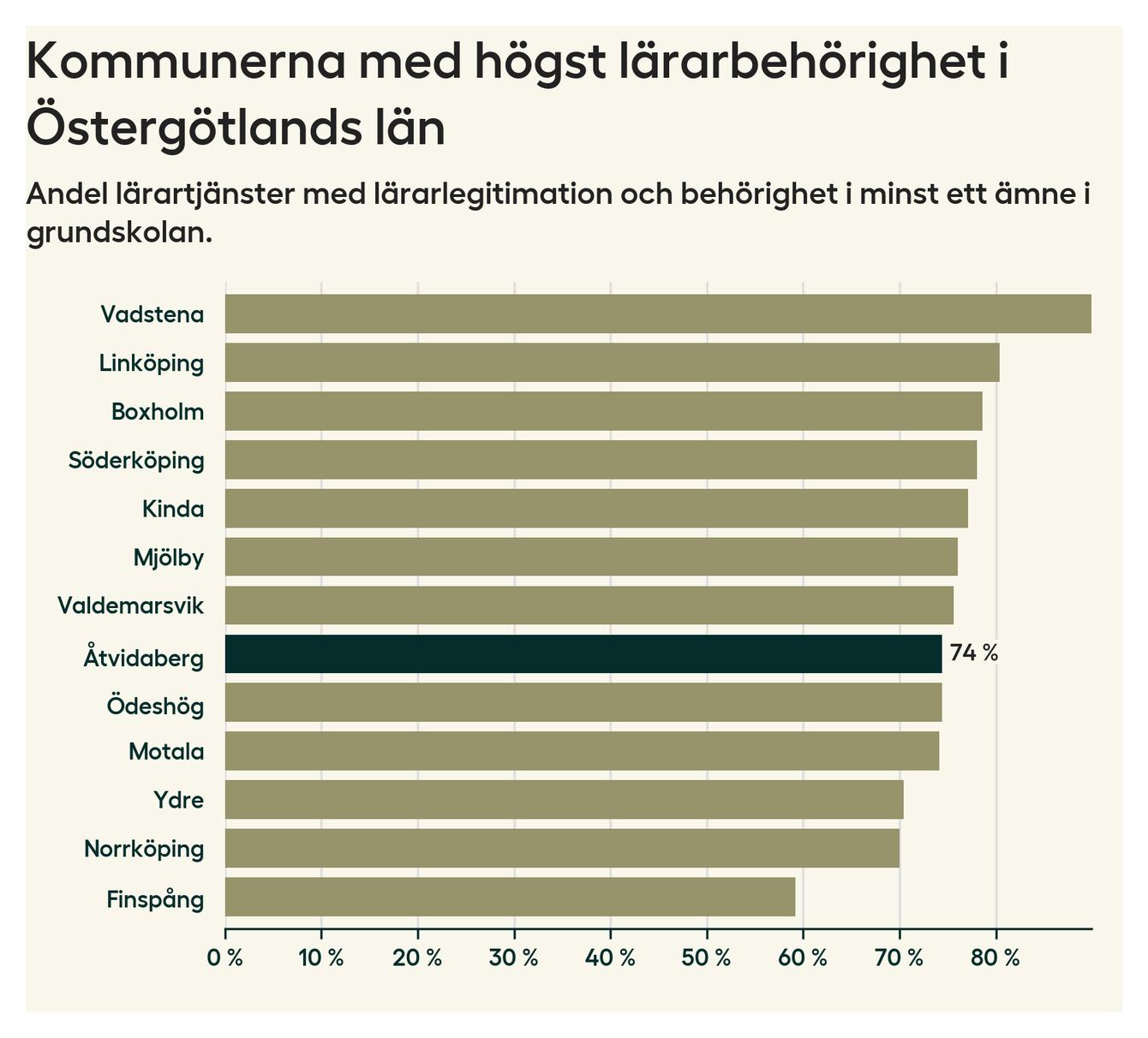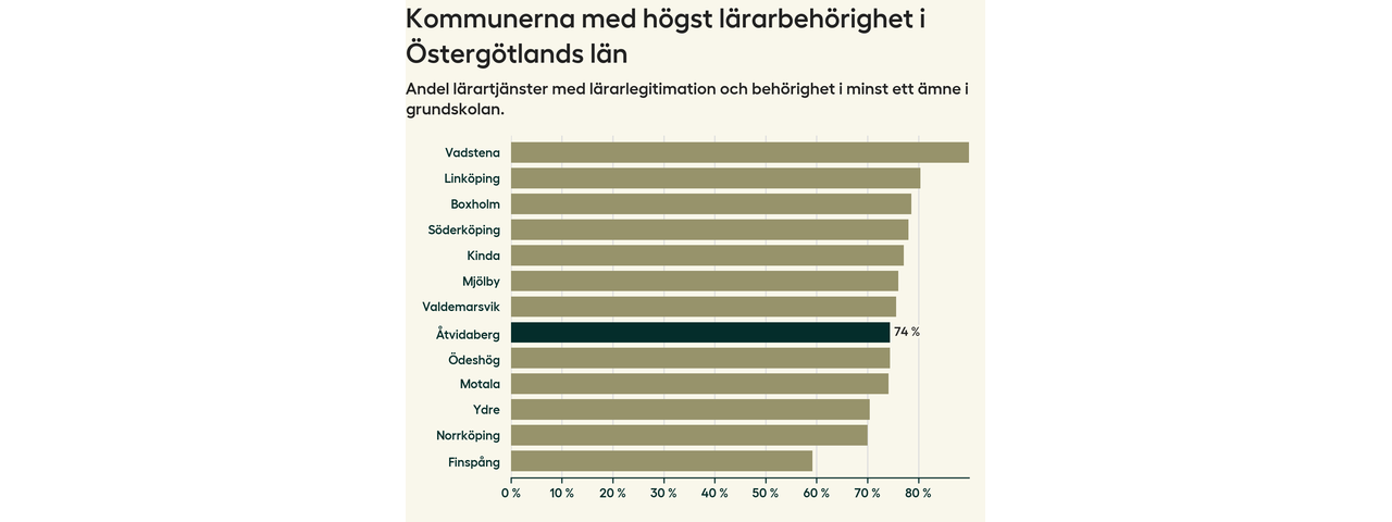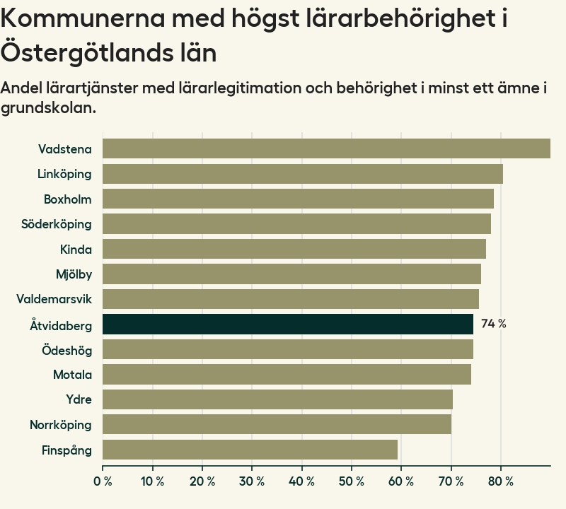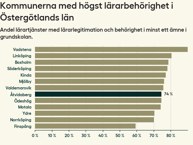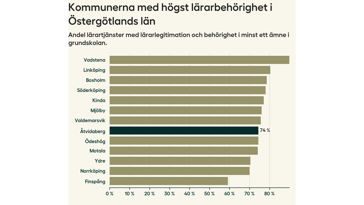 Av de sammanlagt 99 heltidstjänsterna i grundskolan i Åtvidabergs kommun (motsvarande 108 lärare) var det 73 som hade lärarlegitimation och behörighet i minst ett ämne.