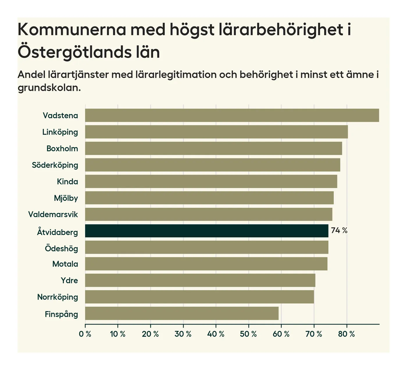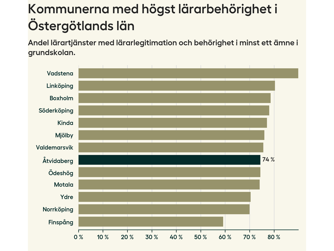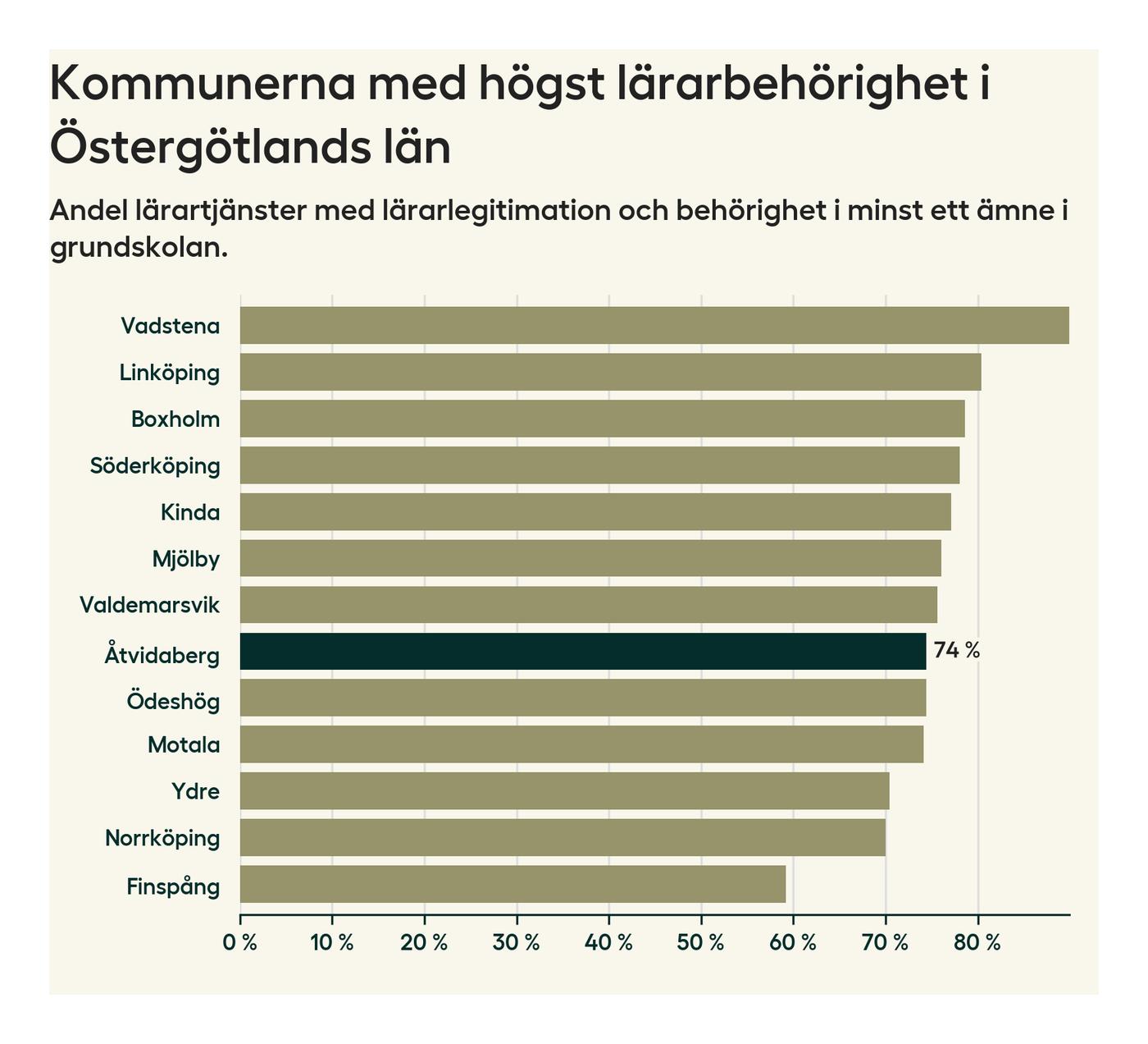 Av de sammanlagt 99 heltidstjänsterna i grundskolan i Åtvidabergs kommun (motsvarande 108 lärare) var det 73 som hade lärarlegitimation och behörighet i minst ett ämne.
