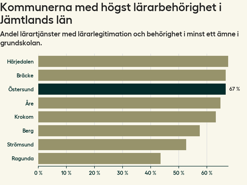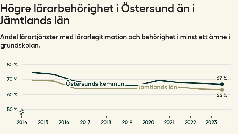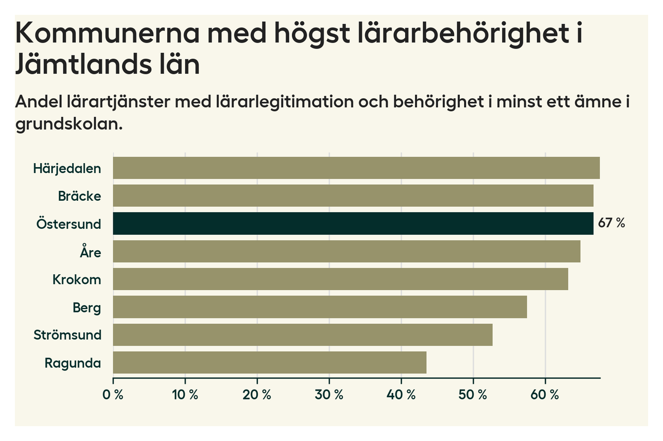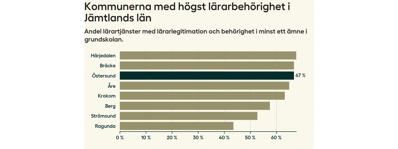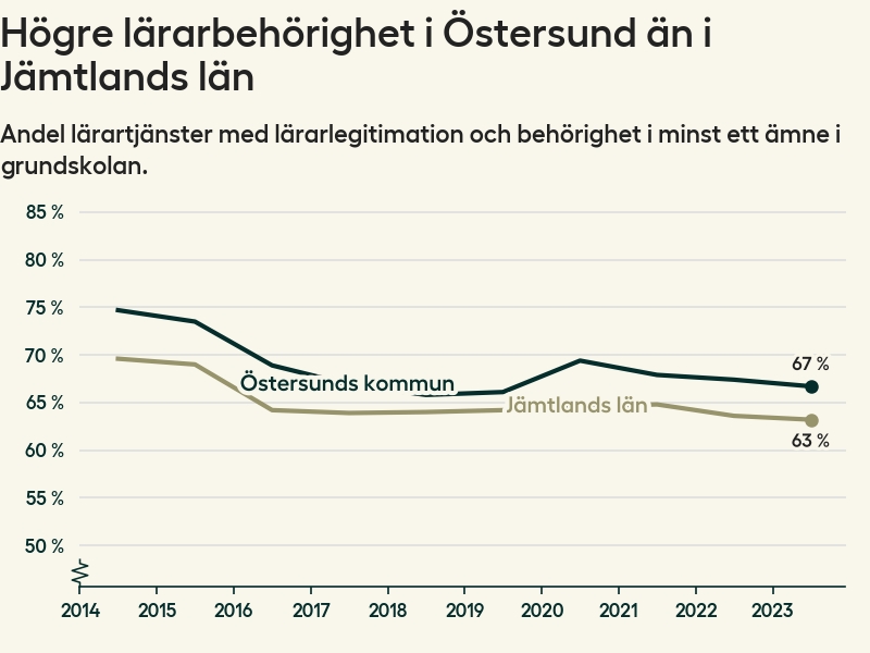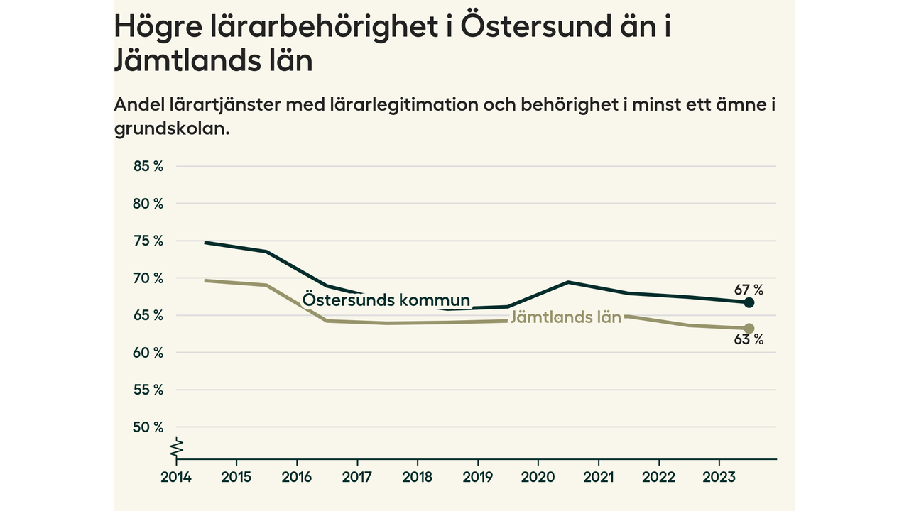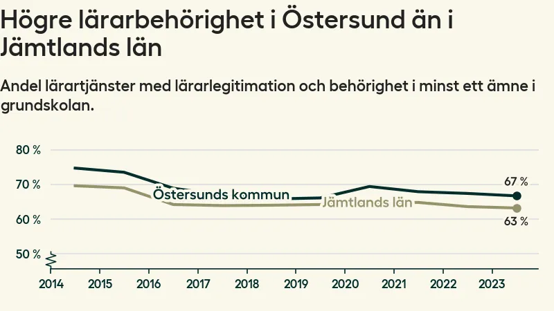 I oktober 2023 hade motsvarande 67 procent av lärarna1 i grundskolan i Östersunds kommun lärarlegitimation och behörighet i minst ett ämne.