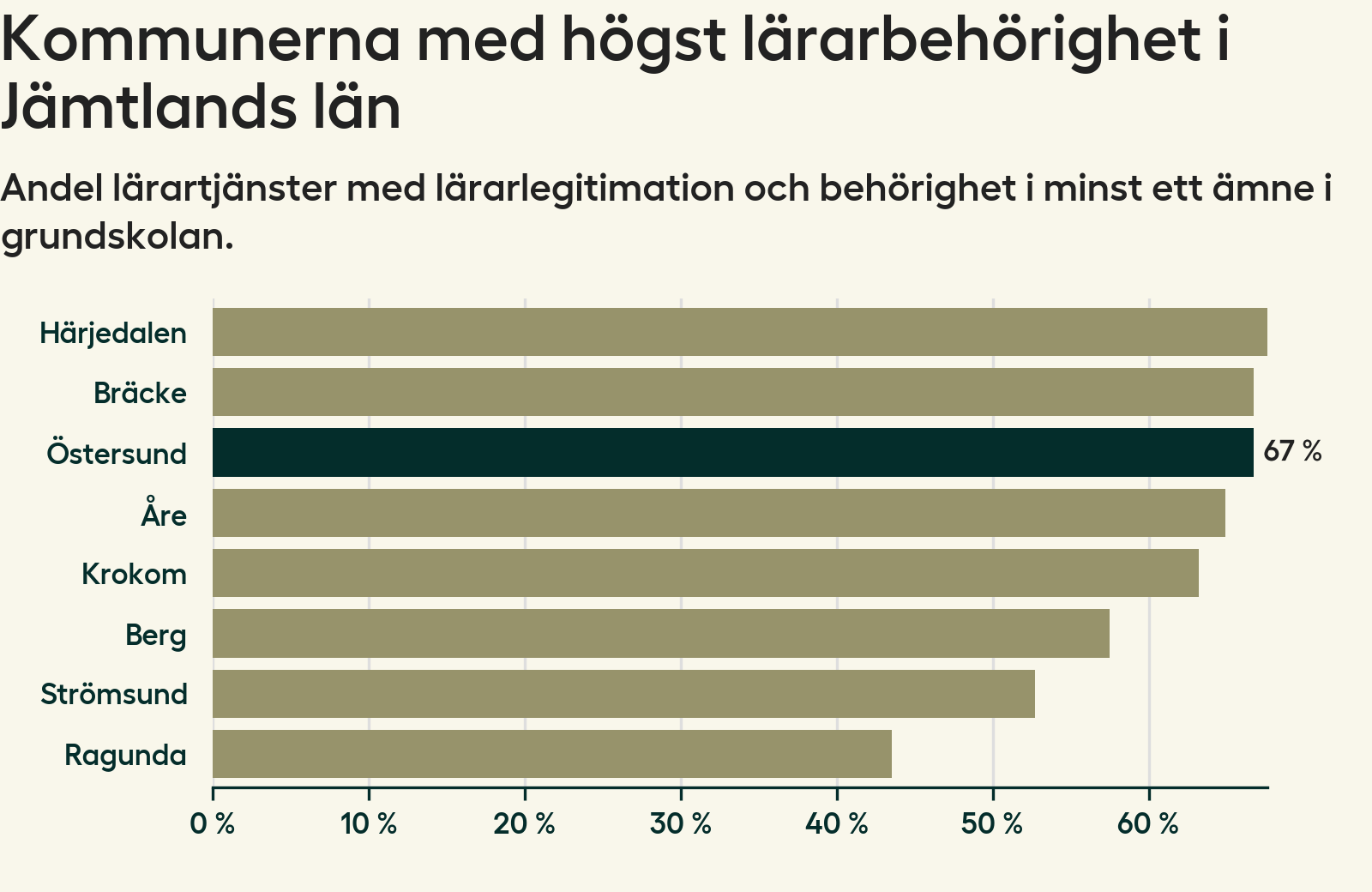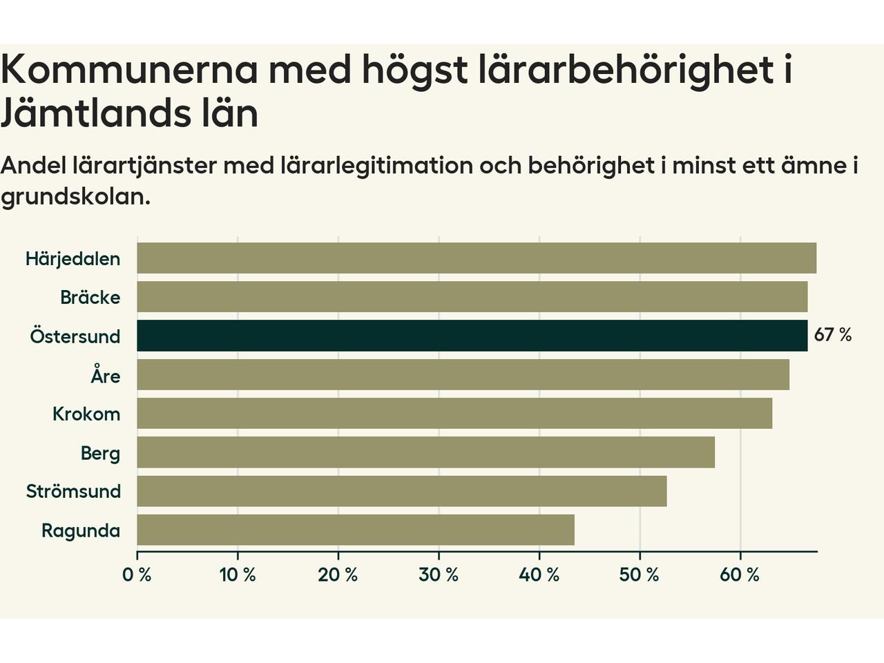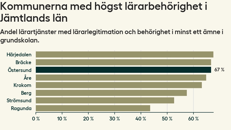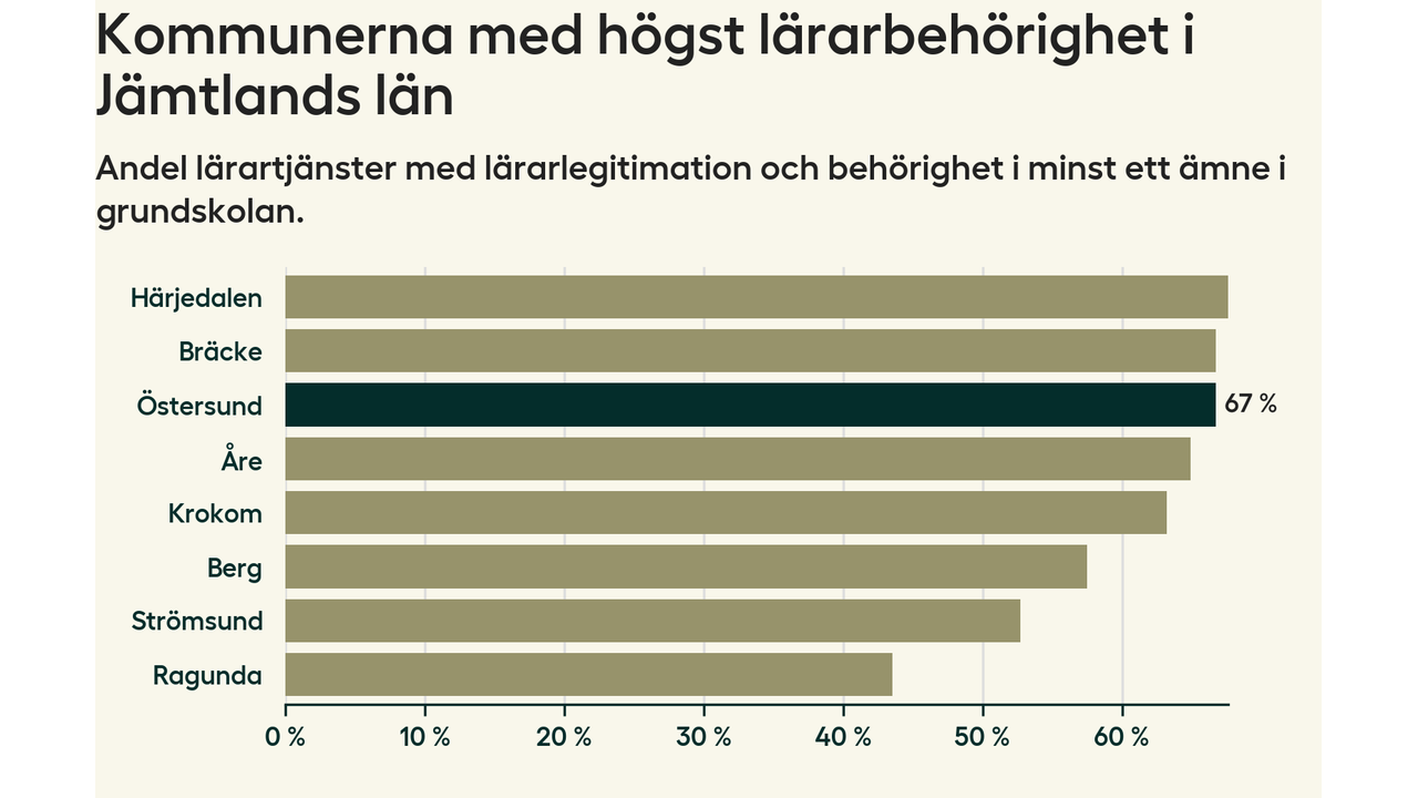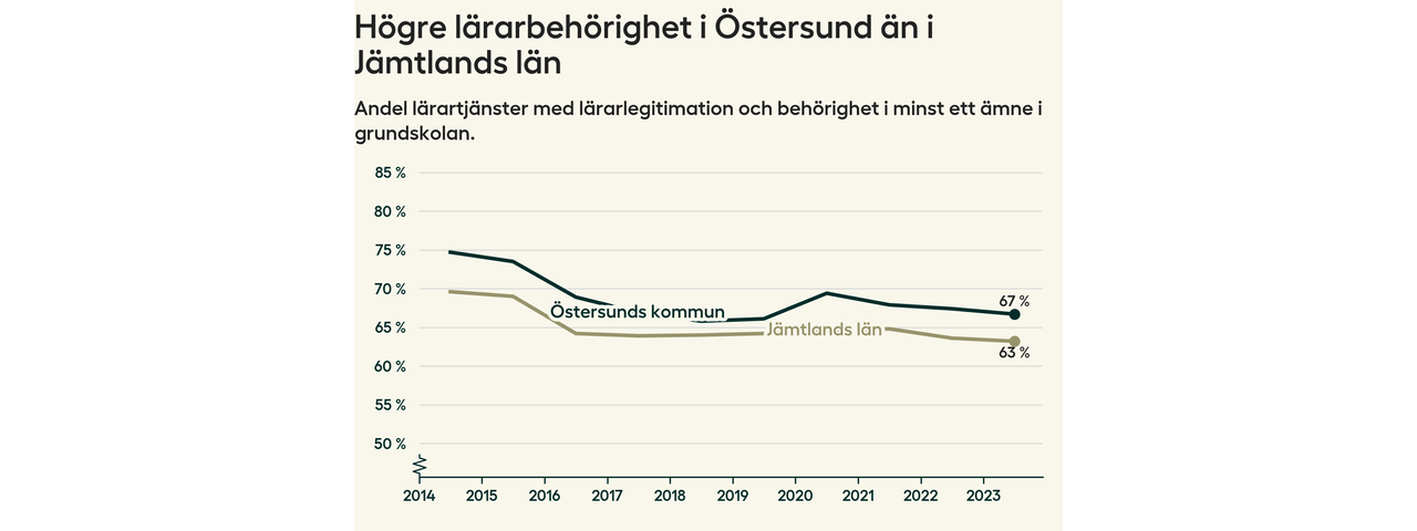 I oktober 2023 hade motsvarande 67 procent av lärarna1 i grundskolan i Östersunds kommun lärarlegitimation och behörighet i minst ett ämne.