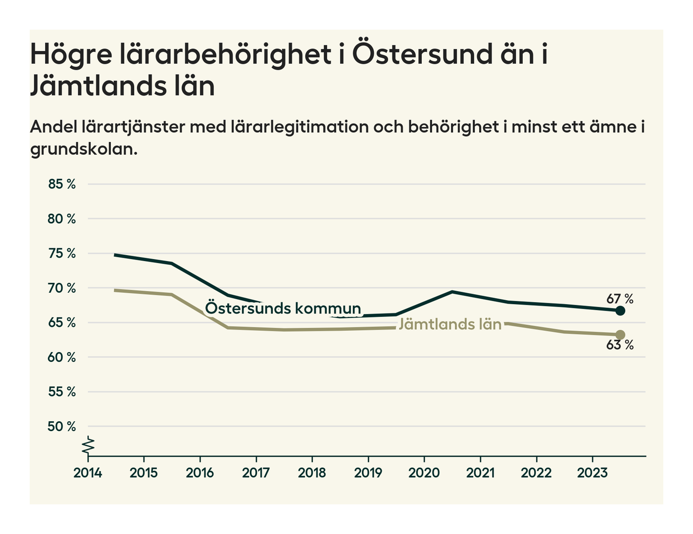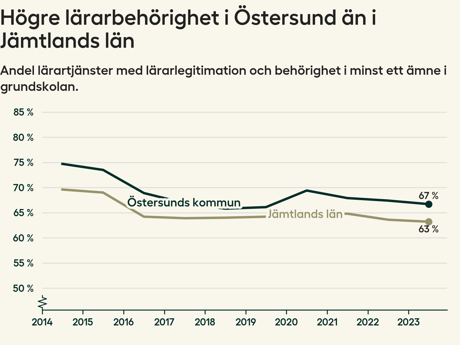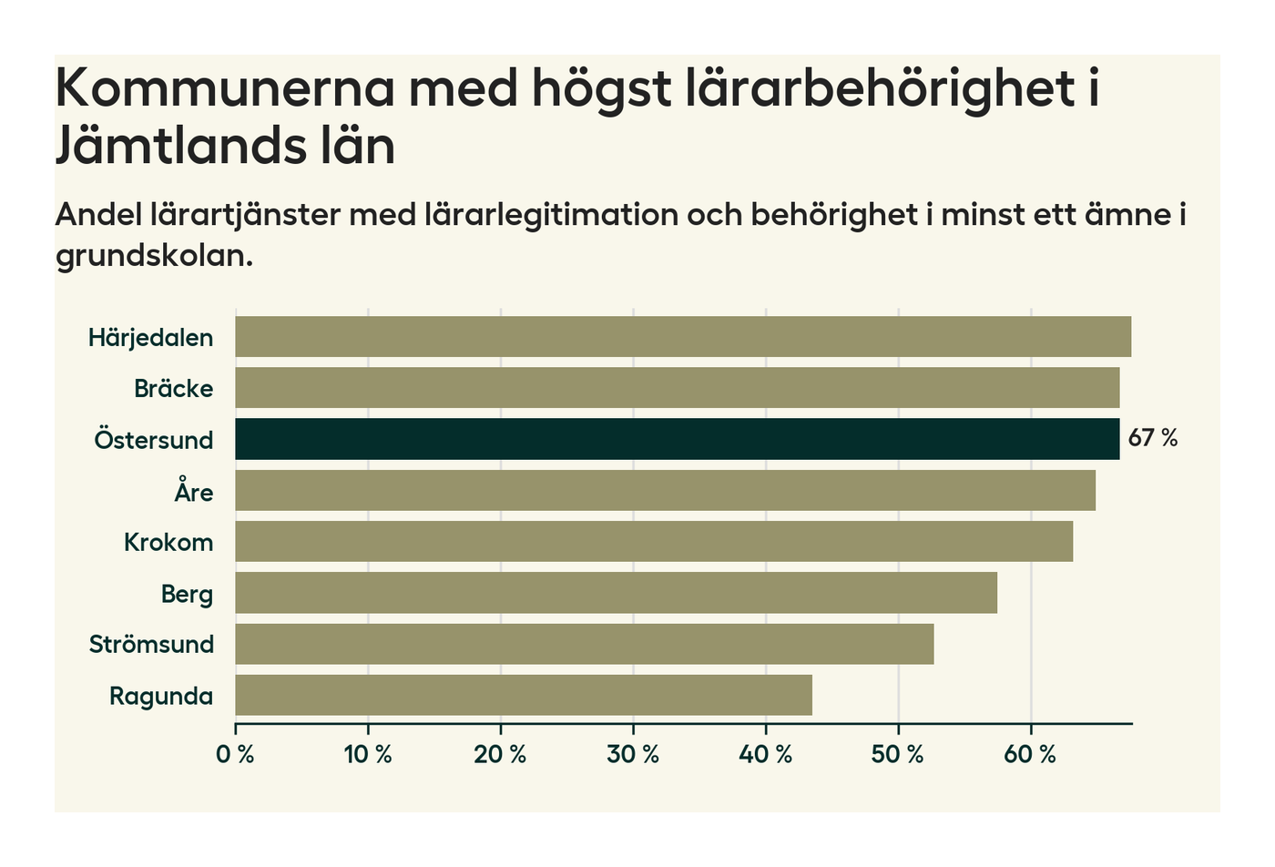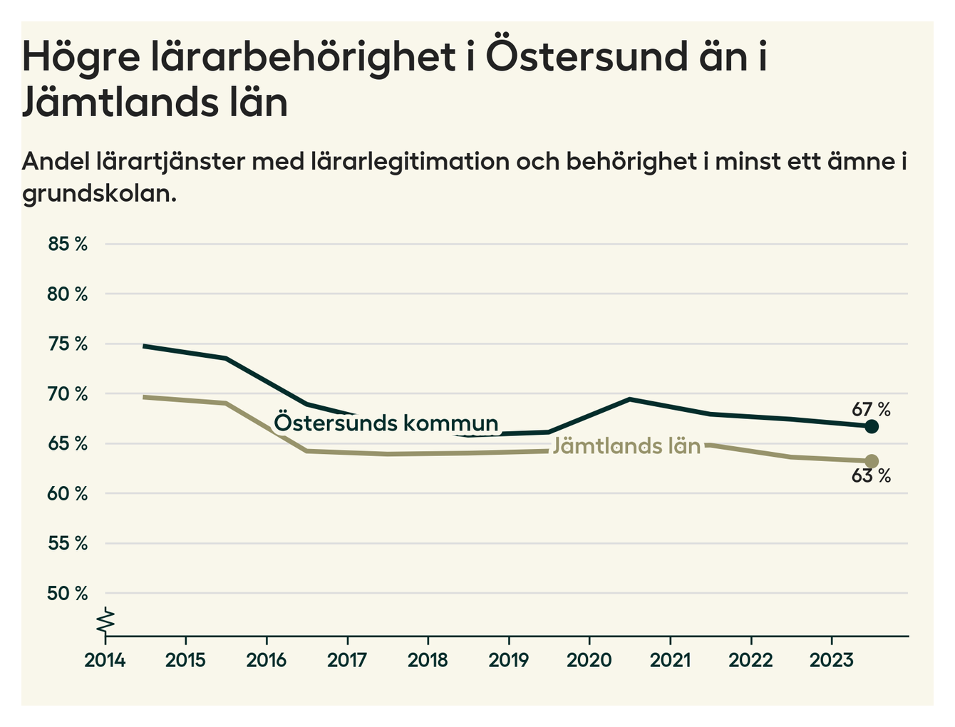 I oktober 2023 hade motsvarande 67 procent av lärarna1 i grundskolan i Östersunds kommun lärarlegitimation och behörighet i minst ett ämne.