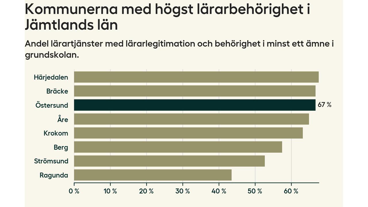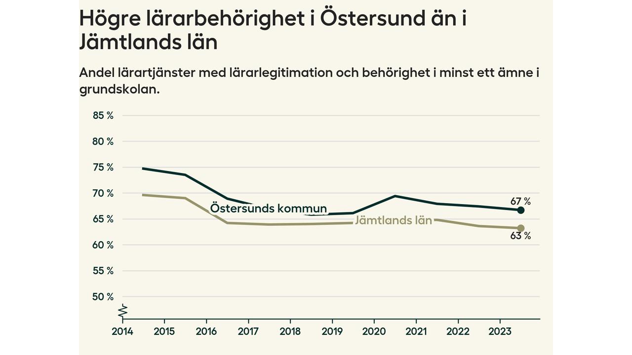 Lärarbehörigheten i Östersunds kommun ligger kvar på 67 procent, vilket är under snittet för hela landet.