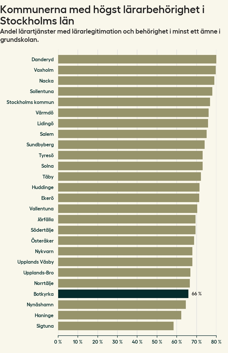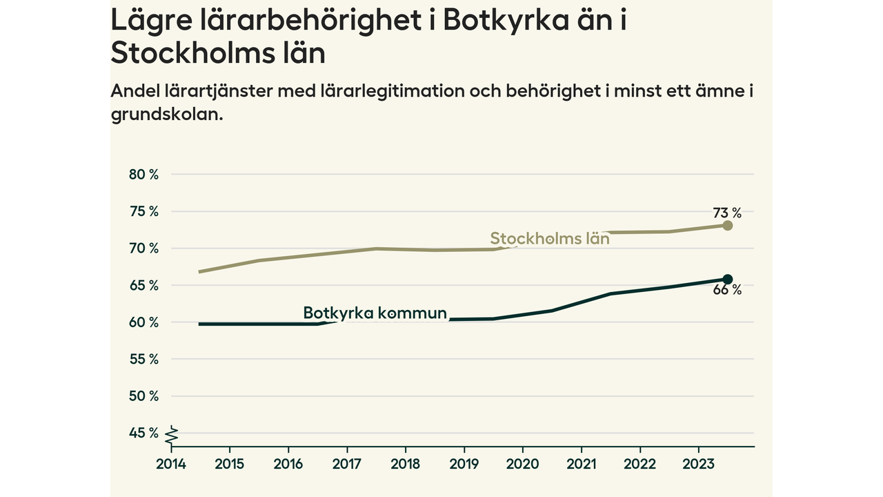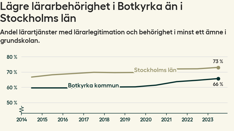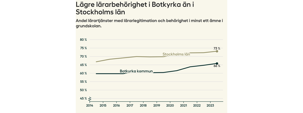 I oktober 2023 hade motsvarande 66 procent av lärarna1 i grundskolan i Botkyrka kommun lärarlegitimation och behörighet i minst ett ämne. Det är en ökning med en procentenhet jämfört med året innan och den högsta nivån som noterats sedan 2014.