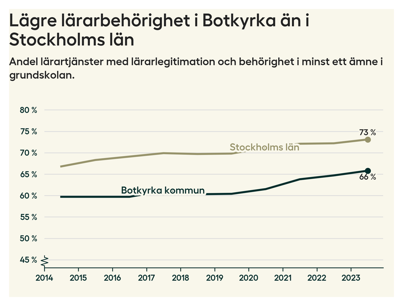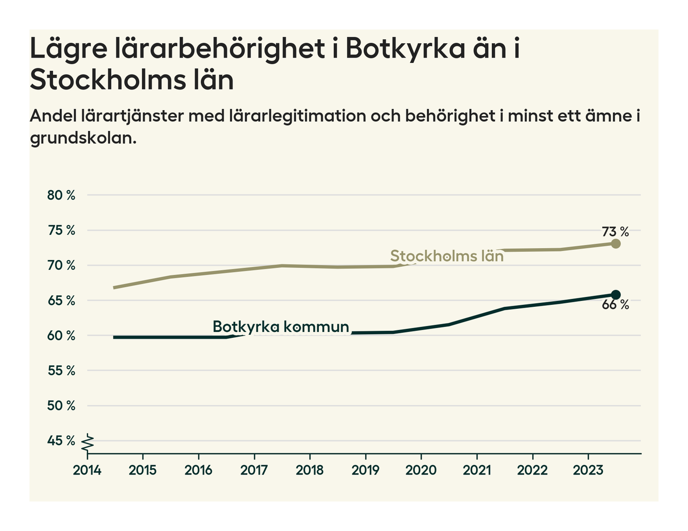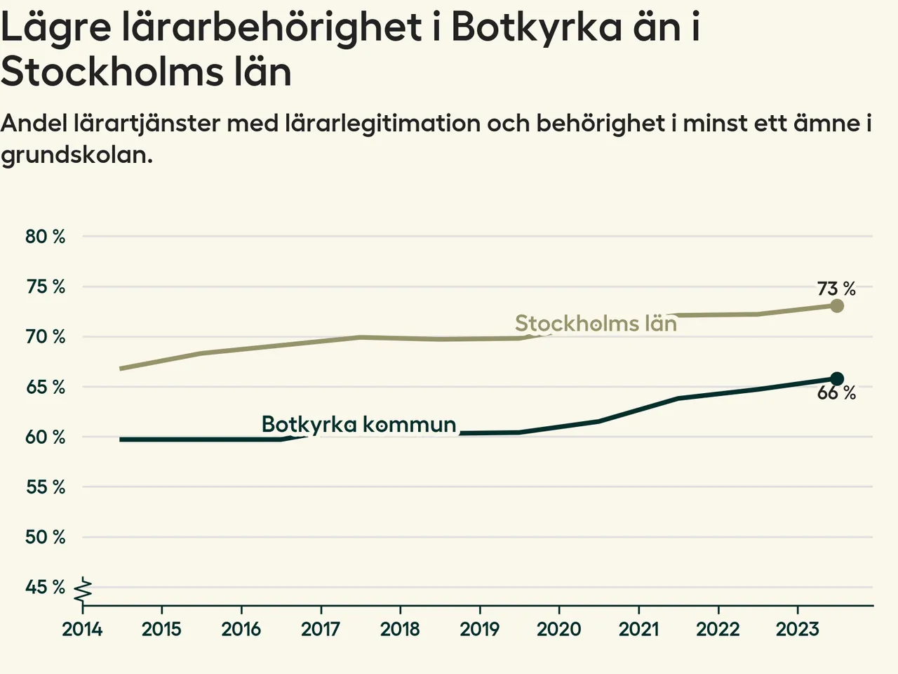 I oktober 2023 hade motsvarande 66 procent av lärarna1 i grundskolan i Botkyrka kommun lärarlegitimation och behörighet i minst ett ämne. Det är en ökning med en procentenhet jämfört med året innan och den högsta nivån som noterats sedan 2014.