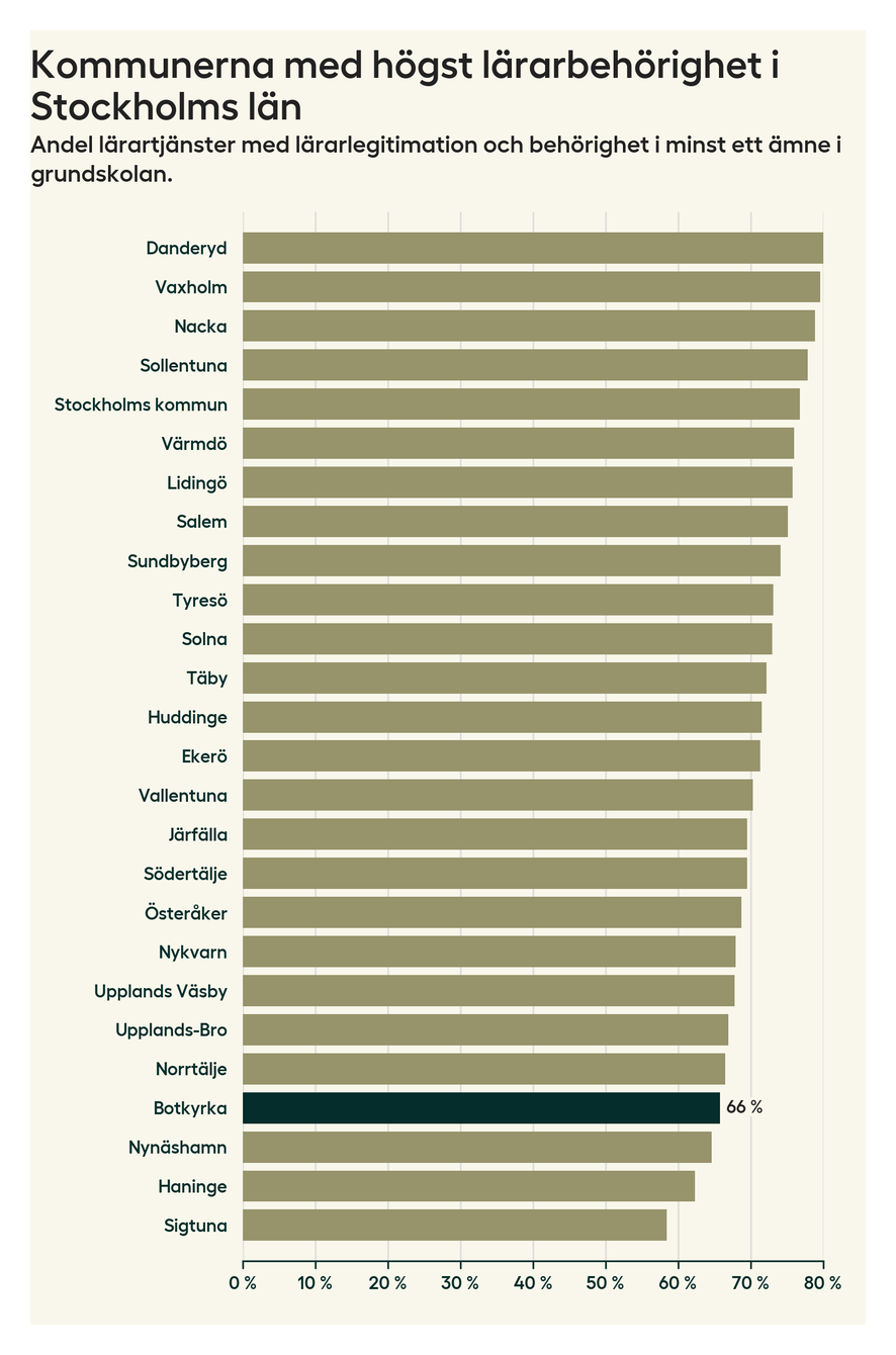 Av de sammanlagt 666 heltidstjänsterna i grundskolan i Botkyrka kommun (motsvarande 717 lärare) var det 438 som hade lärarlegitimation och behörighet i minst ett ämne.