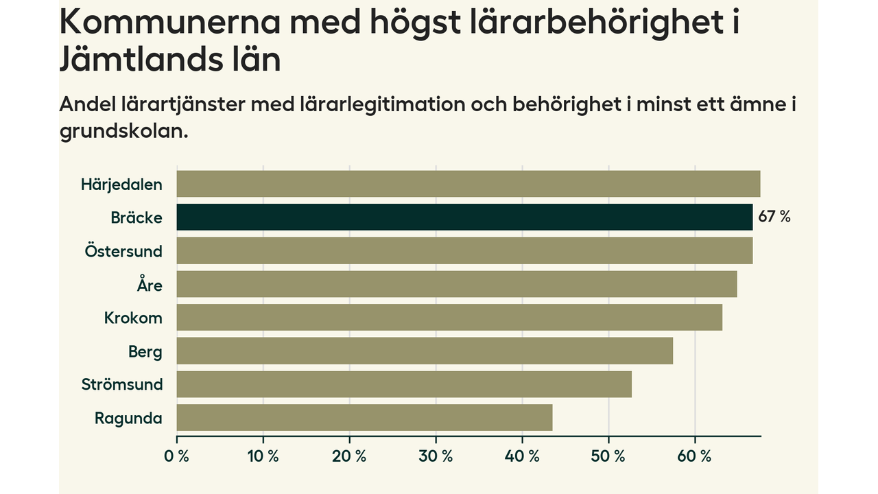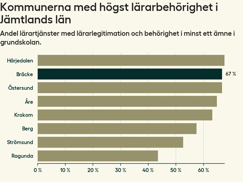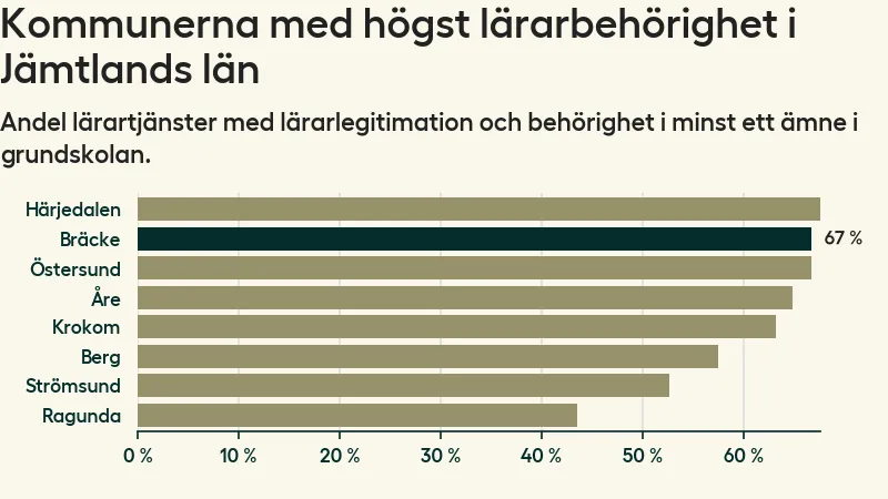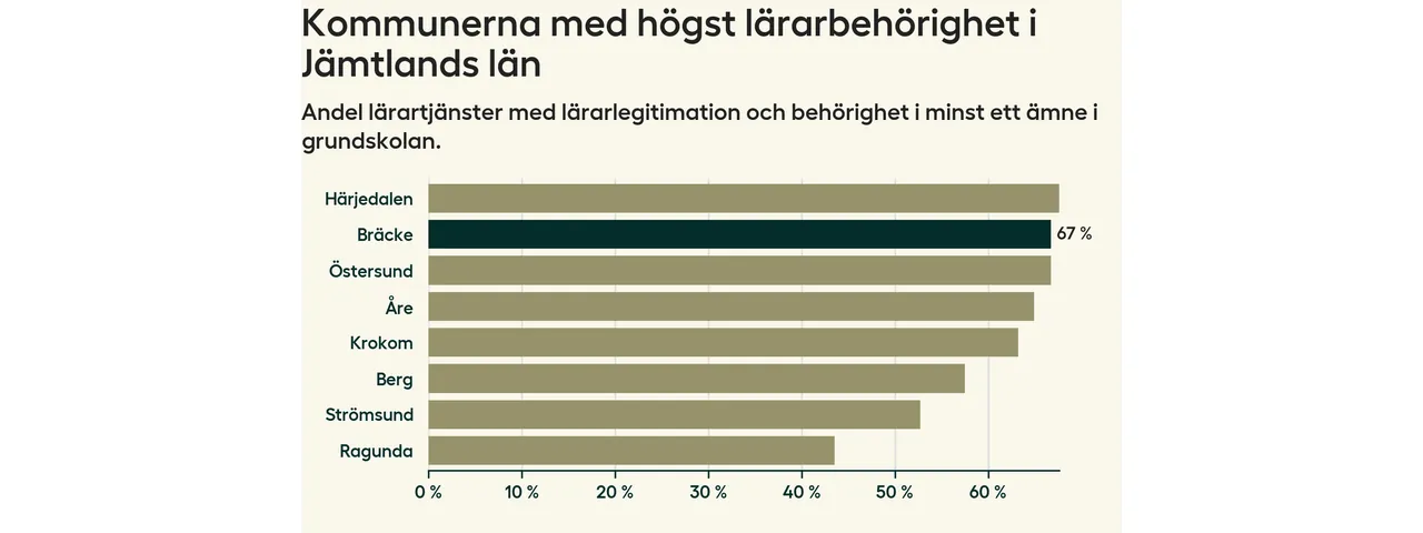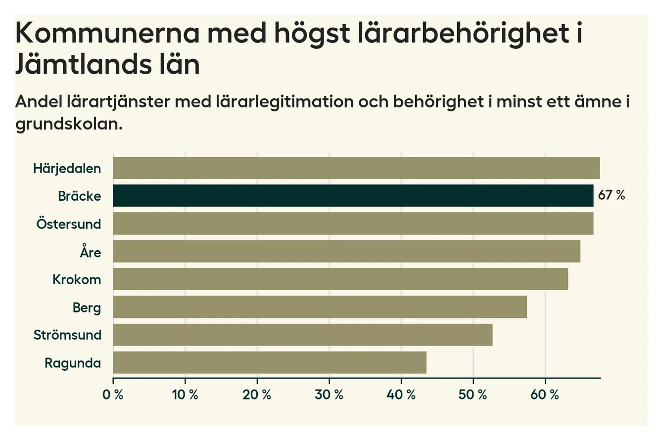 Av de sammanlagt 57 heltidstjänsterna i grundskolan i Bräcke kommun (motsvarande 73 lärare) var det 38 som hade lärarlegitimation och behörighet i minst ett ämne.