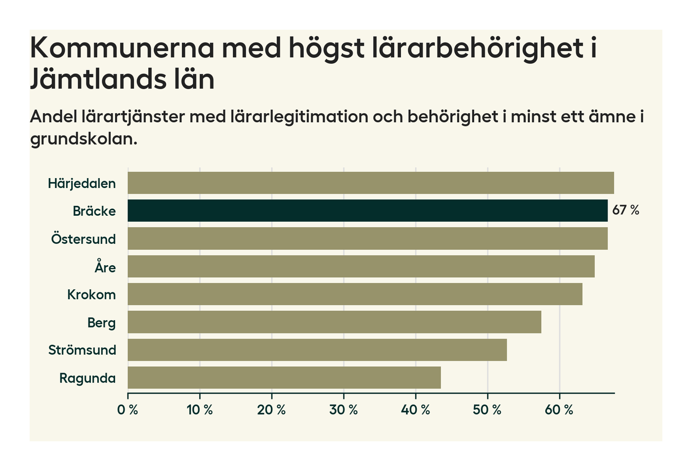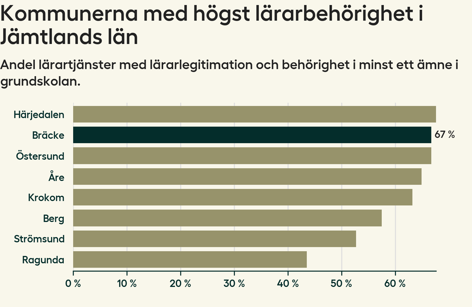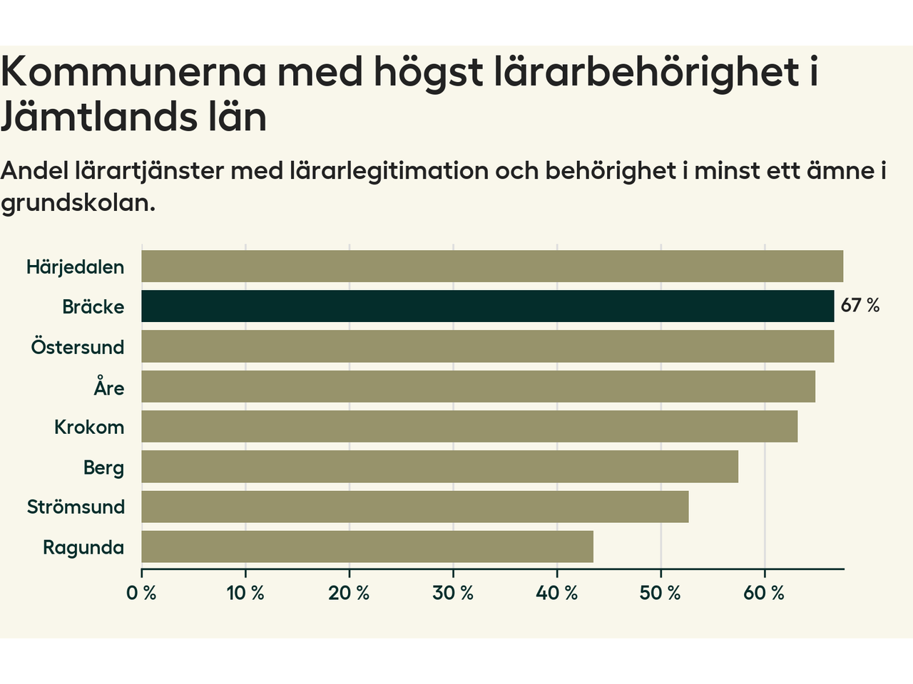 Av de sammanlagt 57 heltidstjänsterna i grundskolan i Bräcke kommun (motsvarande 73 lärare) var det 38 som hade lärarlegitimation och behörighet i minst ett ämne.
