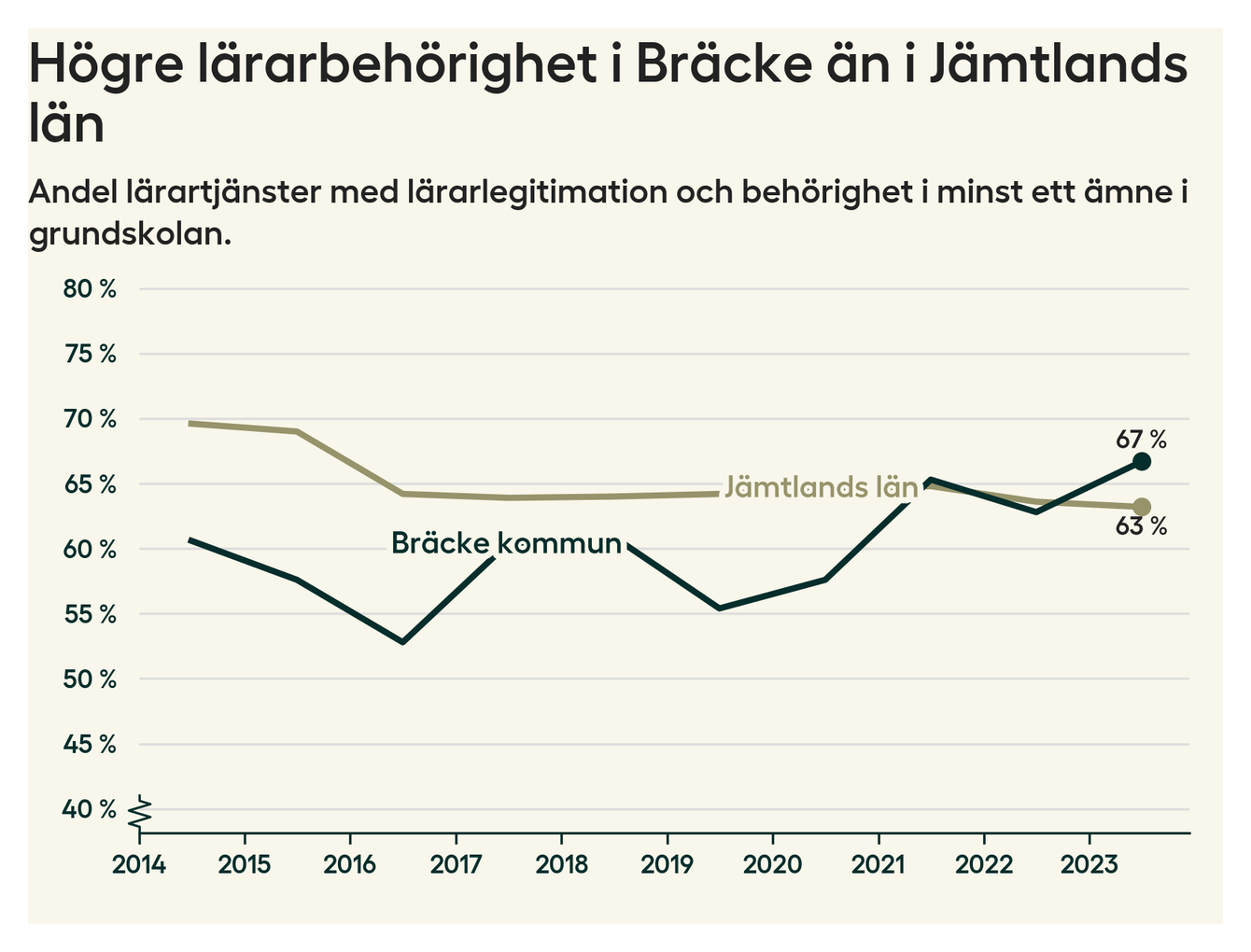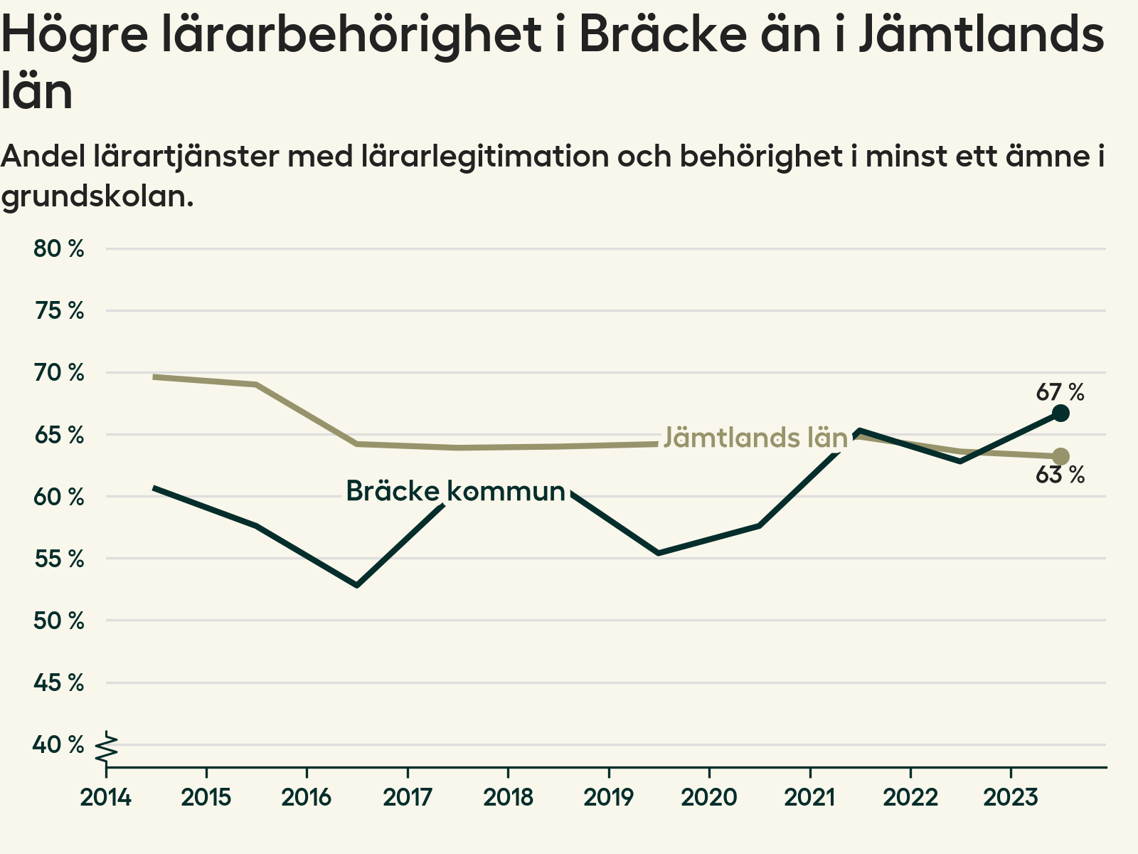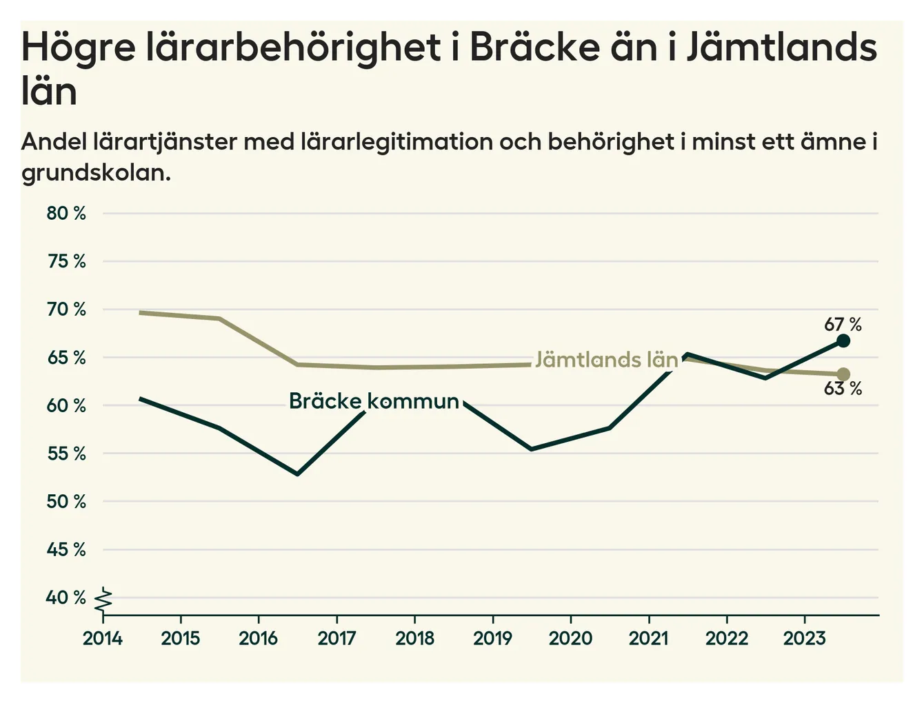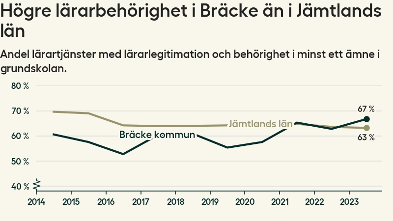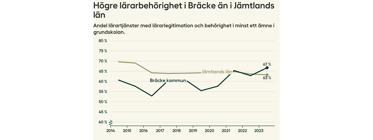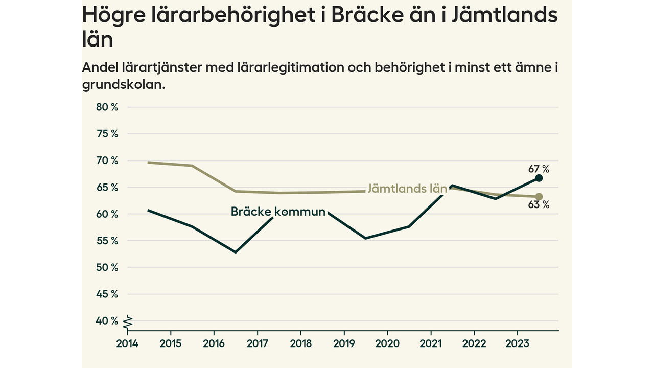 I oktober 2023 hade motsvarande 67 procent av lärarna1 i grundskolan i Bräcke kommun lärarlegitimation och behörighet i minst ett ämne. Det är en ökning med fyra procentenheter jämfört med året innan och den högsta nivån som noterats sedan 2014.