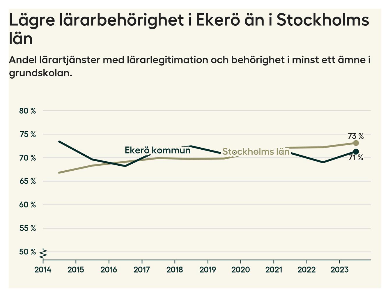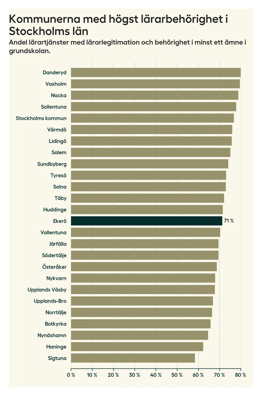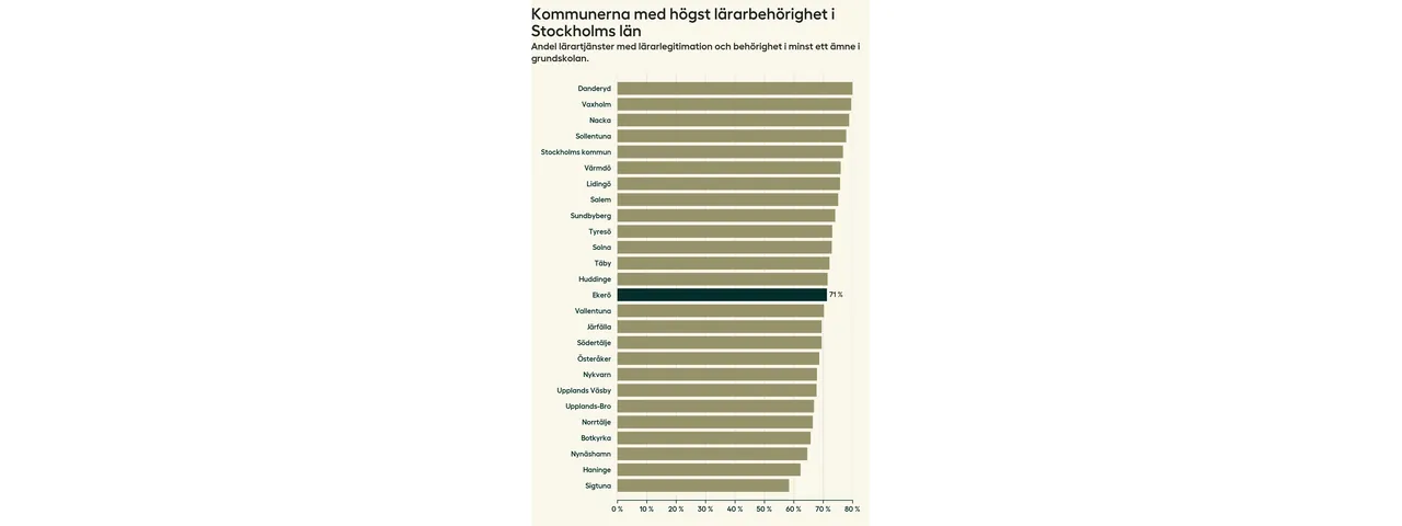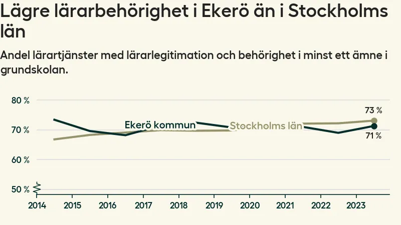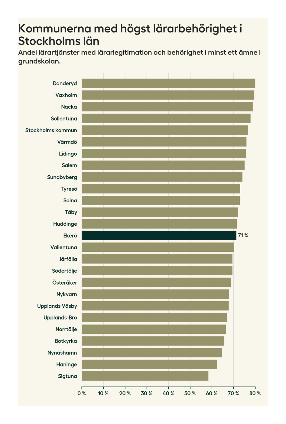 I oktober 2023 hade motsvarande 71 procent av lärarna​​1 i grundskolan i Ekerö kommun lärarlegitimation och behörighet i minst ett ämne. Det är en ökning med två procentenheter jämfört med året innan.