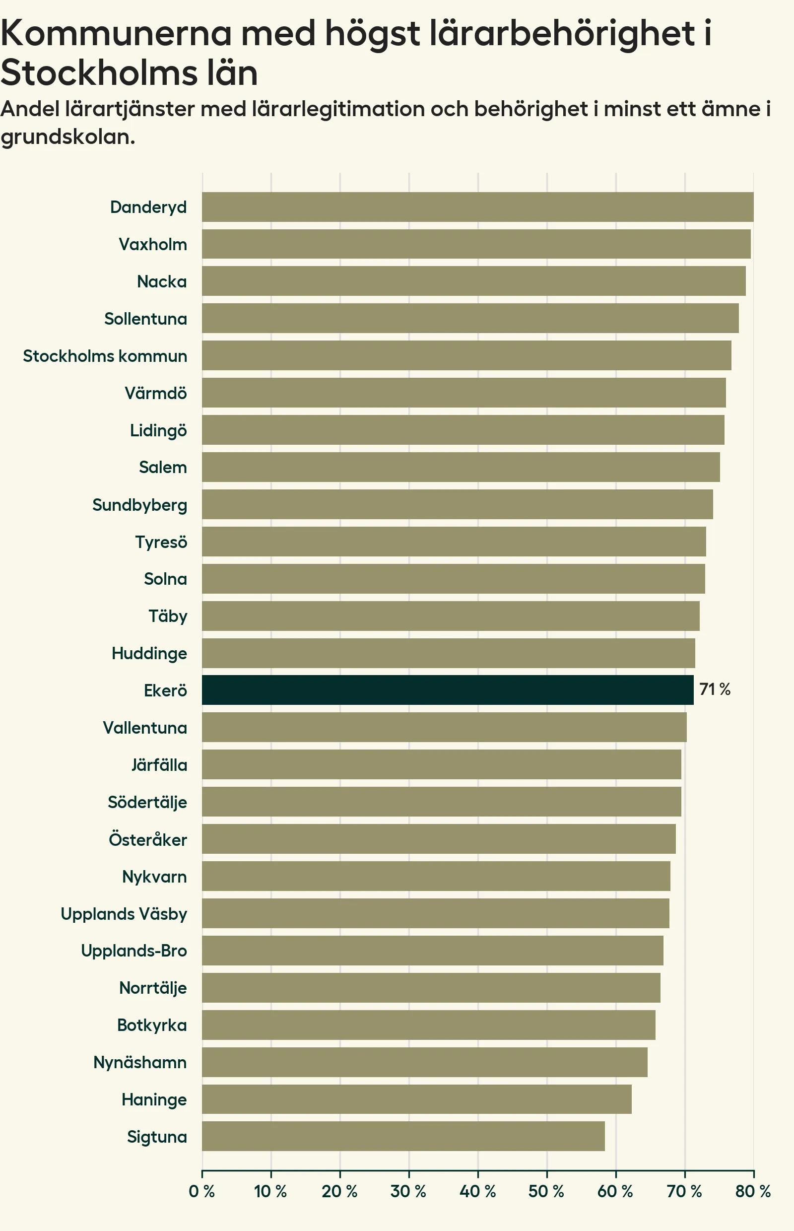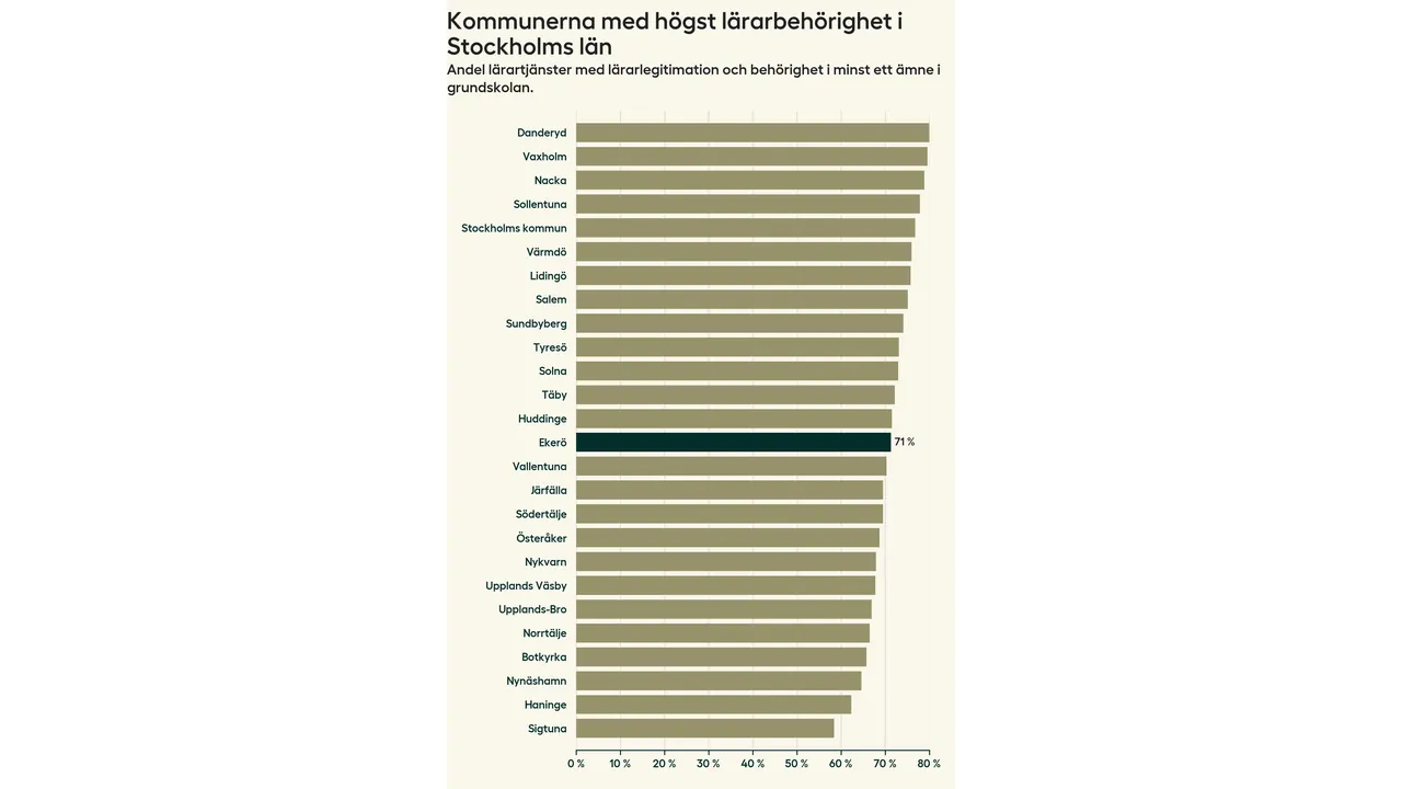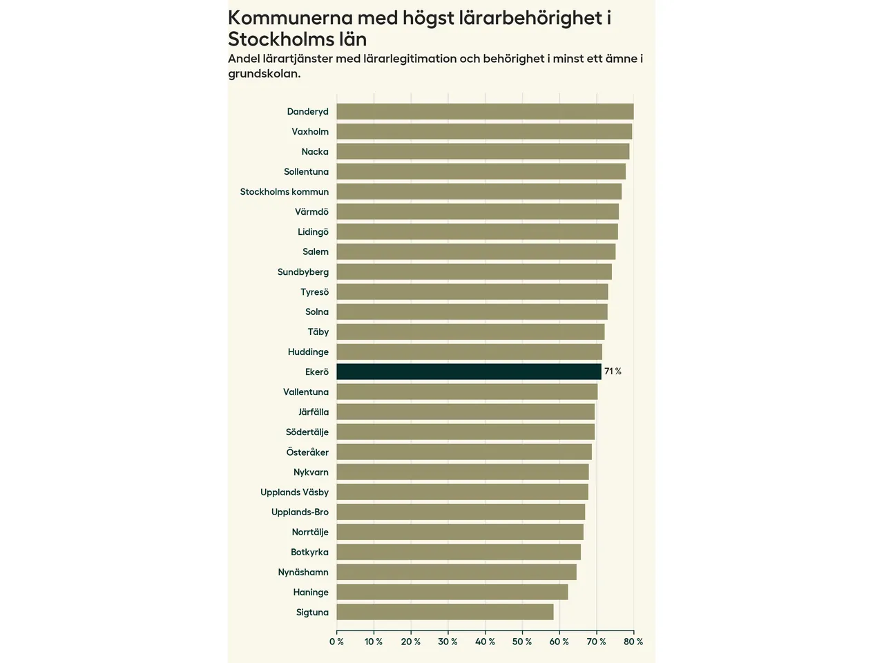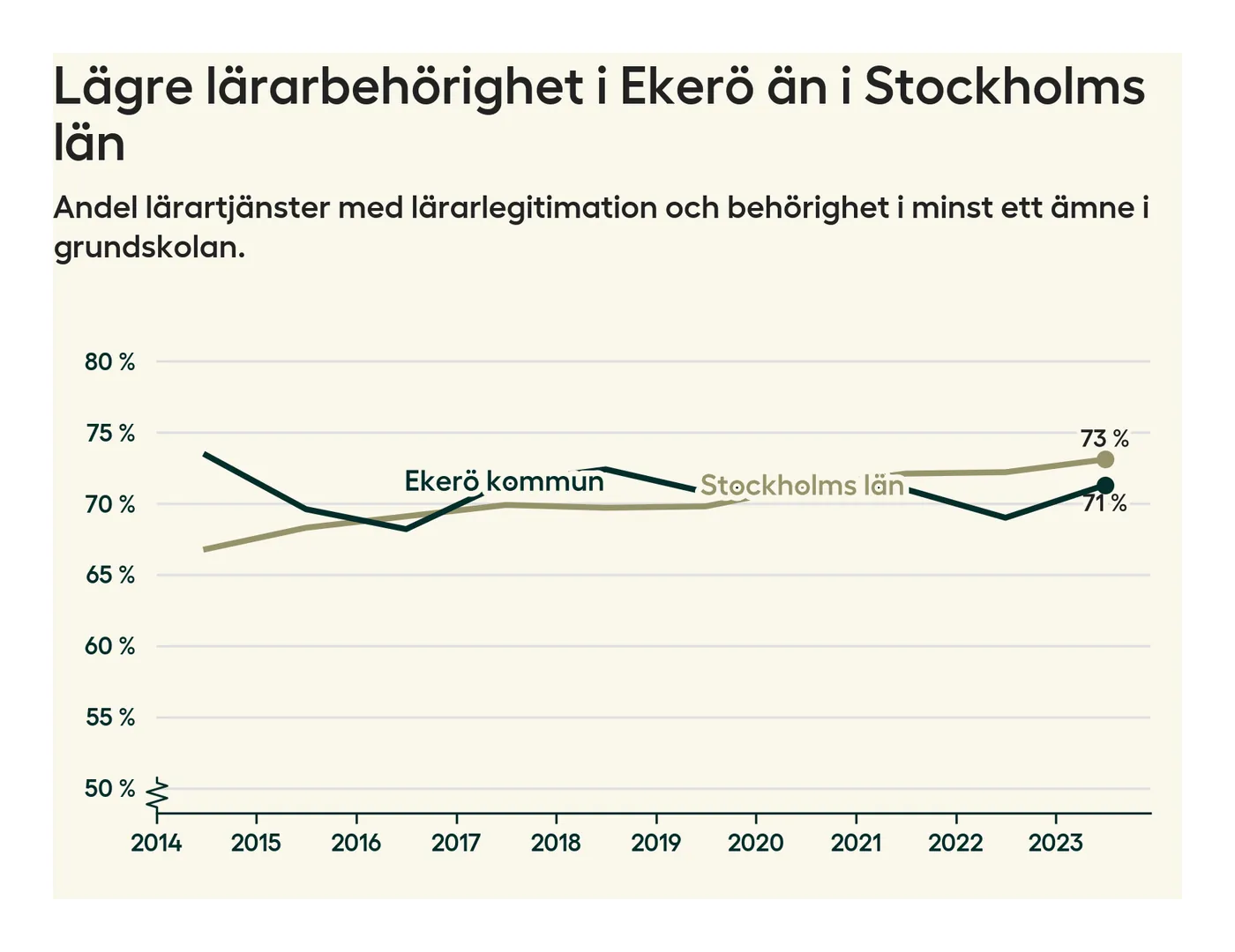I oktober 2023 hade motsvarande 71 procent av lärarna​​1 i grundskolan i Ekerö kommun lärarlegitimation och behörighet i minst ett ämne. Det är en ökning med två procentenheter jämfört med året innan.
