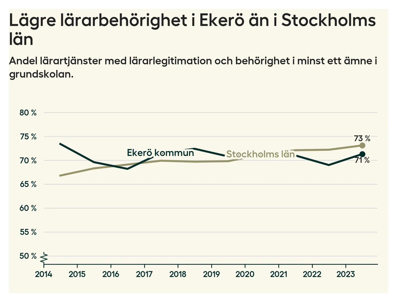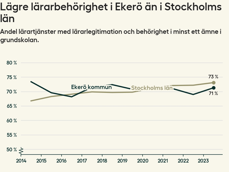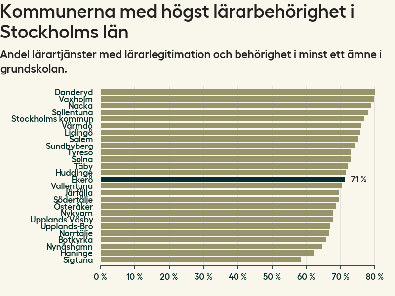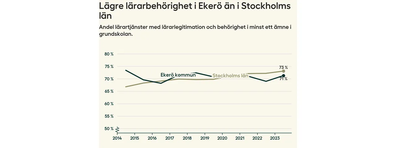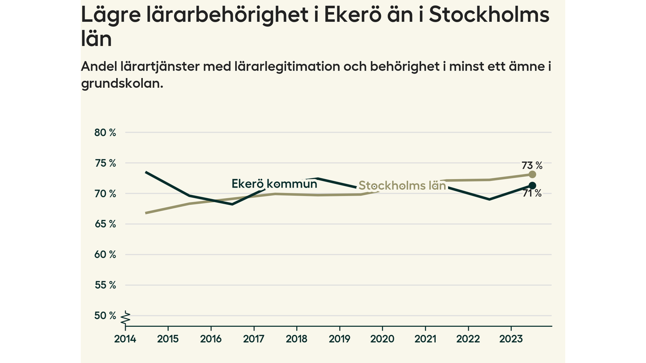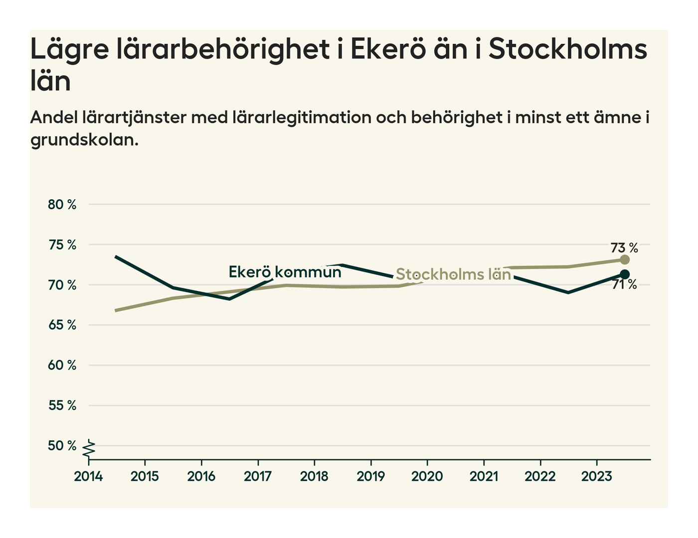I oktober 2023 hade motsvarande 71 procent av lärarna​​1 i grundskolan i Ekerö kommun lärarlegitimation och behörighet i minst ett ämne. Det är en ökning med två procentenheter jämfört med året innan.