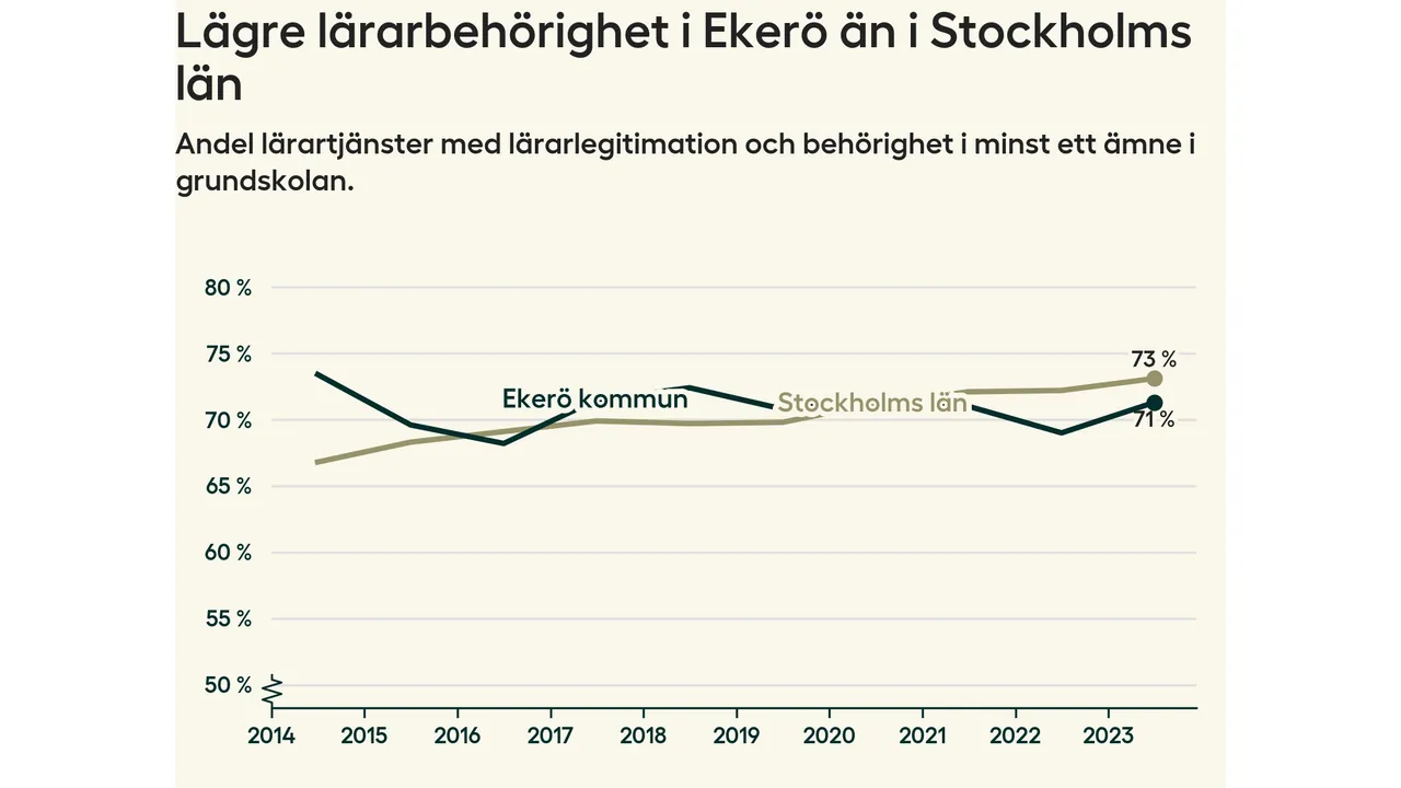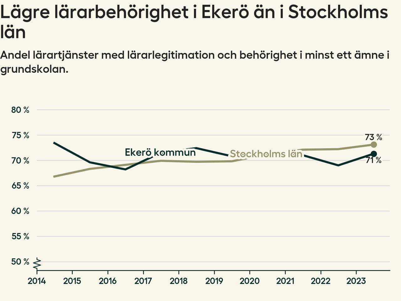 Ekerö följde därmed utvecklingen i riket. I hela landet ligger lärarbehörigheten på 71,5 procent, vilket är något högre än året innan.