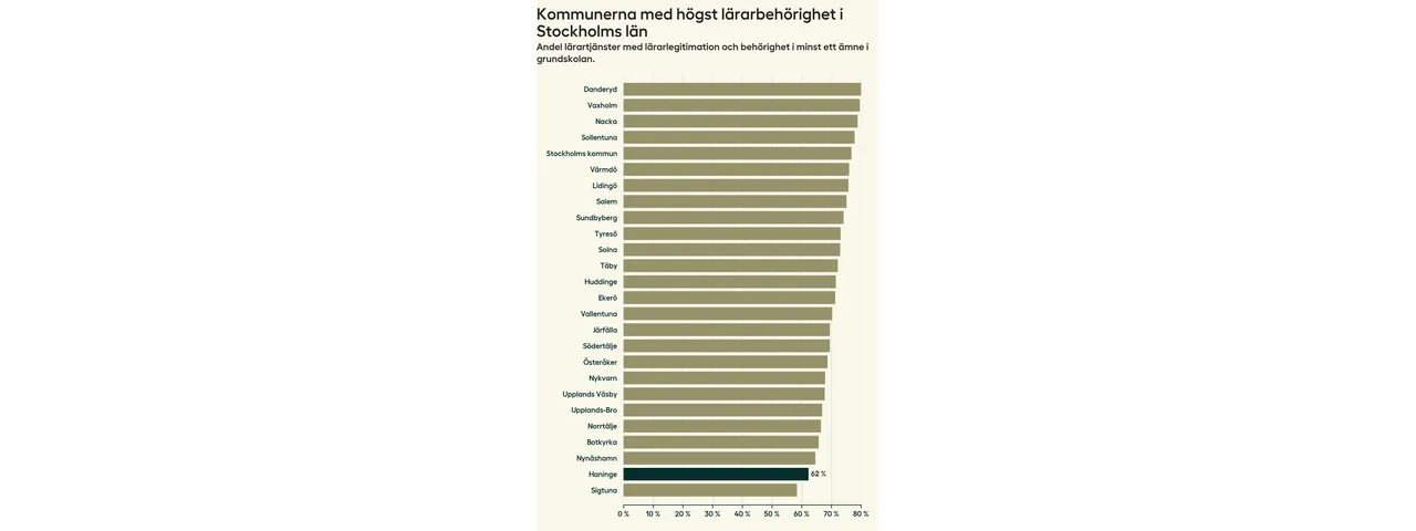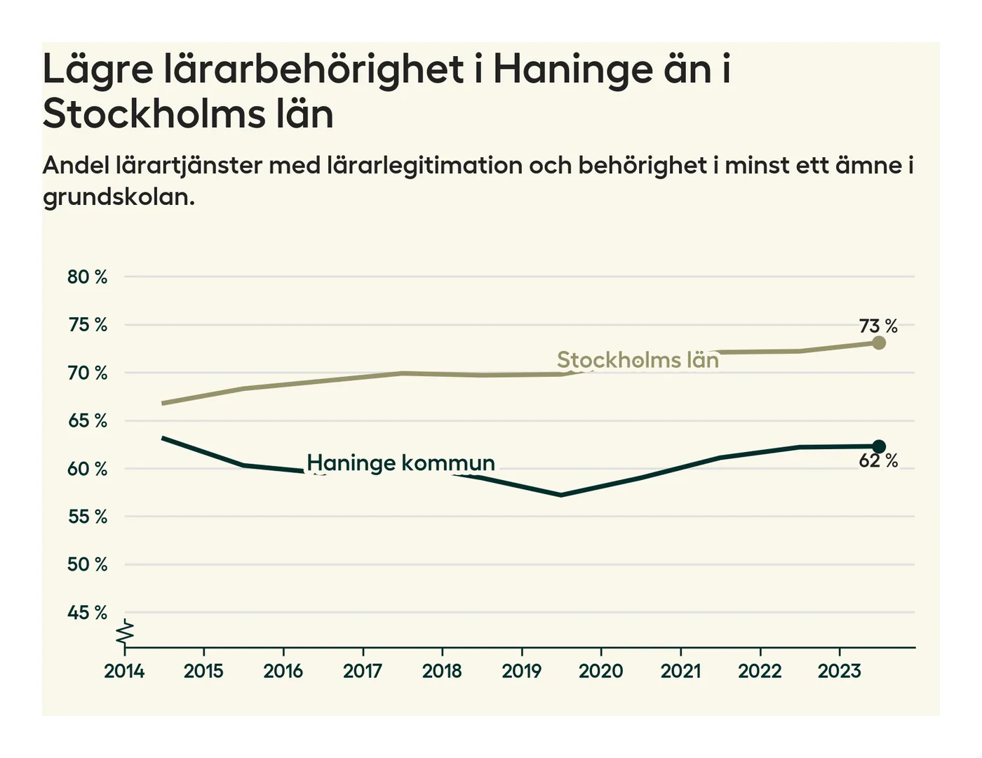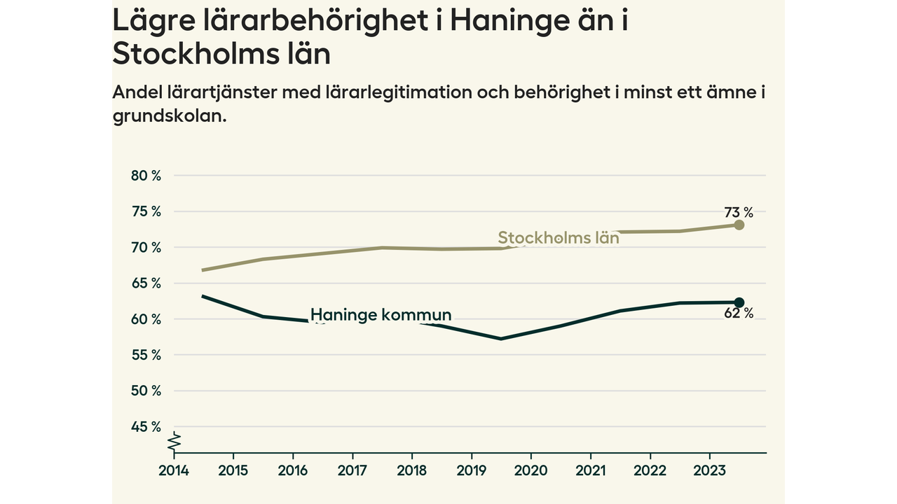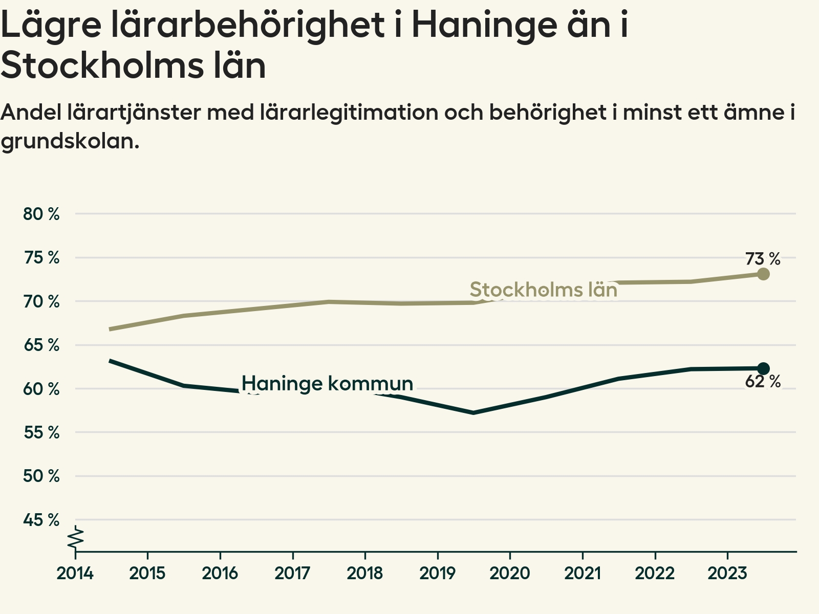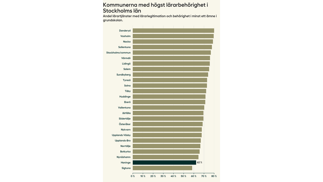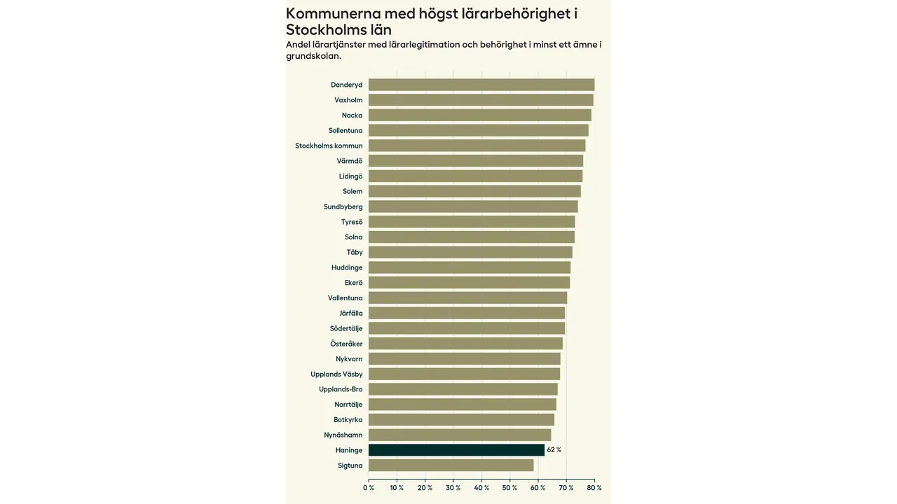I oktober 2023 hade motsvarande 62 procent av lärarna1 i grundskolan i Haninge kommun lärarlegitimation och behörighet i minst ett ämne. Det innebär att kommunen har den näst lägsta lärarbehörigheten i Stockholms län.