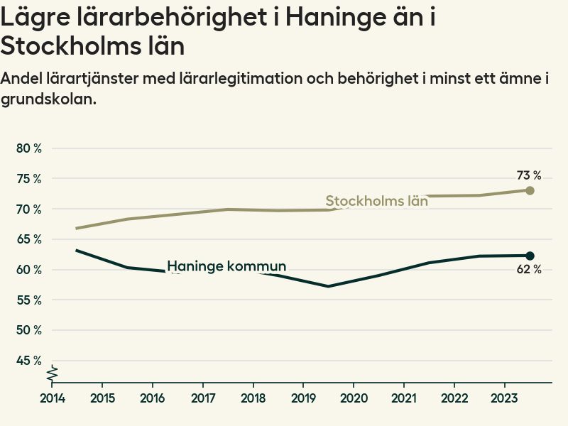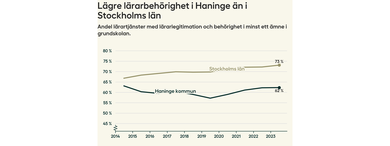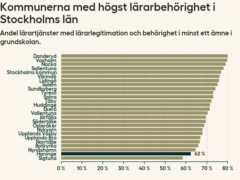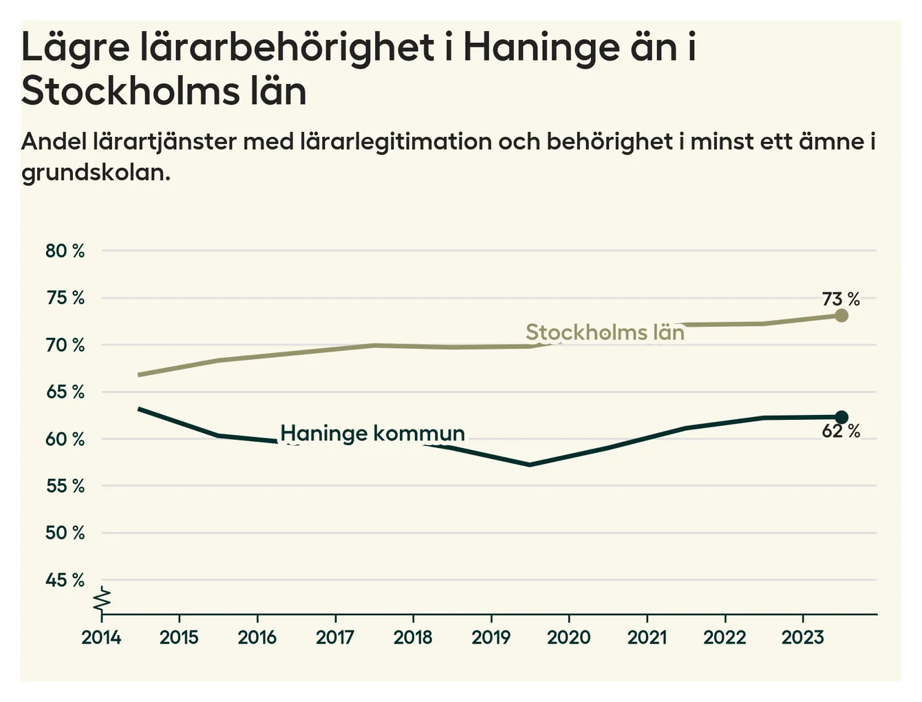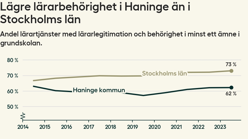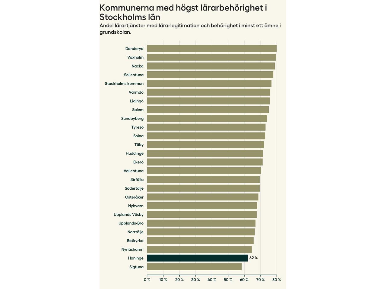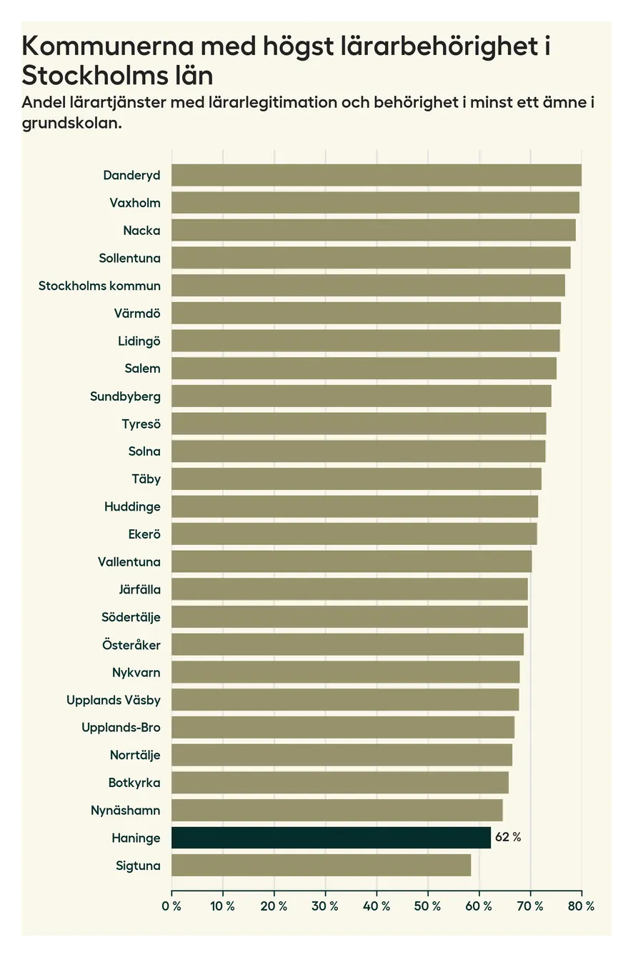 I oktober 2023 hade motsvarande 62 procent av lärarna1 i grundskolan i Haninge kommun lärarlegitimation och behörighet i minst ett ämne. Det innebär att kommunen har den näst lägsta lärarbehörigheten i Stockholms län.
