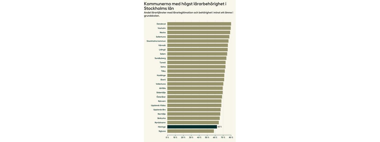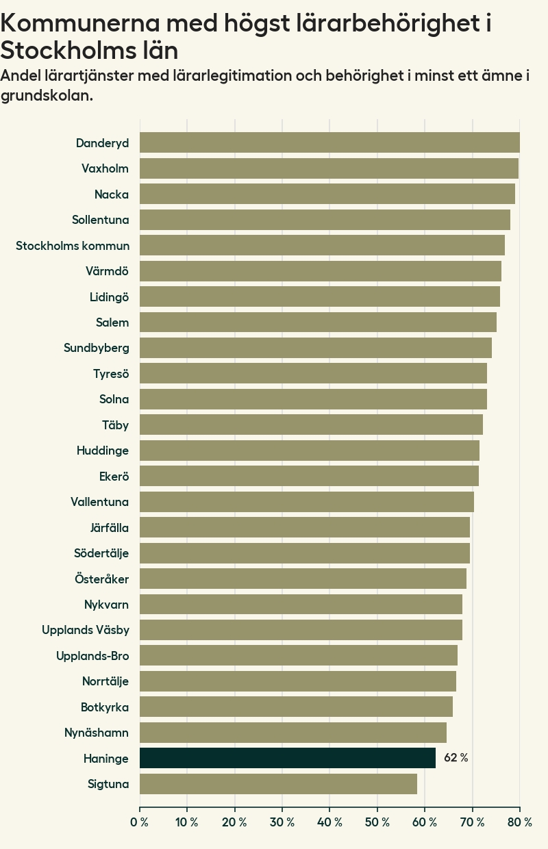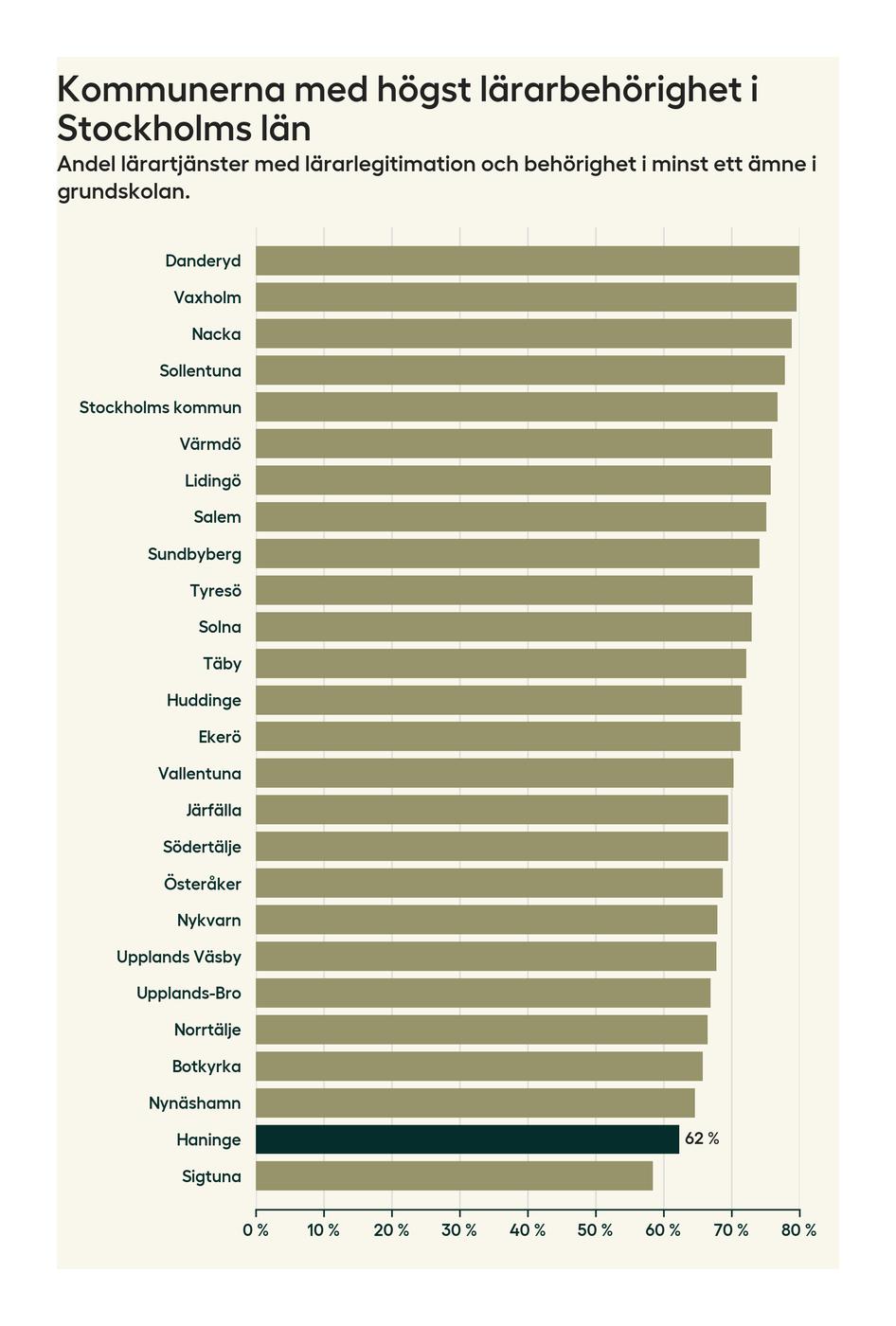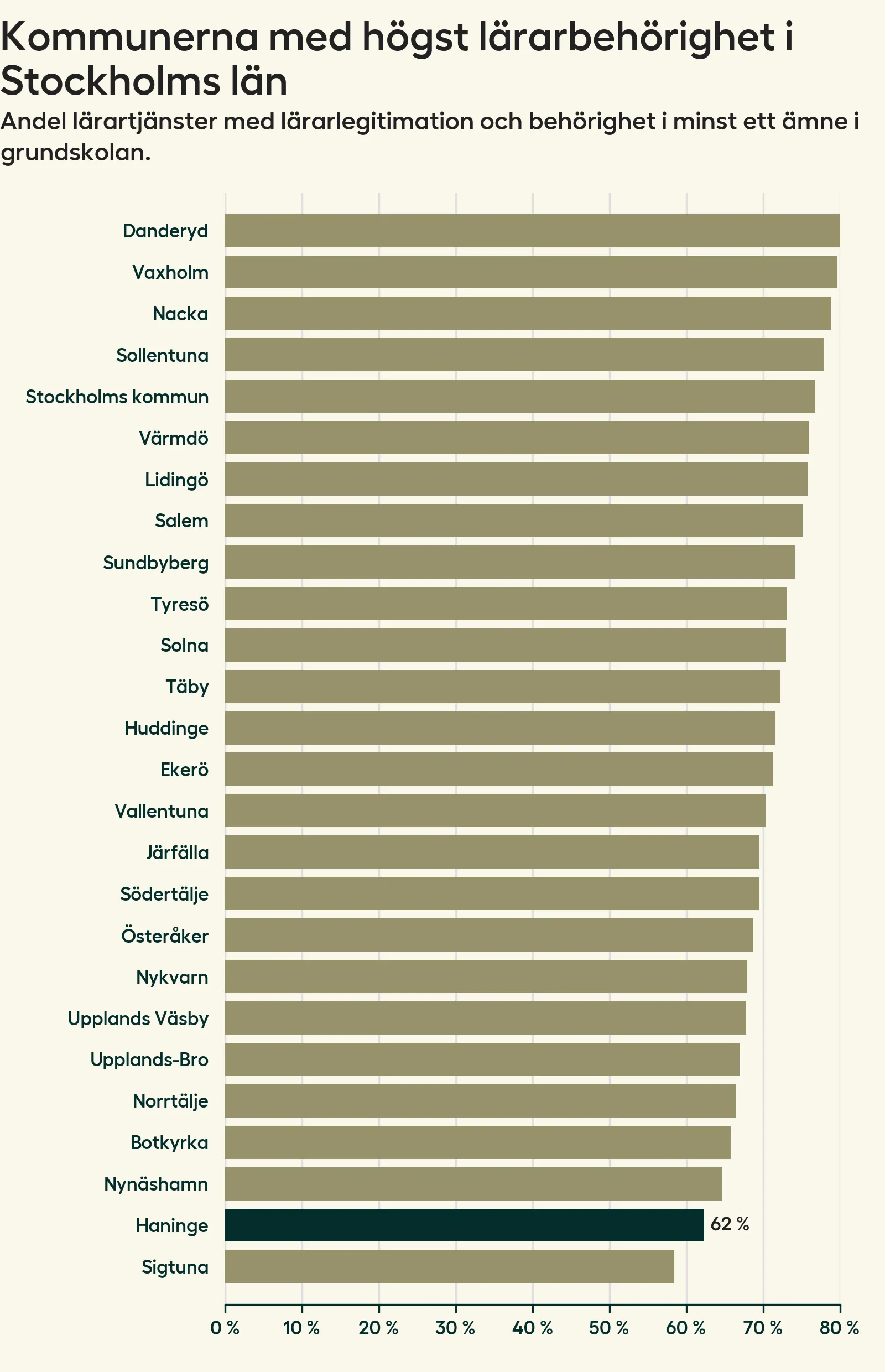 Av de sammanlagt 668 heltidstjänsterna i grundskolan i Haninge kommun (motsvarande 741 lärare) var det 416 som hade lärarlegitimation och behörighet i minst ett ämne.