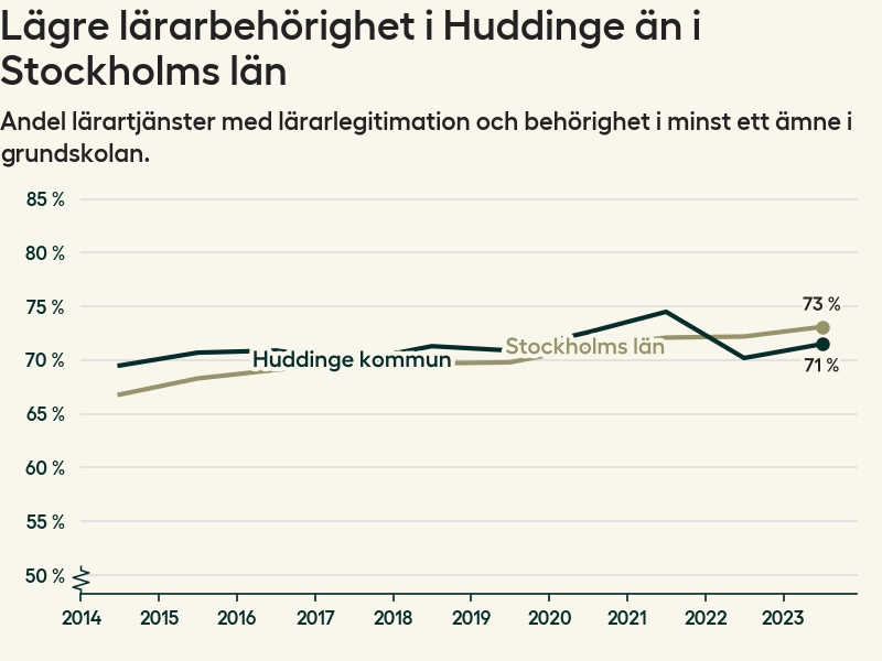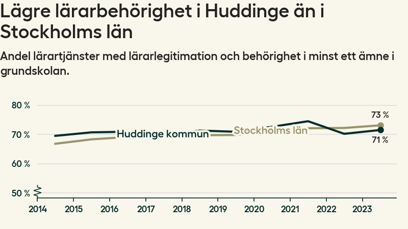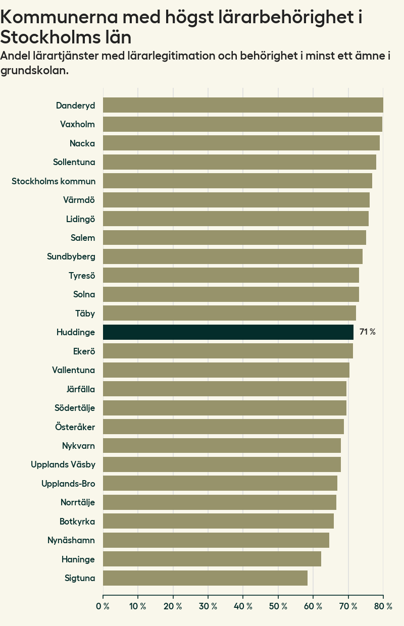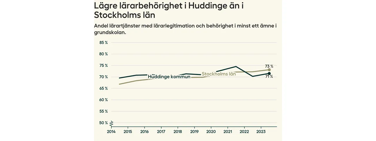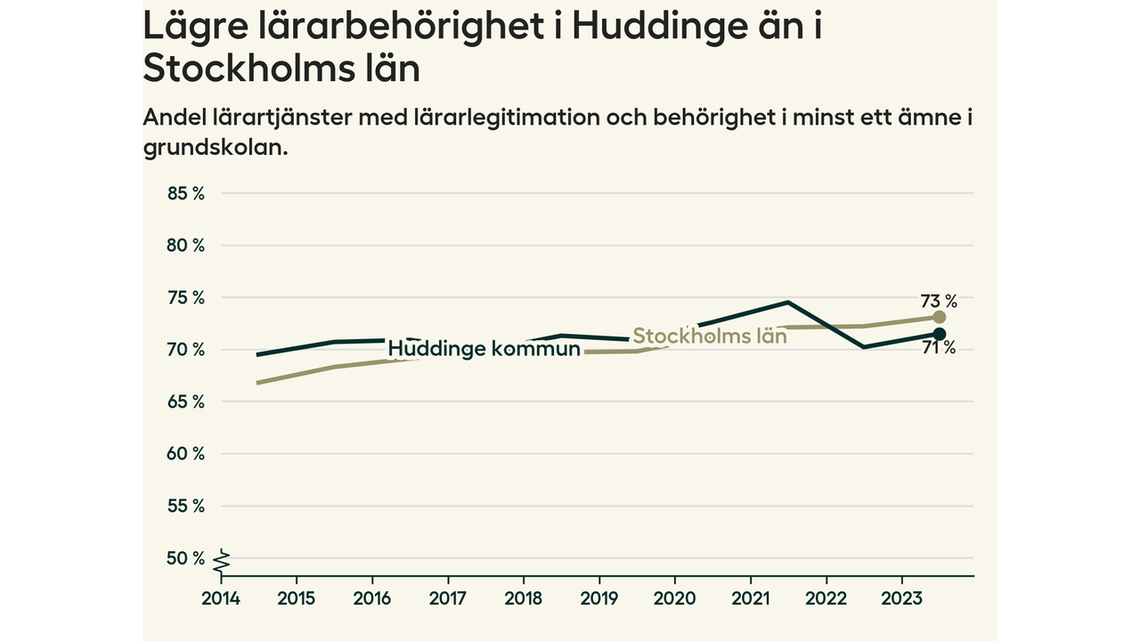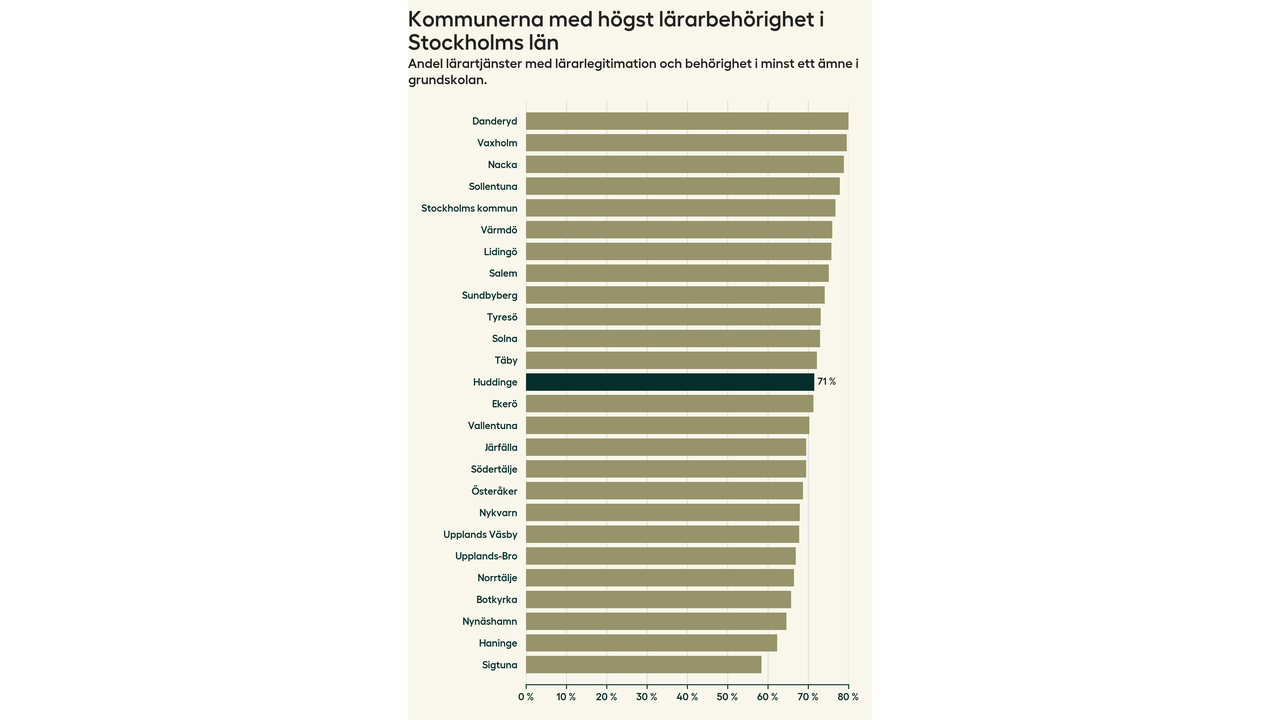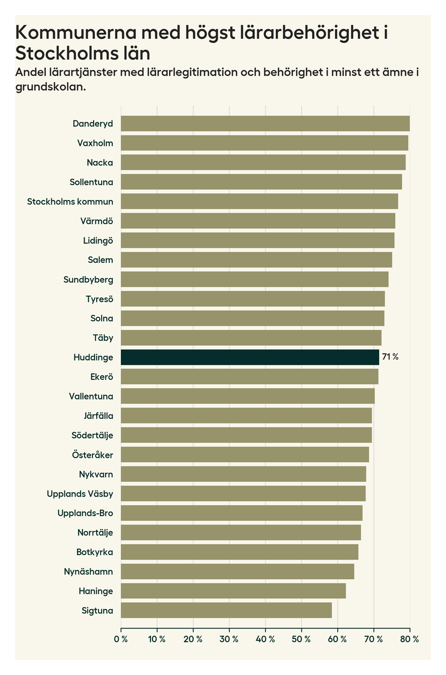 Av de sammanlagt 806 heltidstjänsterna i grundskolan i Huddinge kommun (motsvarande 909 lärare) var det 577 som hade lärarlegitimation och behörighet i minst ett ämne.