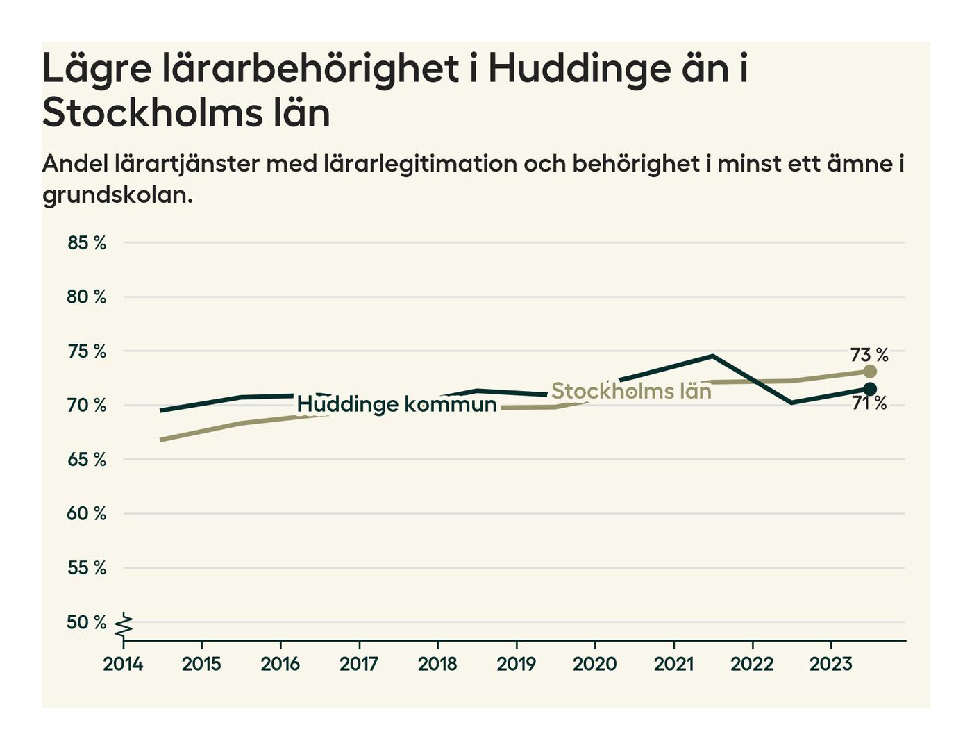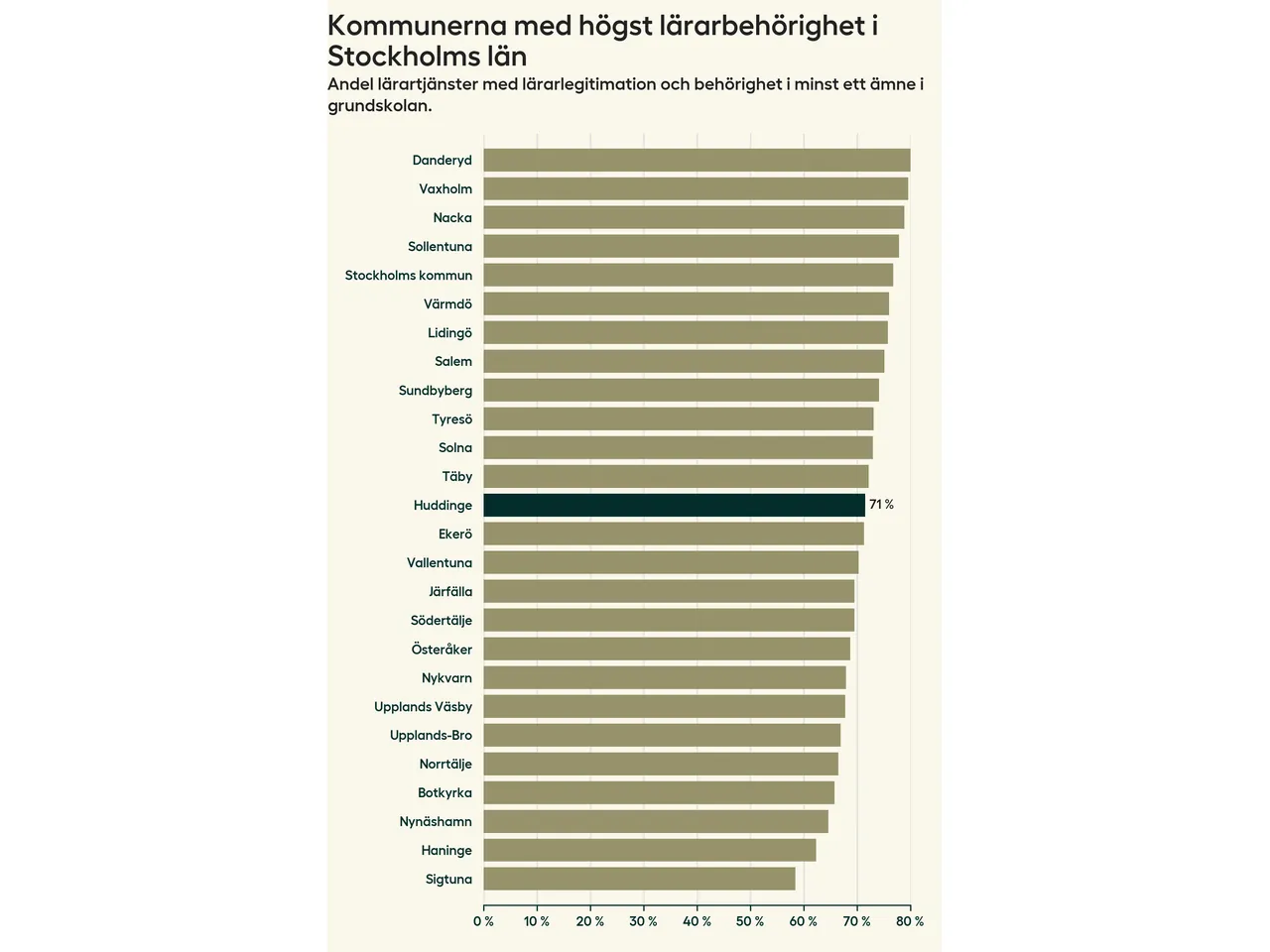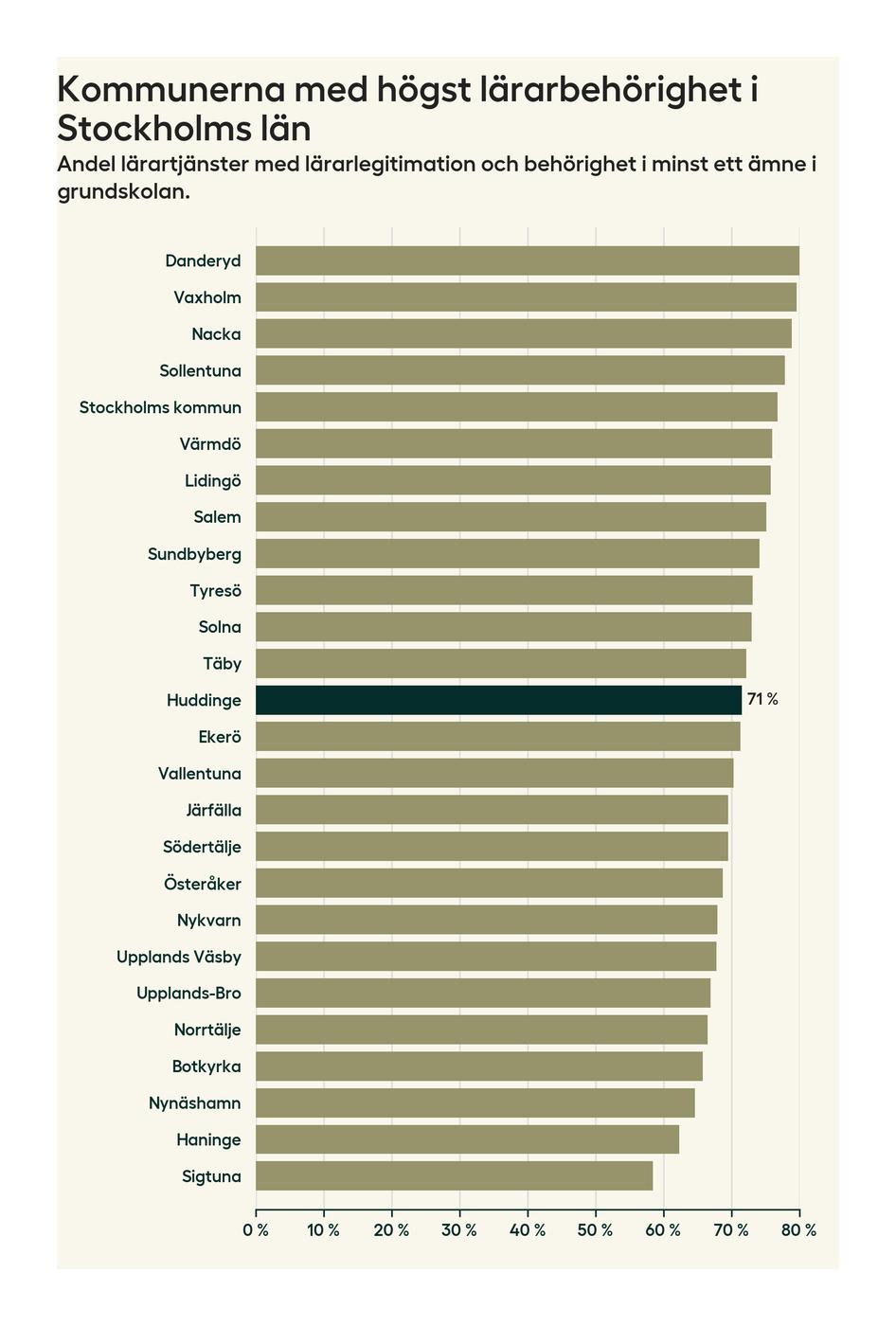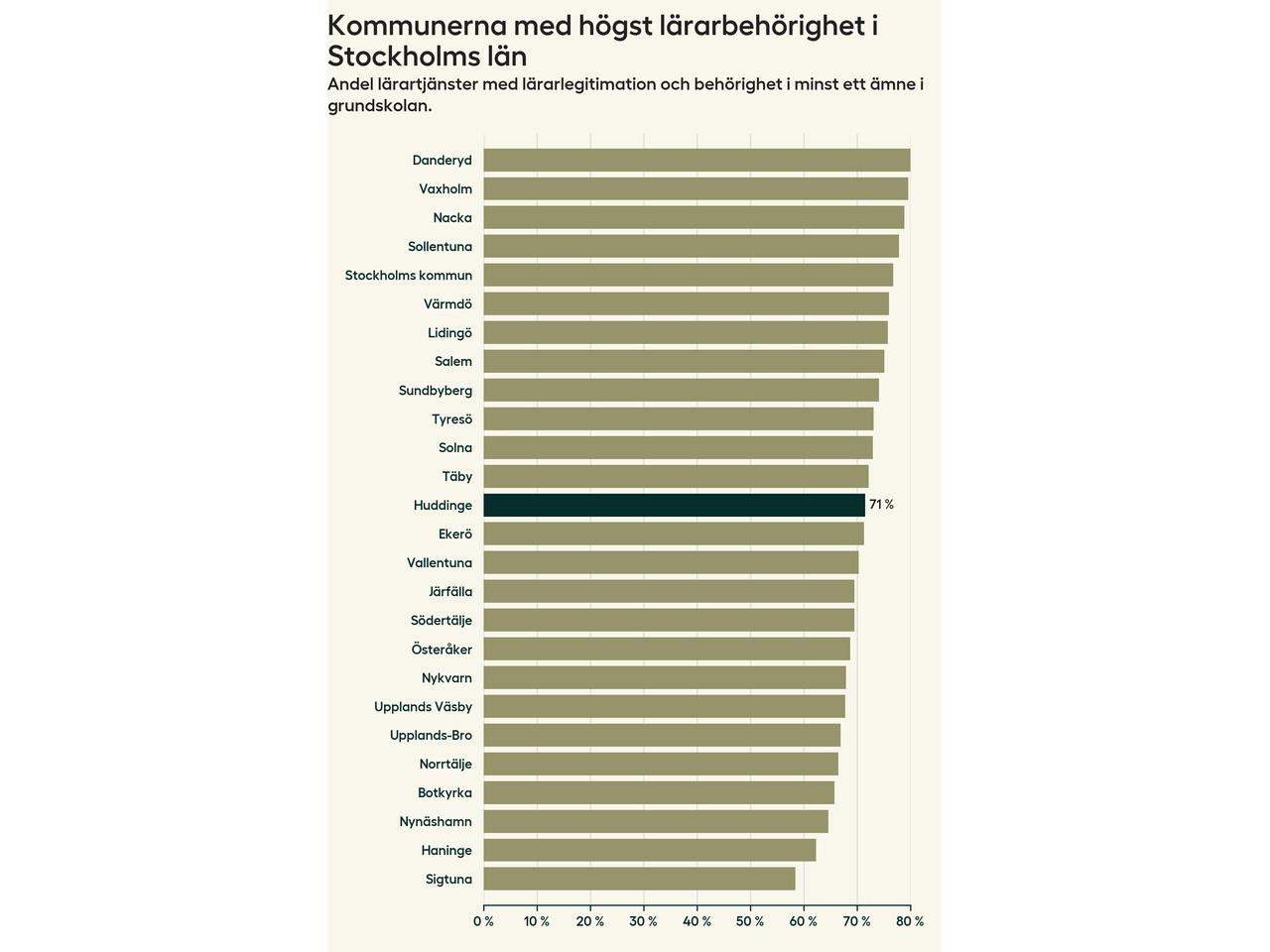 Av de sammanlagt 806 heltidstjänsterna i grundskolan i Huddinge kommun (motsvarande 909 lärare) var det 577 som hade lärarlegitimation och behörighet i minst ett ämne.