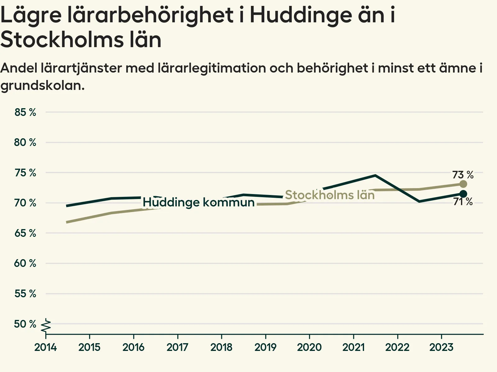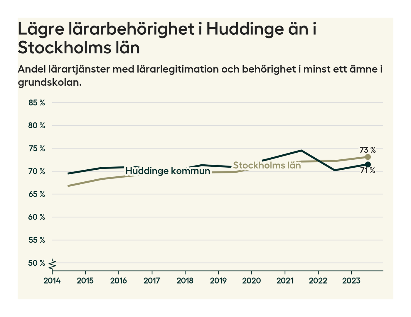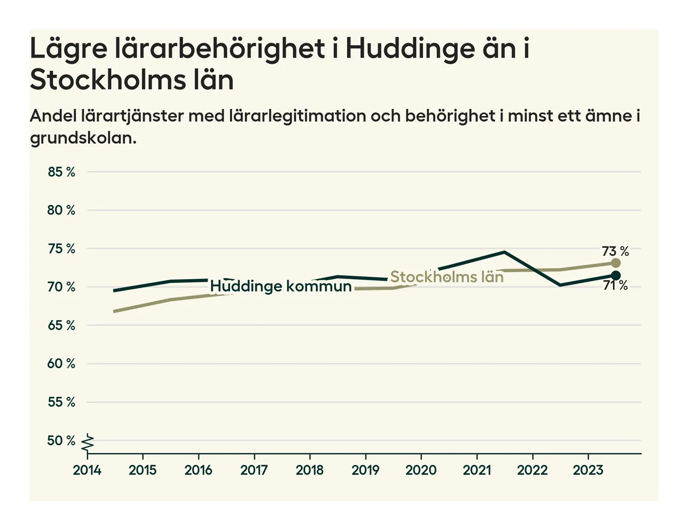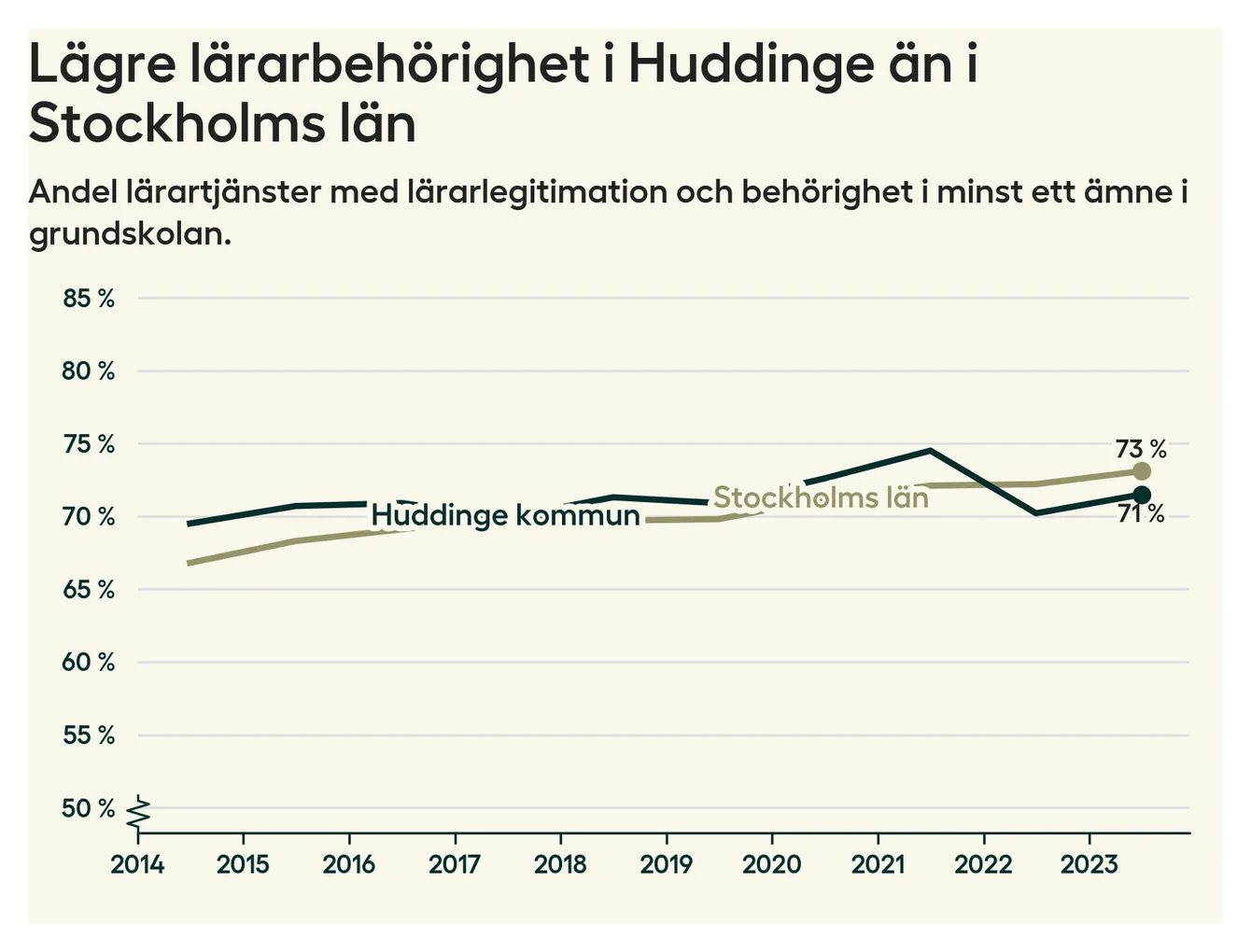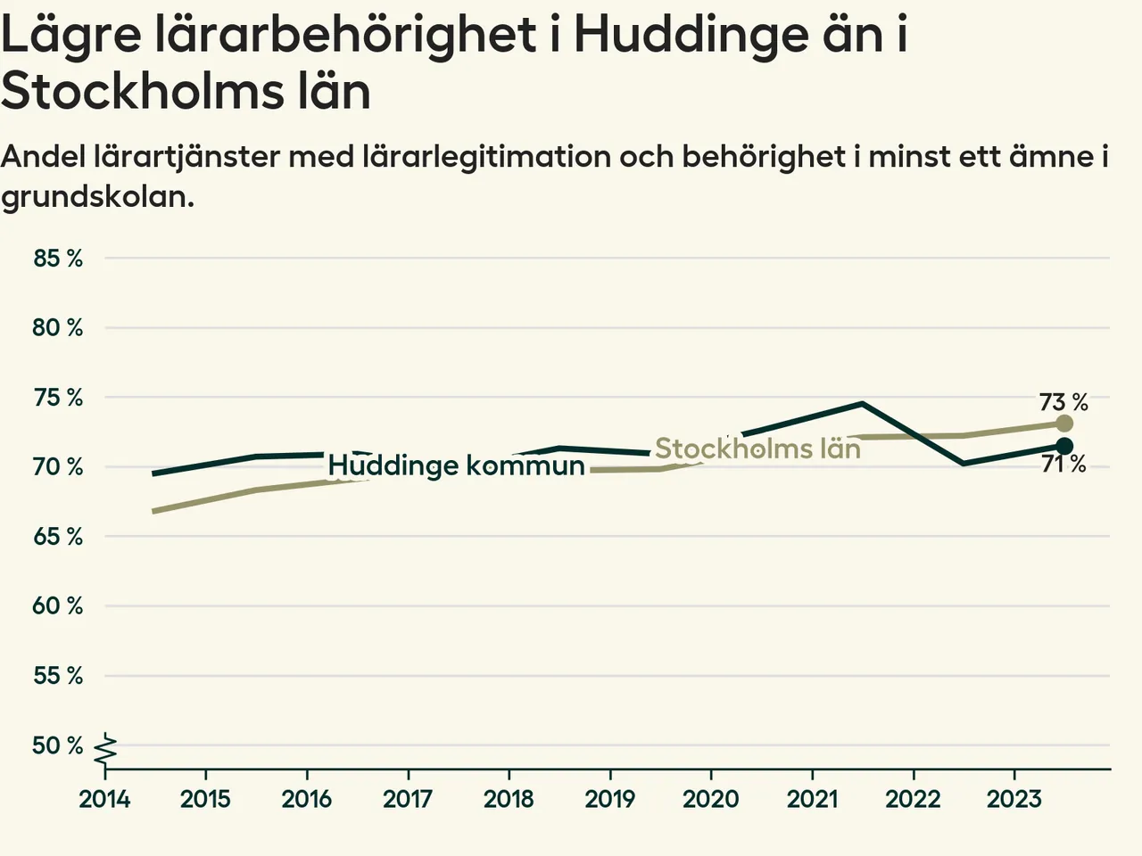 Av de sammanlagt 806 heltidstjänsterna i grundskolan i Huddinge kommun (motsvarande 909 lärare) var det 577 som hade lärarlegitimation och behörighet i minst ett ämne.