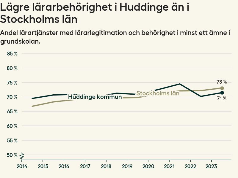 I oktober 2023 hade motsvarande 72 procent av lärarna1 i grundskolan i Huddinge kommun lärarlegitimation och behörighet i minst ett ämne.