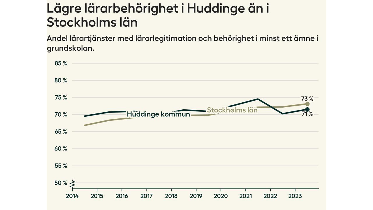 Huddinge kommun noterade en svag uppgång i lärarbehörighet under förra läsåret till 72 procent, vilket är nära snittet för hela landet.