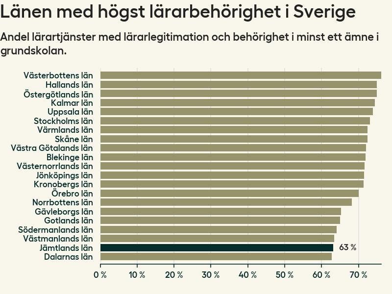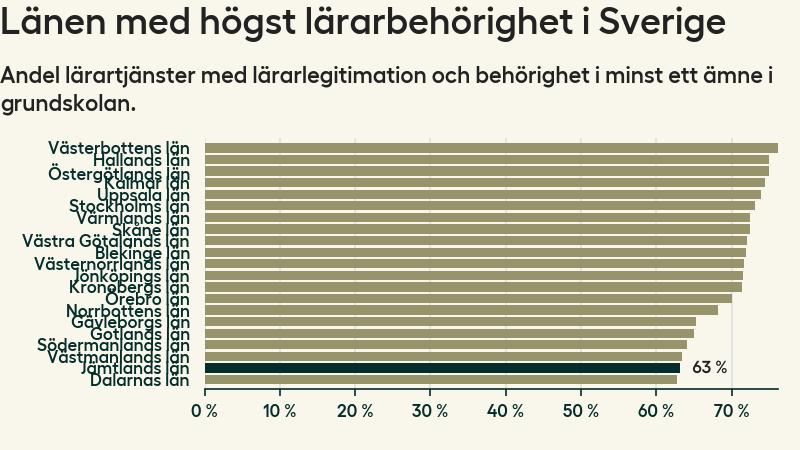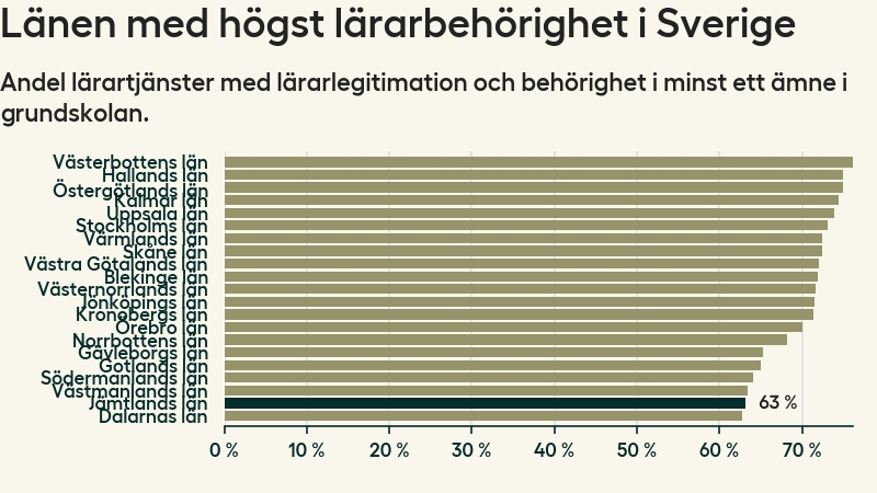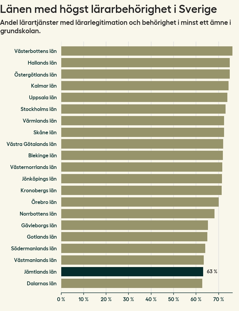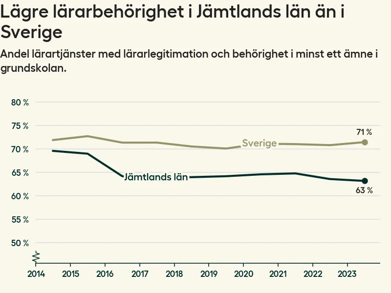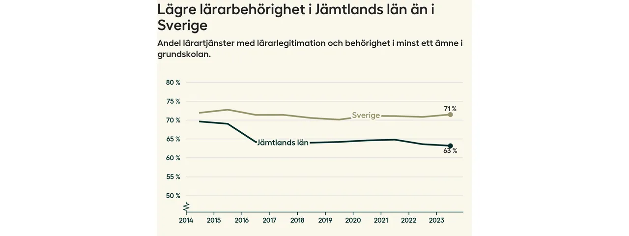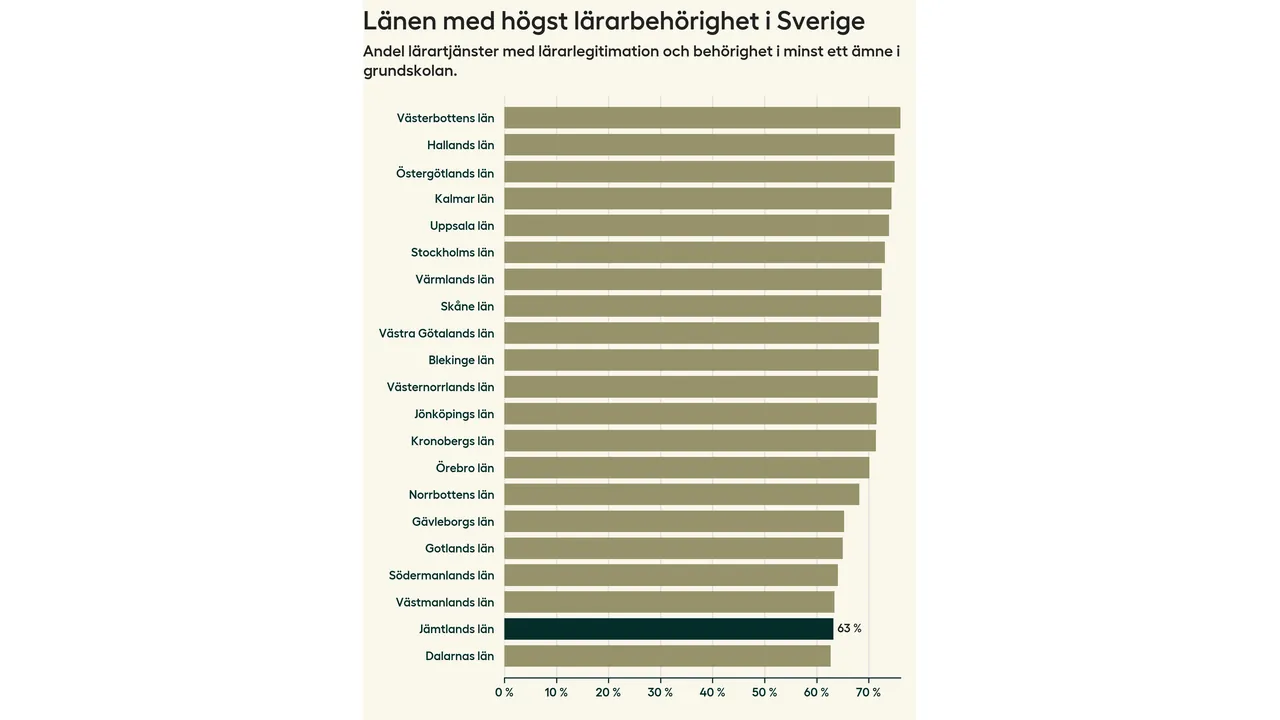 I oktober 2023 hade motsvarande 63 procent av lärarna1 i grundskolan i Jämtlands län lärarlegitimation och behörighet i minst ett ämne. Det innebär att länet har den näst lägsta lärarbehörigheten i hela landet.