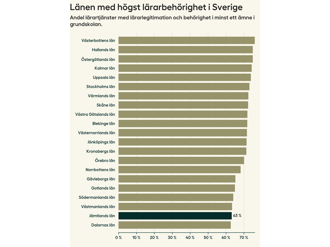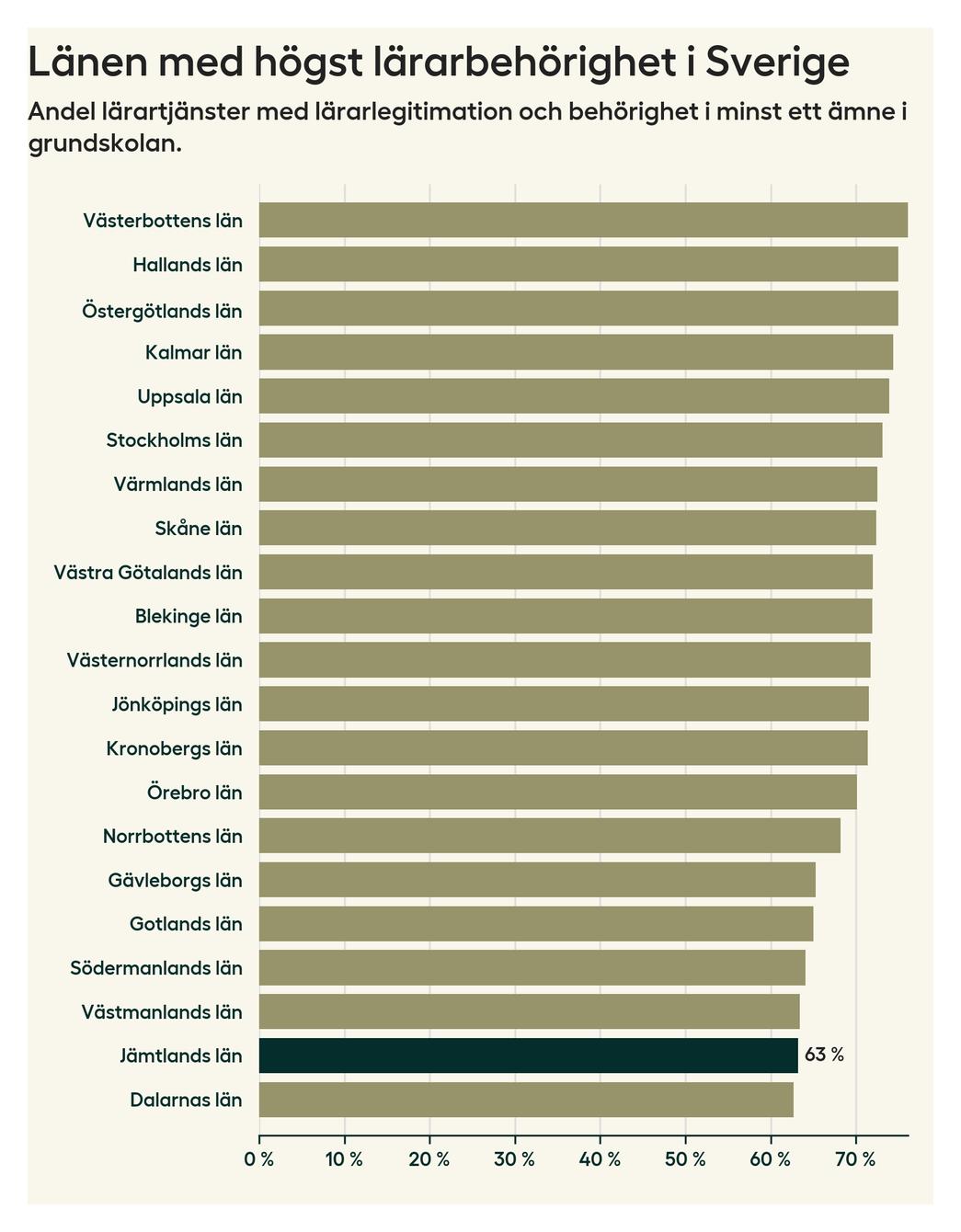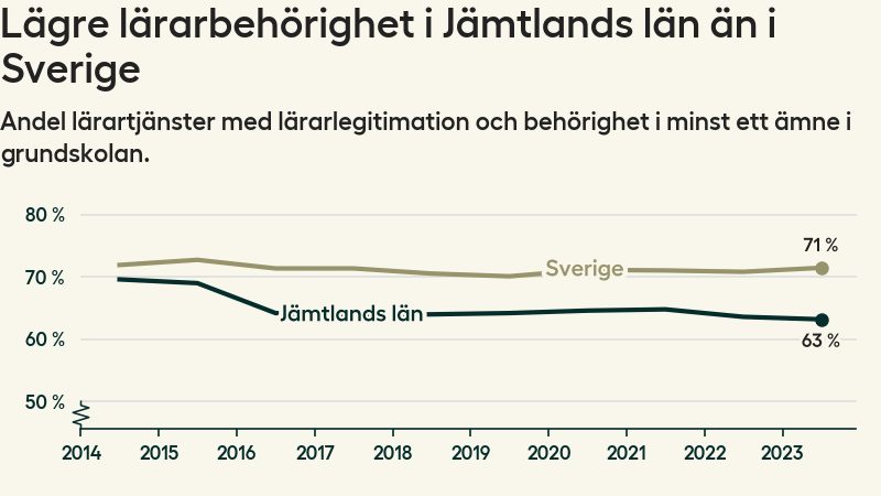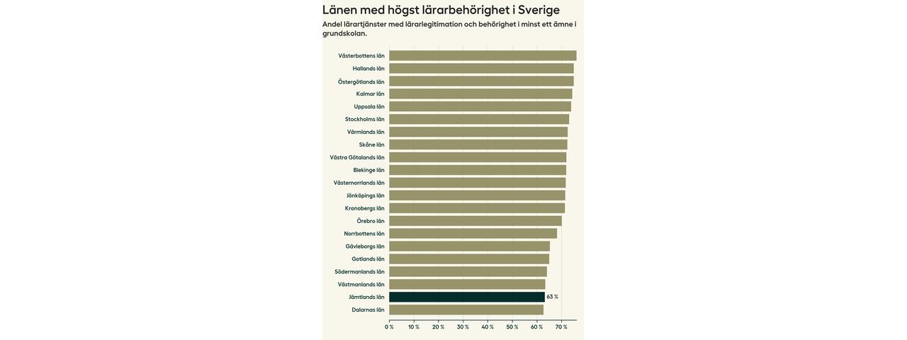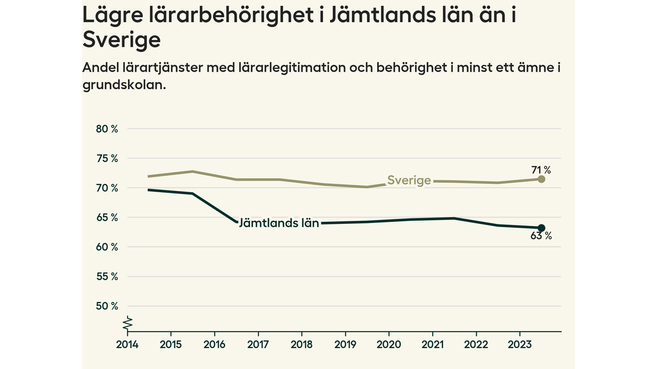 I oktober 2023 hade motsvarande 63 procent av lärarna1 i grundskolan i Jämtlands län lärarlegitimation och behörighet i minst ett ämne. Det innebär att länet har den näst lägsta lärarbehörigheten i hela landet.