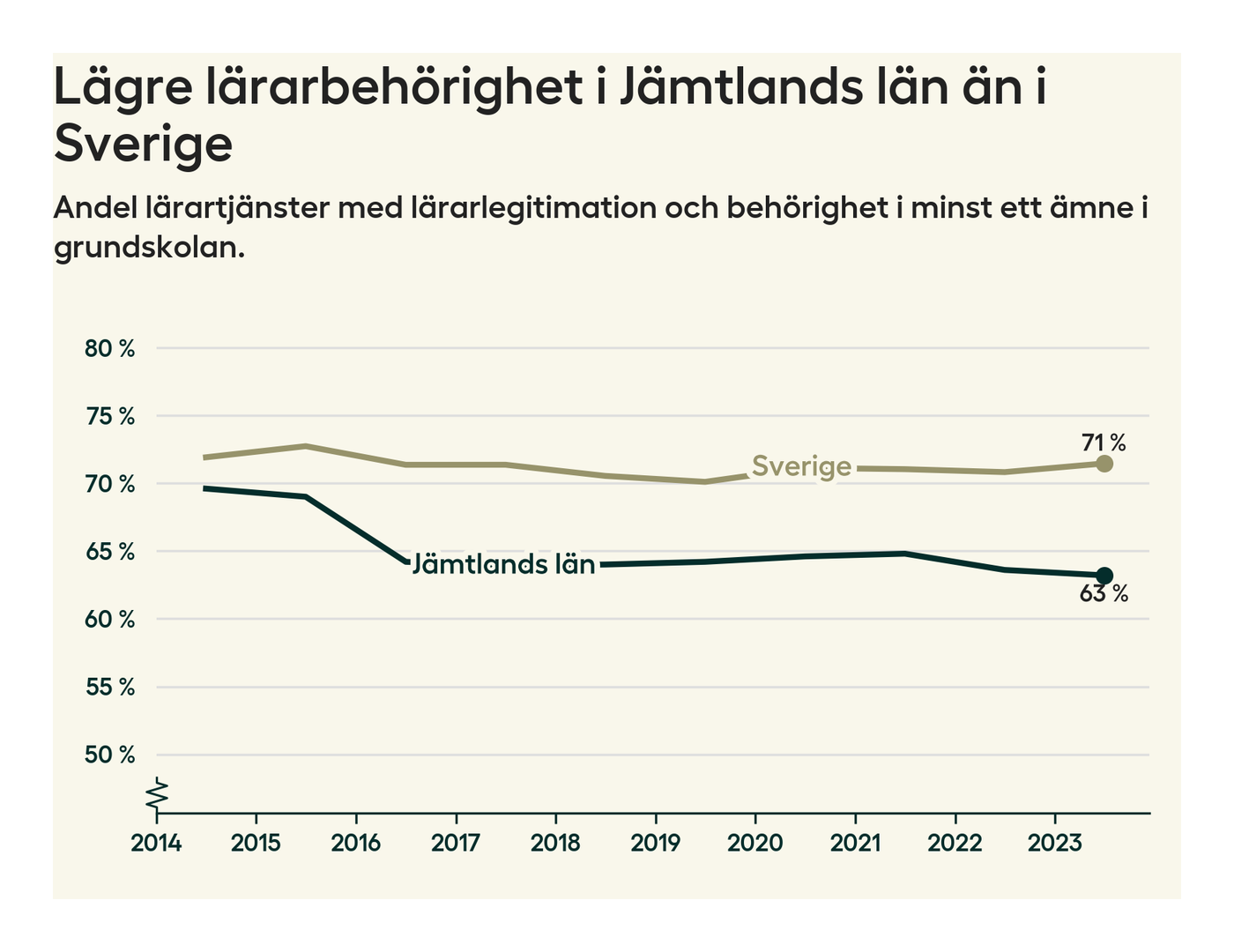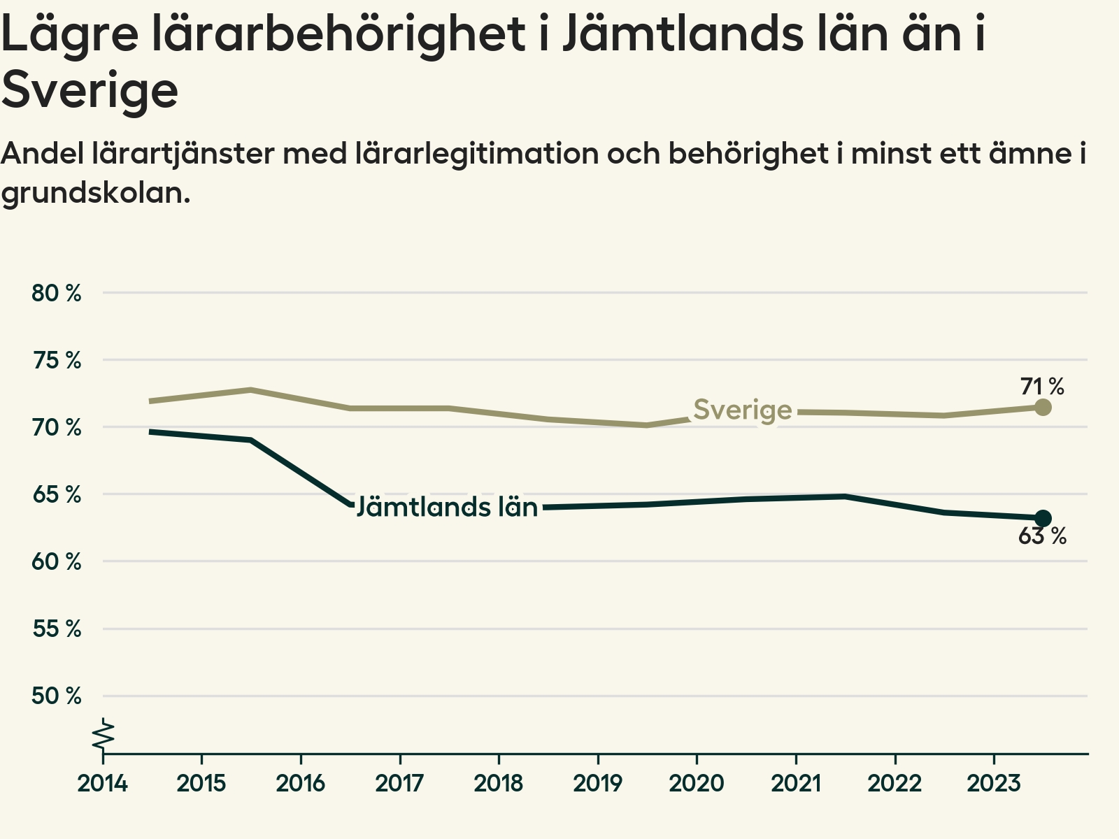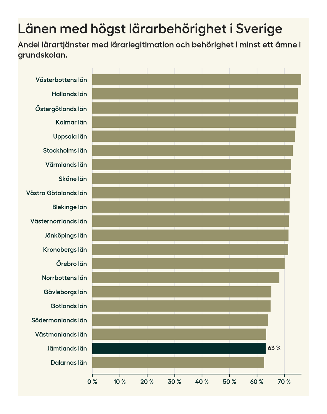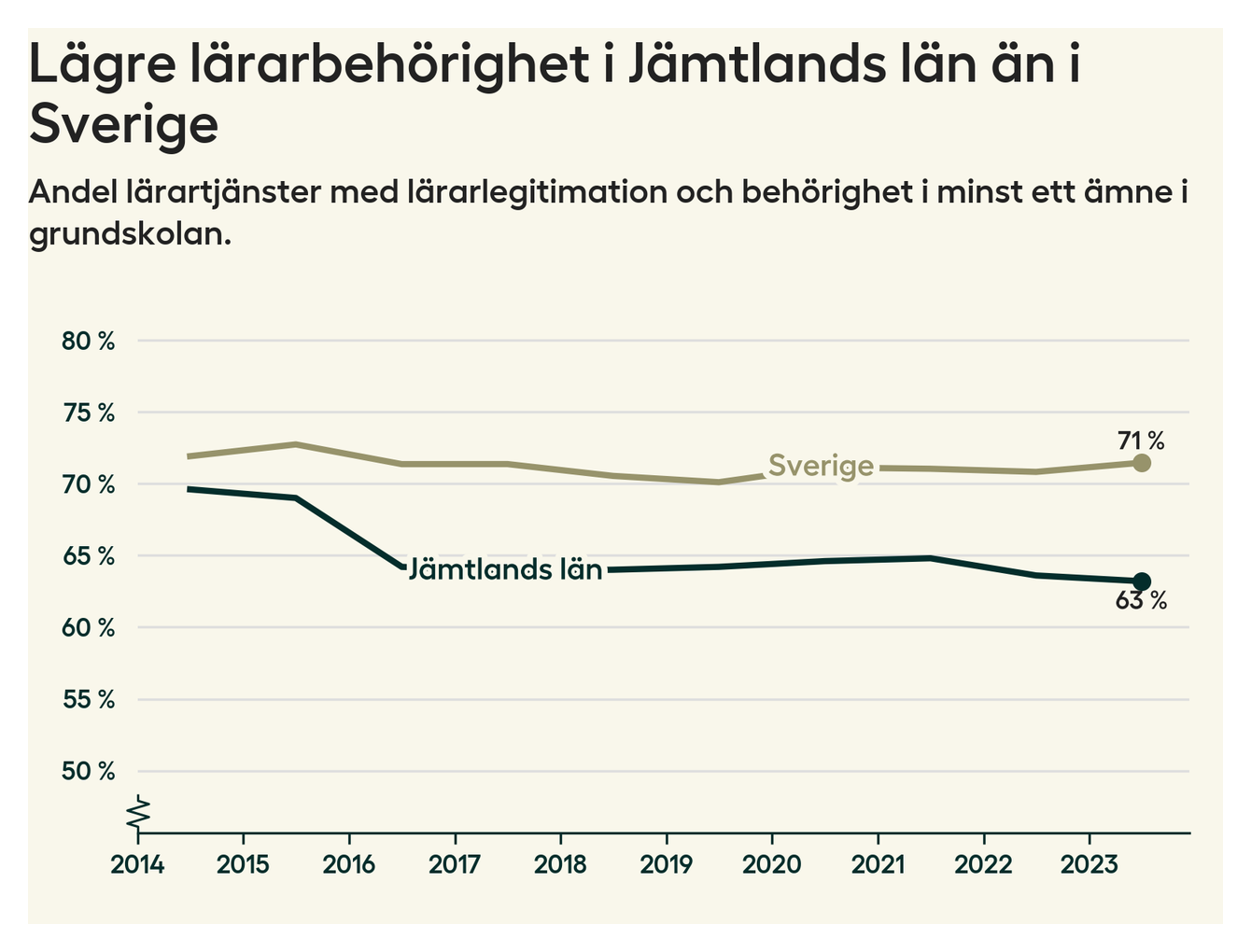 I oktober 2023 hade motsvarande 63 procent av lärarna1 i grundskolan i Jämtlands län lärarlegitimation och behörighet i minst ett ämne. Det innebär att länet har den näst lägsta lärarbehörigheten i hela landet.