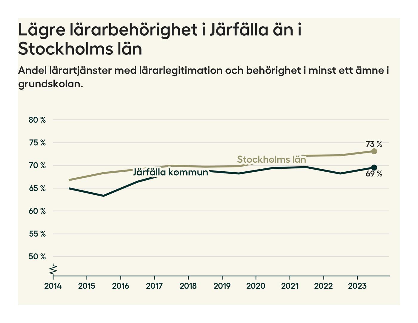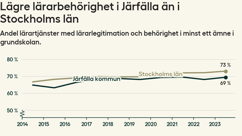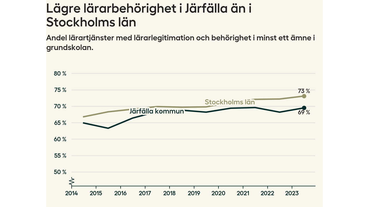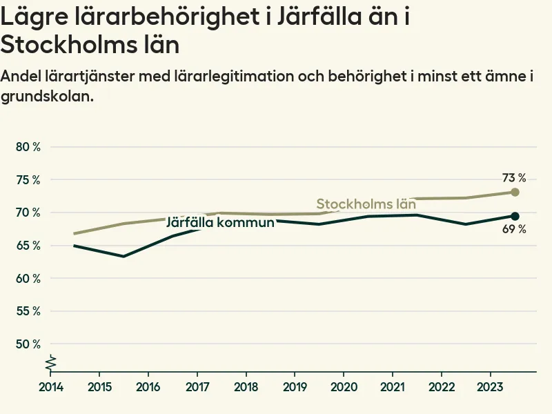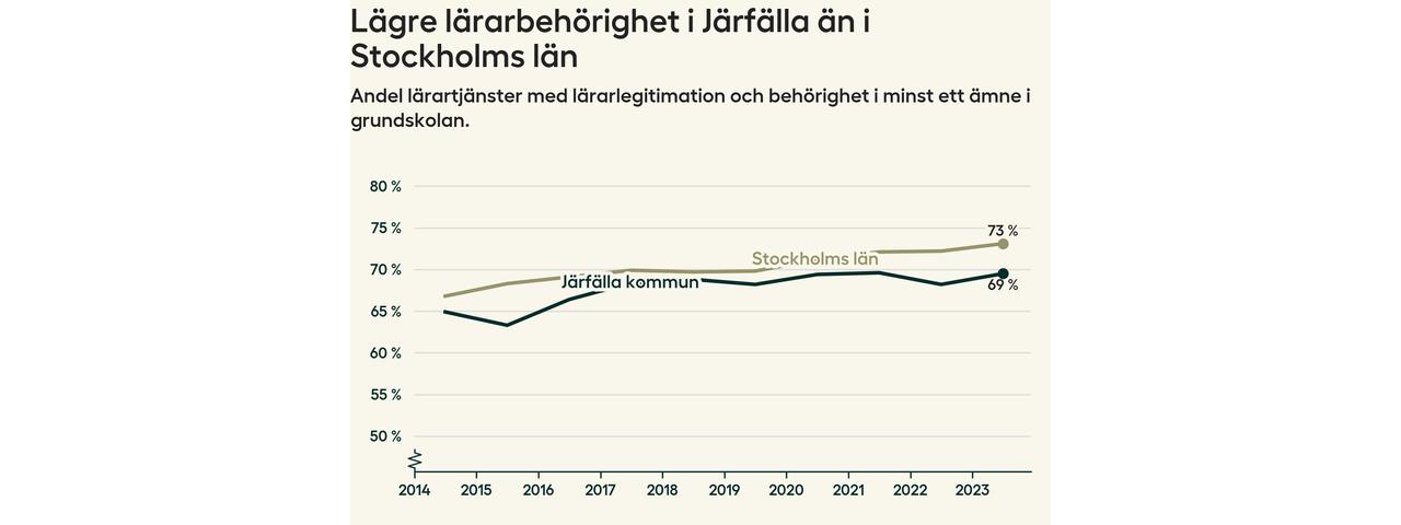 I oktober 2023 hade motsvarande 70 procent av lärarna​​1 i grundskolan i Järfälla kommun lärarlegitimation och behörighet i minst ett ämne.