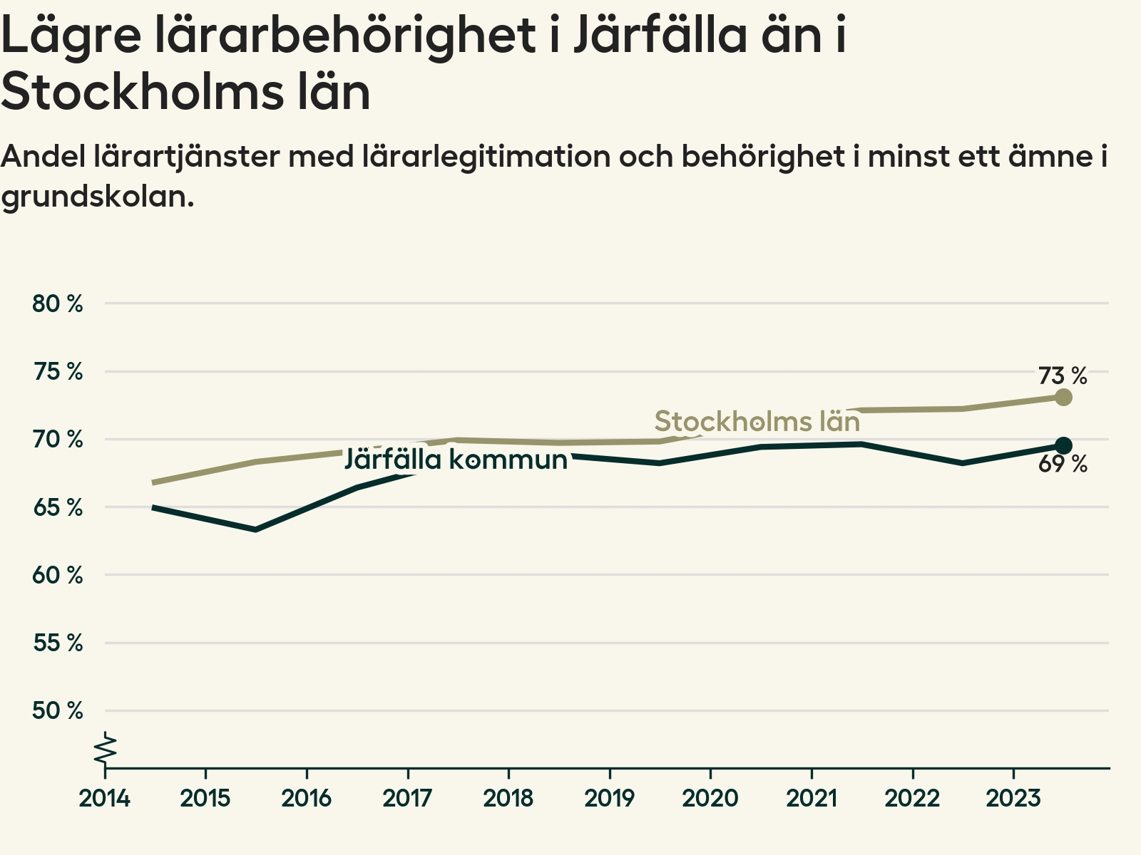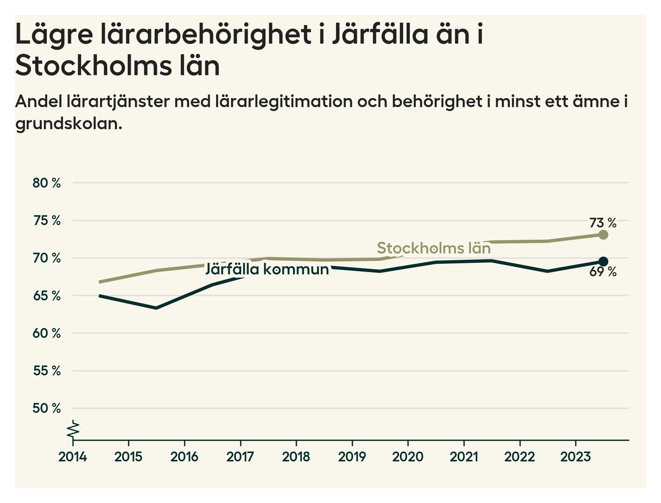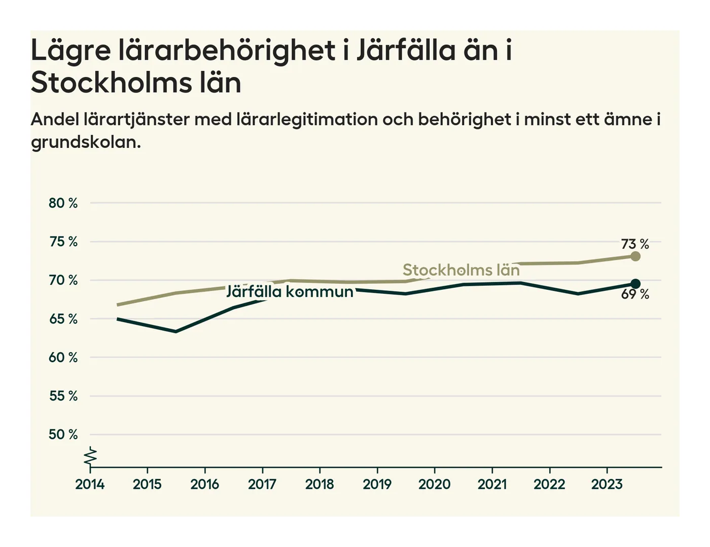 I oktober 2023 hade motsvarande 70 procent av lärarna​​1 i grundskolan i Järfälla kommun lärarlegitimation och behörighet i minst ett ämne.