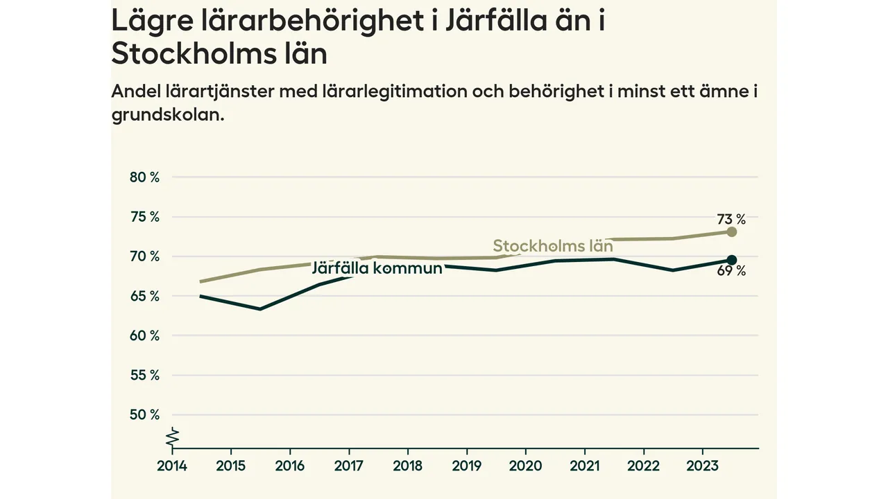 Järfälla kommun noterade en svag uppgång i lärarbehörighet under förra läsåret till 70 procent, vilket är under snittet för hela landet.