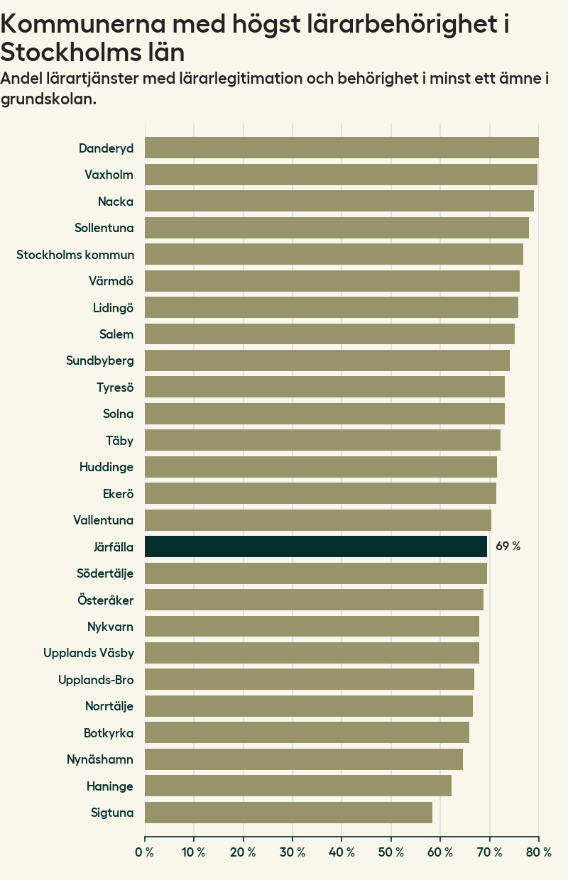 Av de sammanlagt 529 heltidstjänsterna i grundskolan i Järfälla kommun (motsvarande 570 lärare) var det 368 som hade lärarlegitimation och behörighet i minst ett ämne.