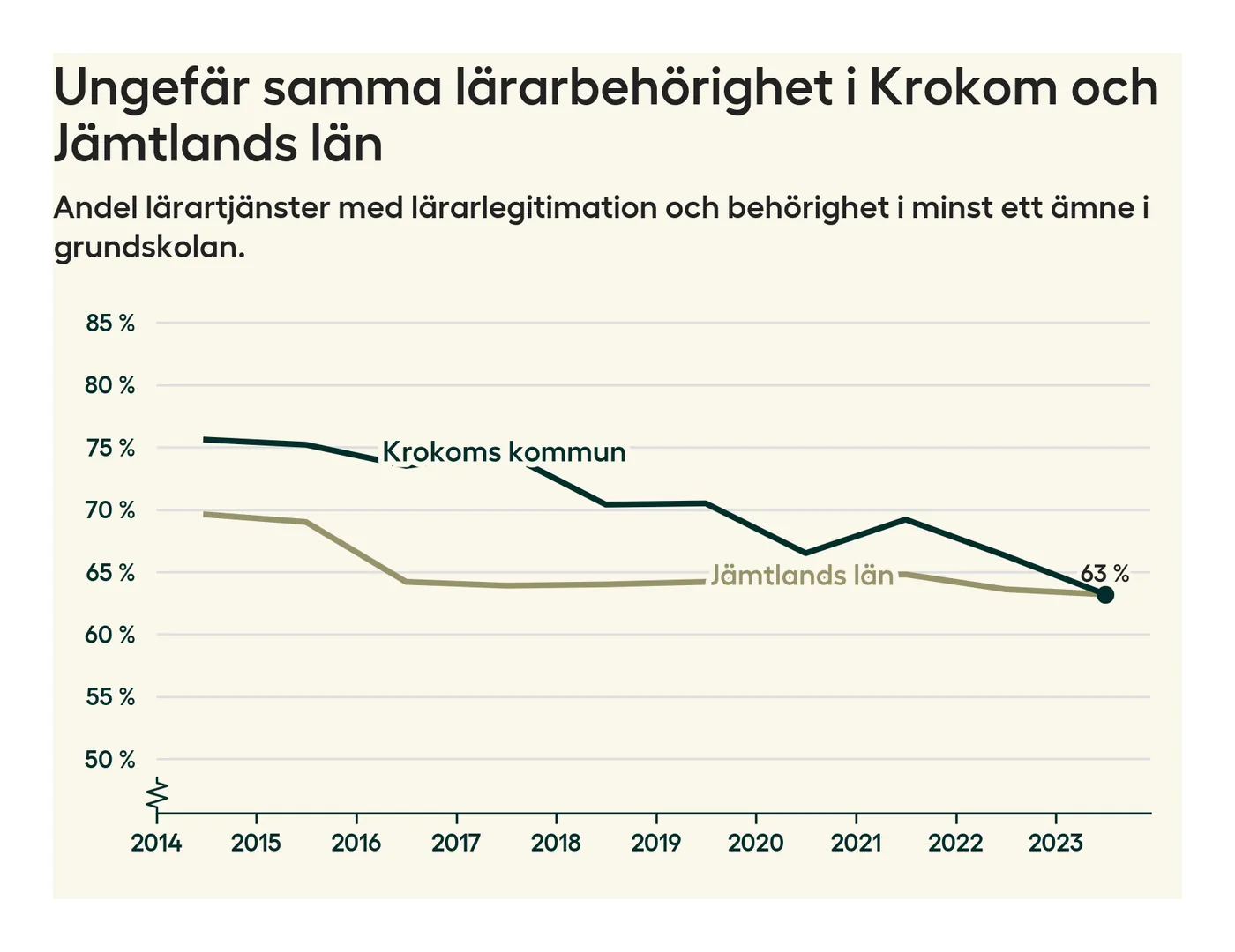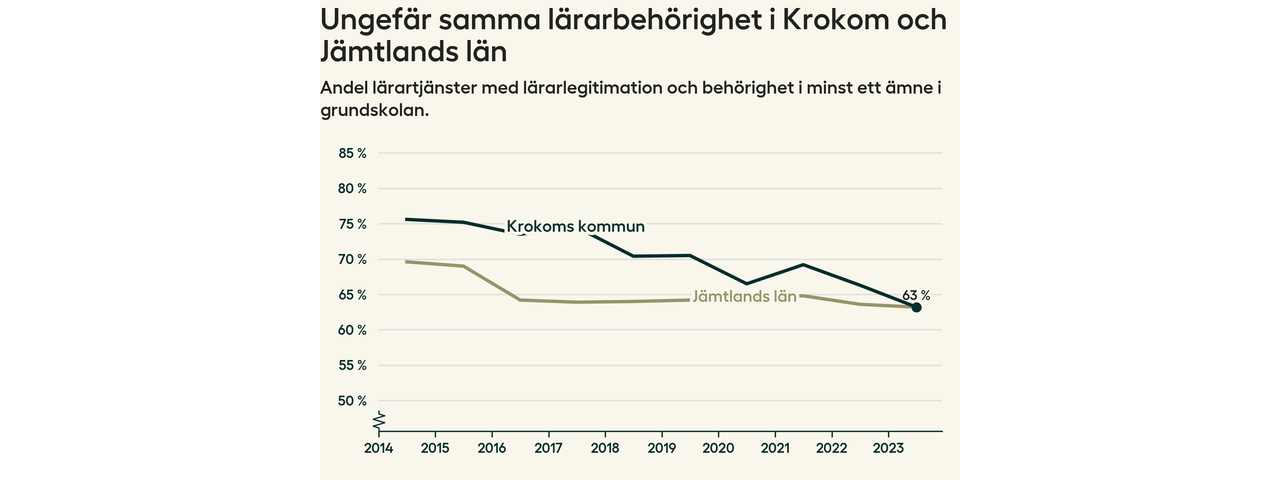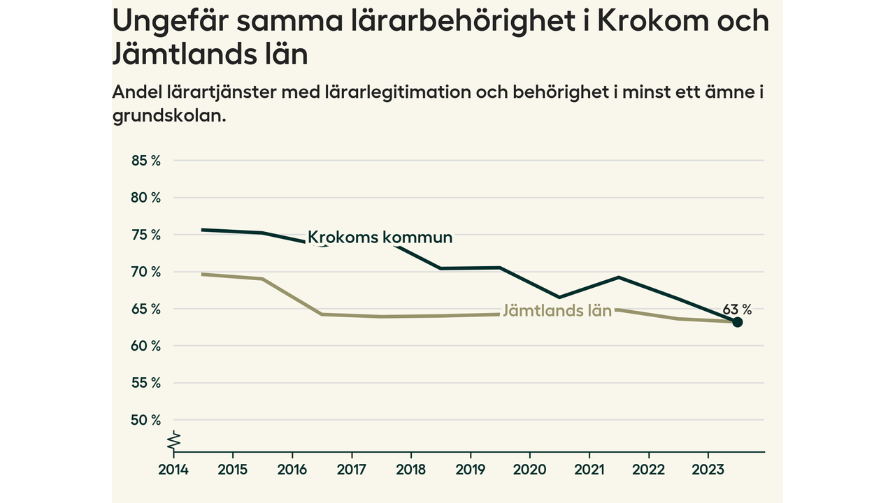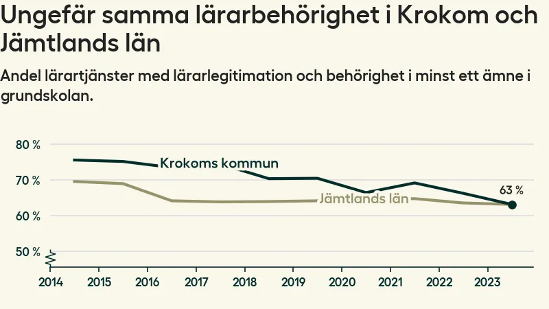I oktober 2023 hade motsvarande 63 procent av lärarna1 i grundskolan i Krokoms kommun lärarlegitimation och behörighet i minst ett ämne. Det är en minskning med tre procentenheter jämfört med året innan och den lägsta nivån som noterats sedan 2014.