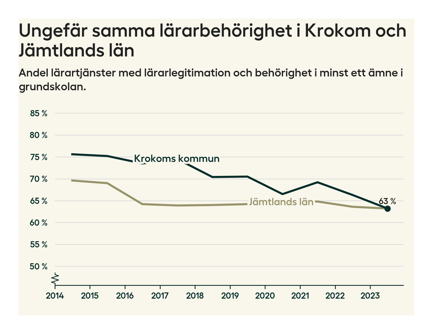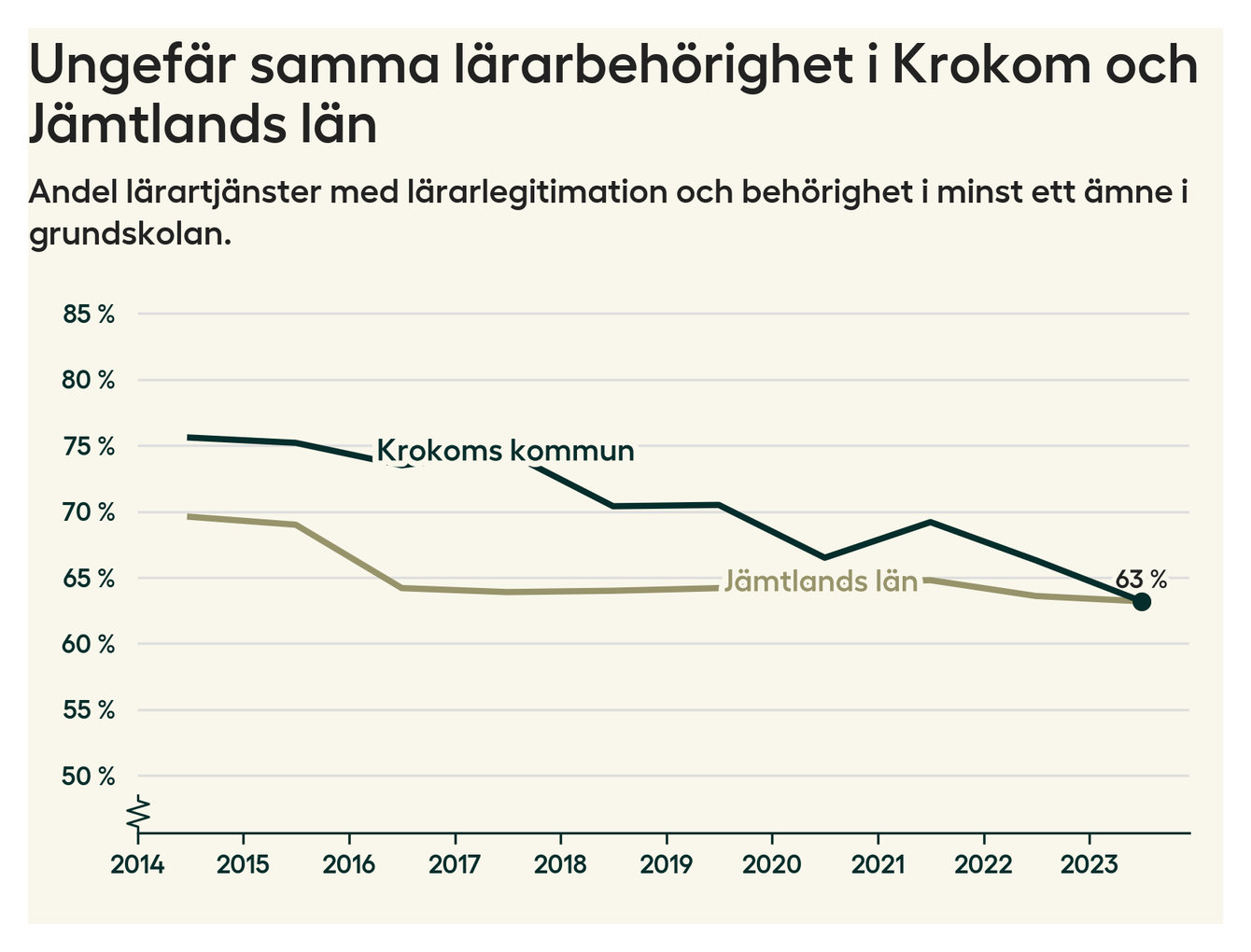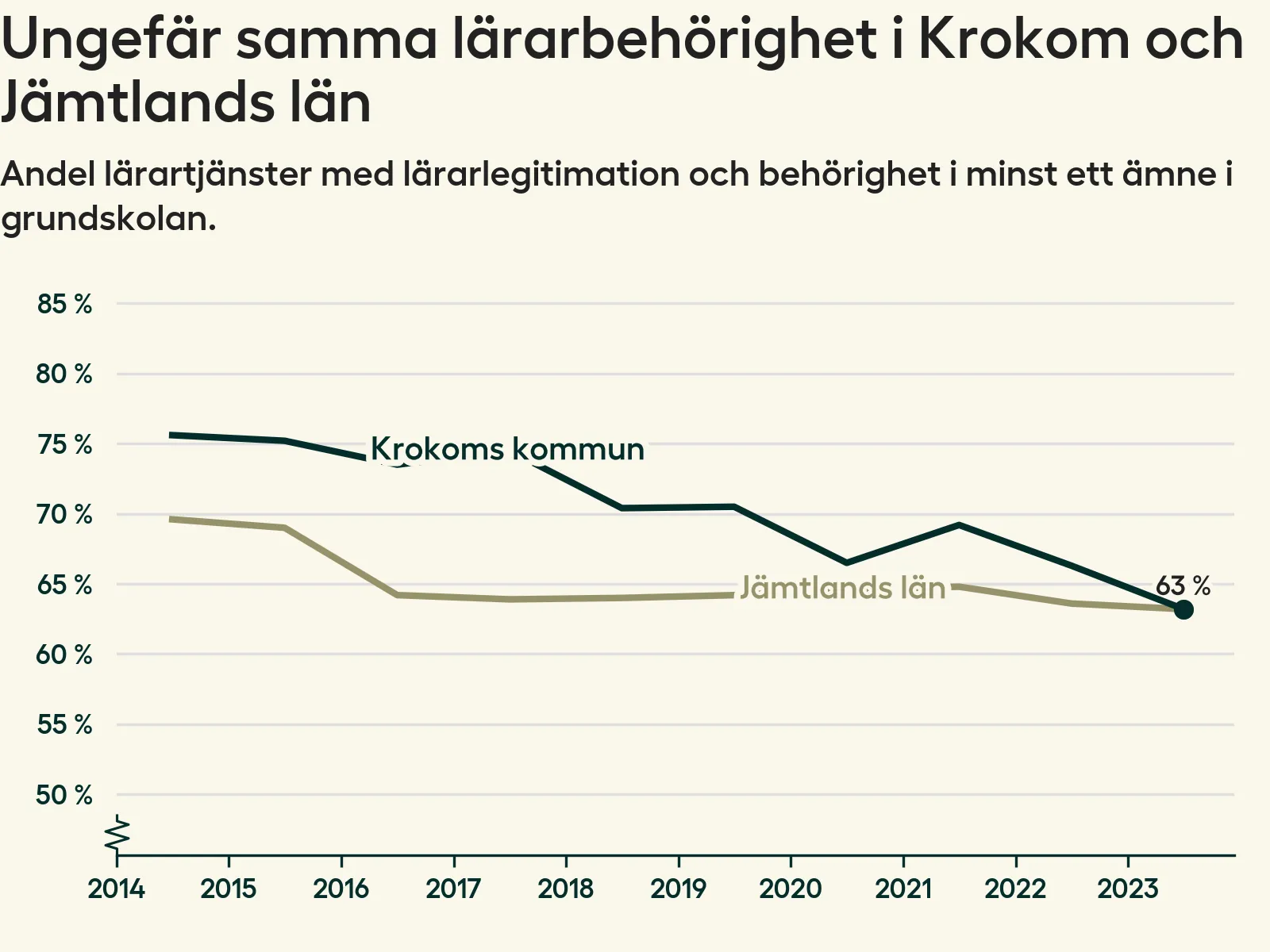 I oktober 2023 hade motsvarande 63 procent av lärarna1 i grundskolan i Krokoms kommun lärarlegitimation och behörighet i minst ett ämne. Det är en minskning med tre procentenheter jämfört med året innan och den lägsta nivån som noterats sedan 2014.