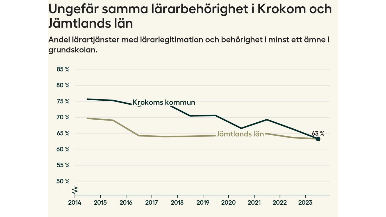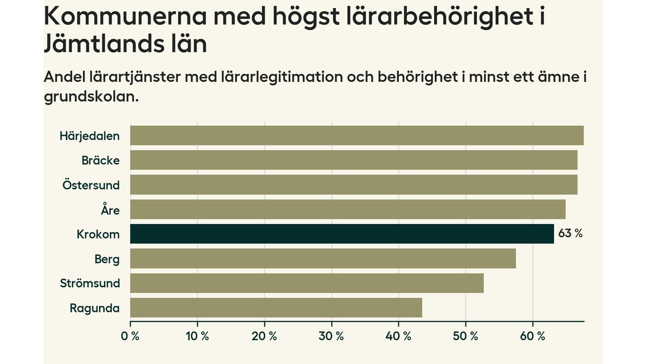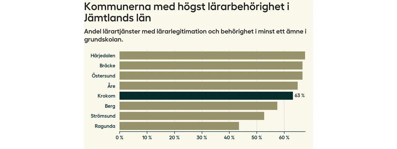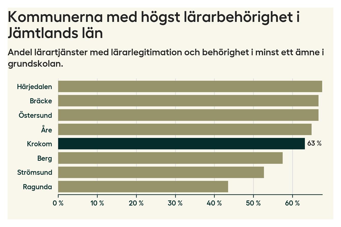 Av de sammanlagt 160 heltidstjänsterna i grundskolan i Krokoms kommun (motsvarande 203 lärare) var det 101 som hade lärarlegitimation och behörighet i minst ett ämne.