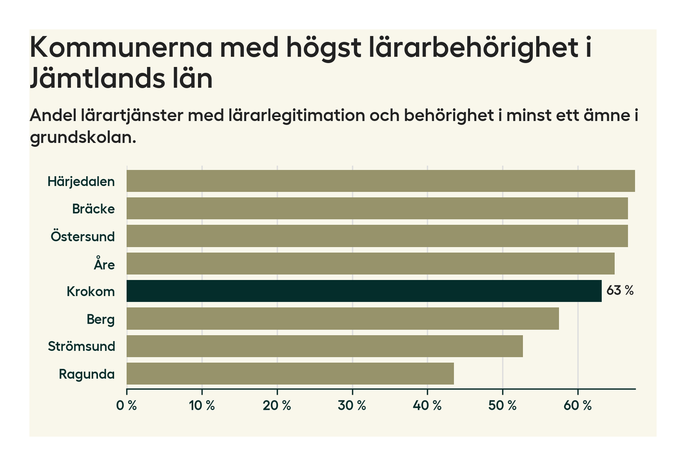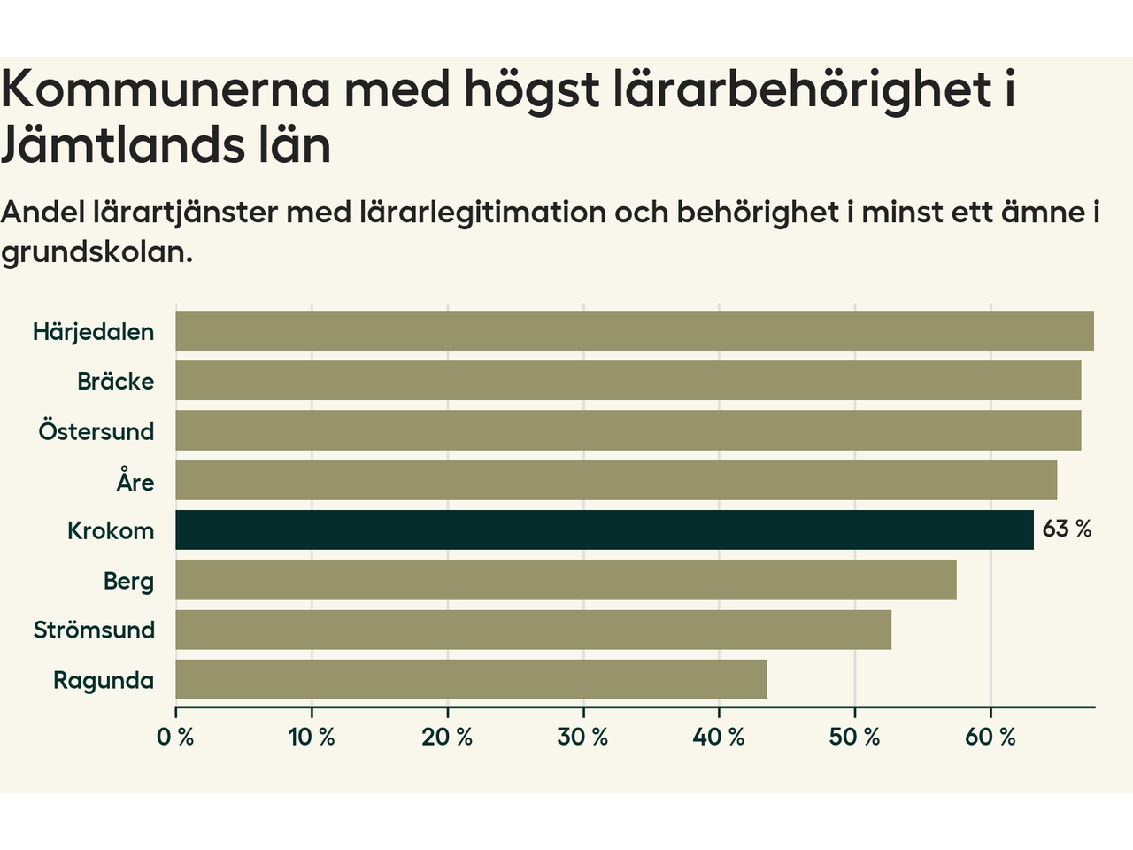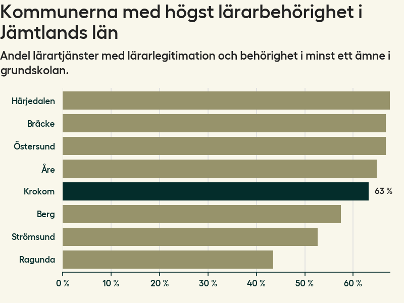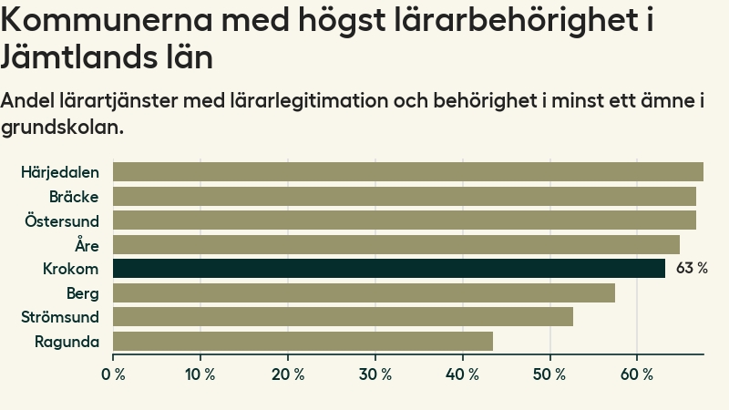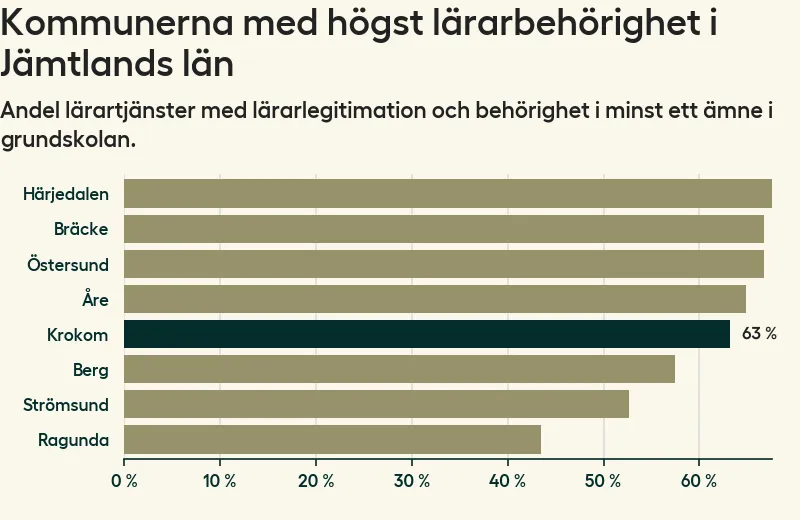 Av de sammanlagt 160 heltidstjänsterna i grundskolan i Krokoms kommun (motsvarande 203 lärare) var det 101 som hade lärarlegitimation och behörighet i minst ett ämne.