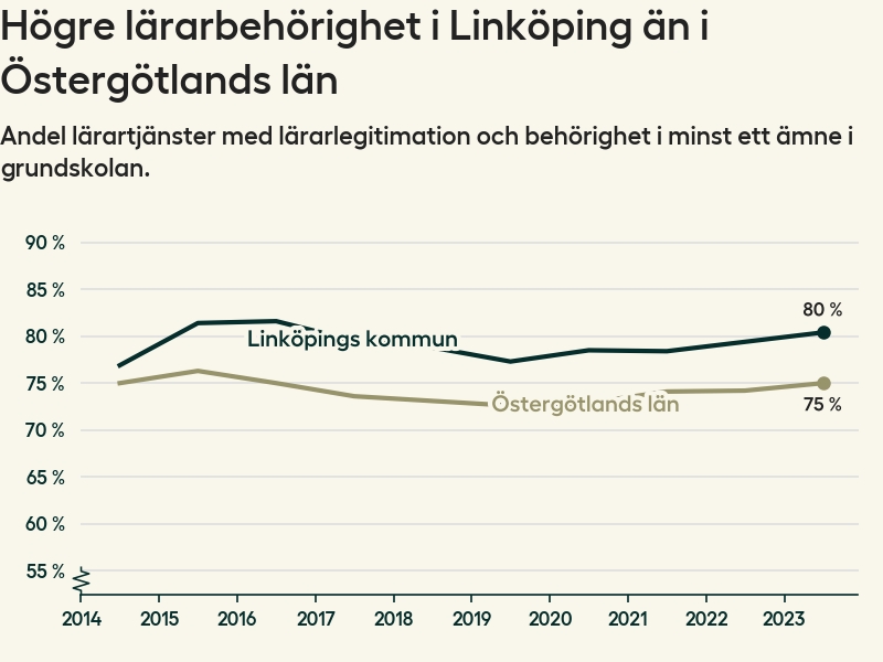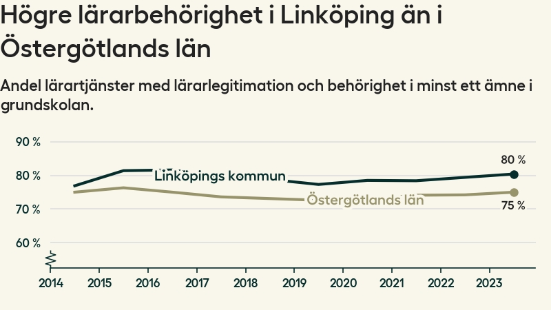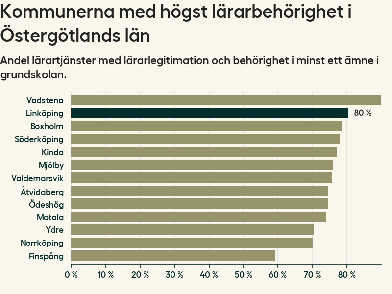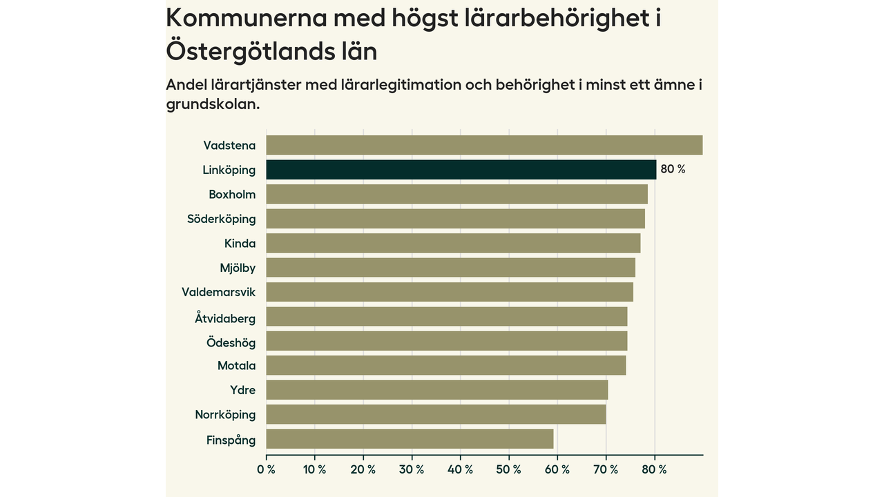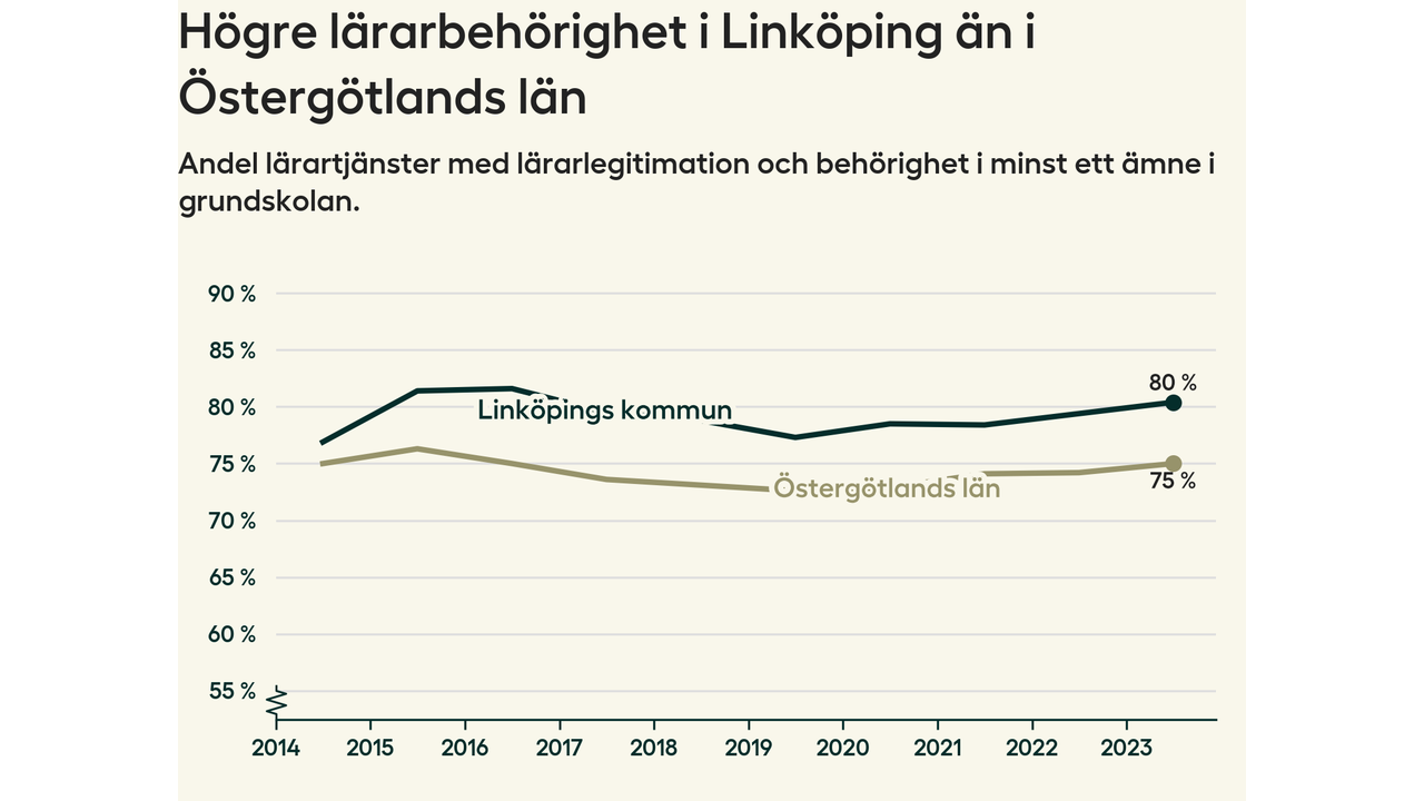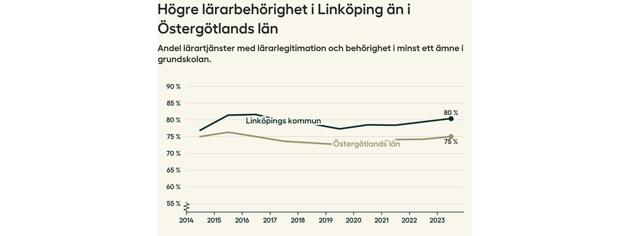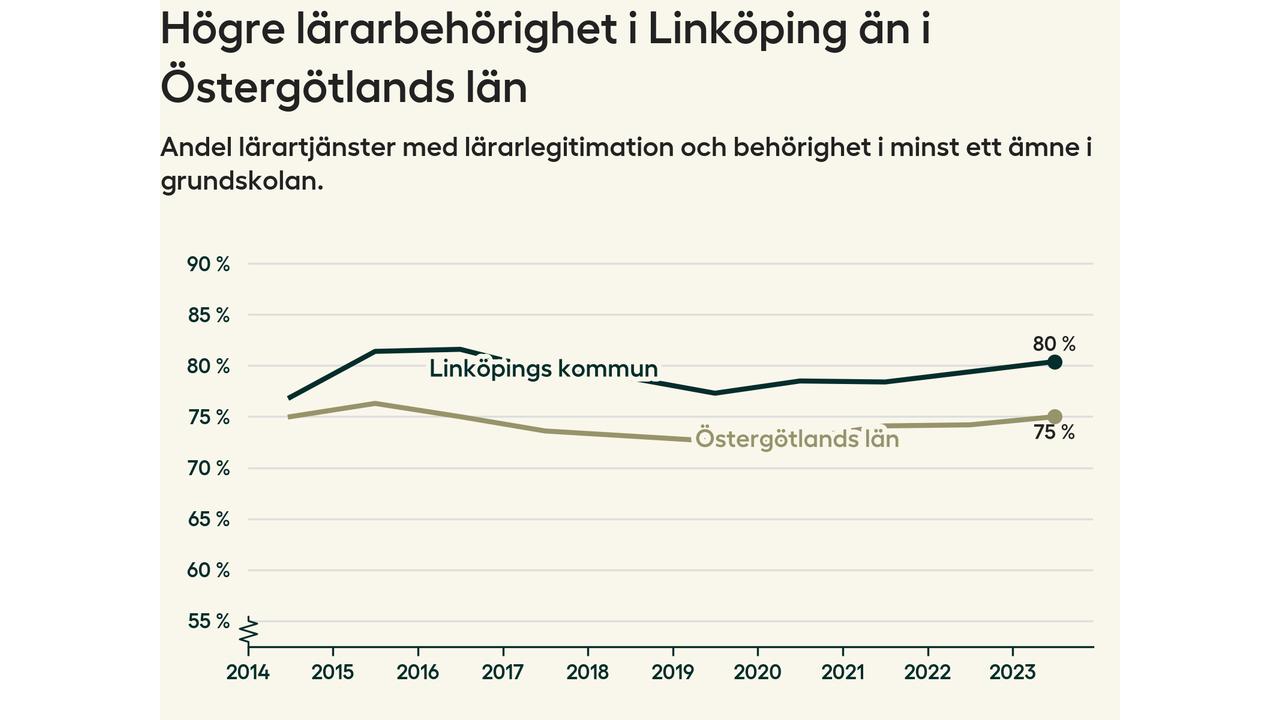 I oktober 2023 hade motsvarande 80 procent av lärarna​​1 i grundskolan i Linköpings kommun lärarlegitimation och behörighet i minst ett ämne. Det innebär att kommunen har den näst högsta lärarbehörigheten i Östergötlands län.