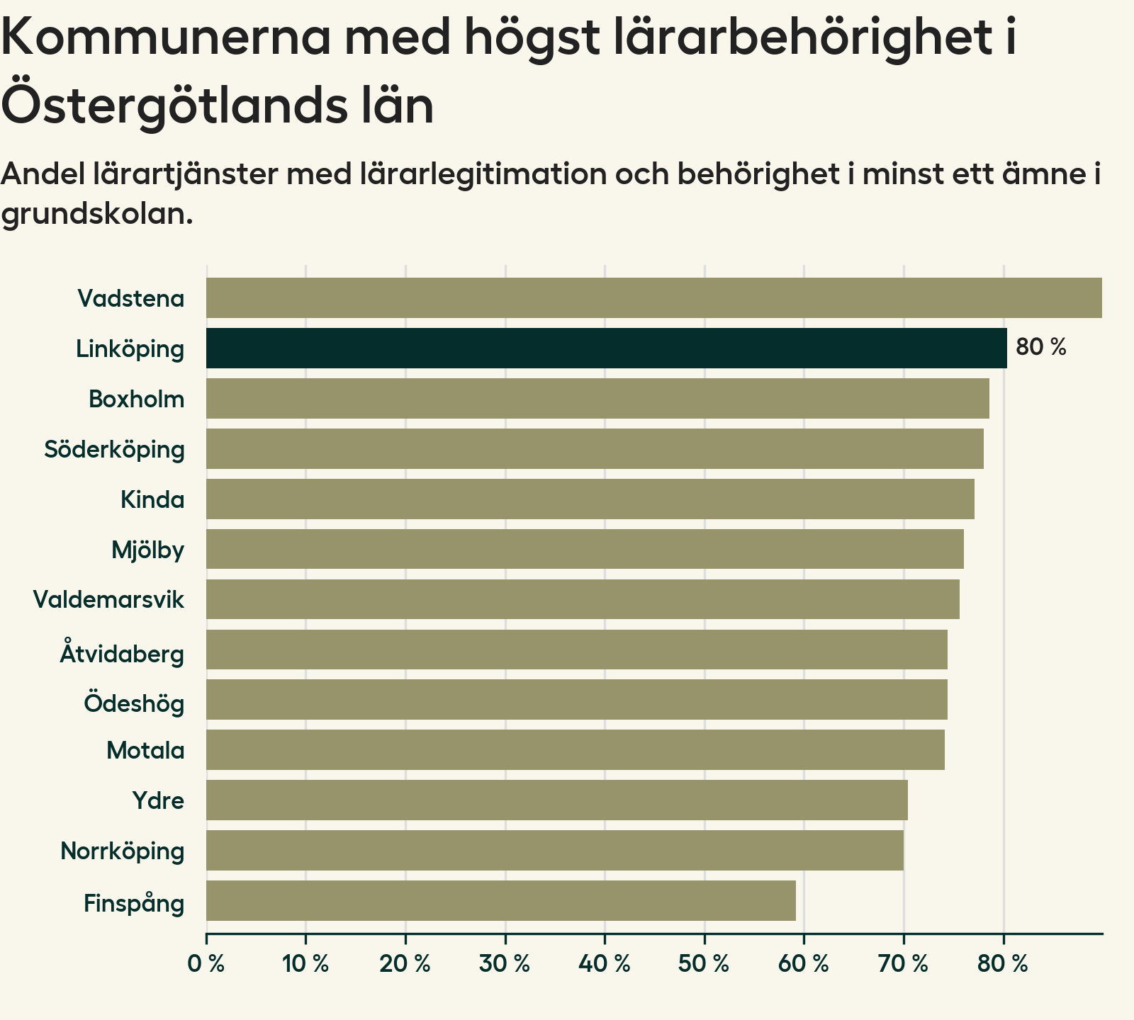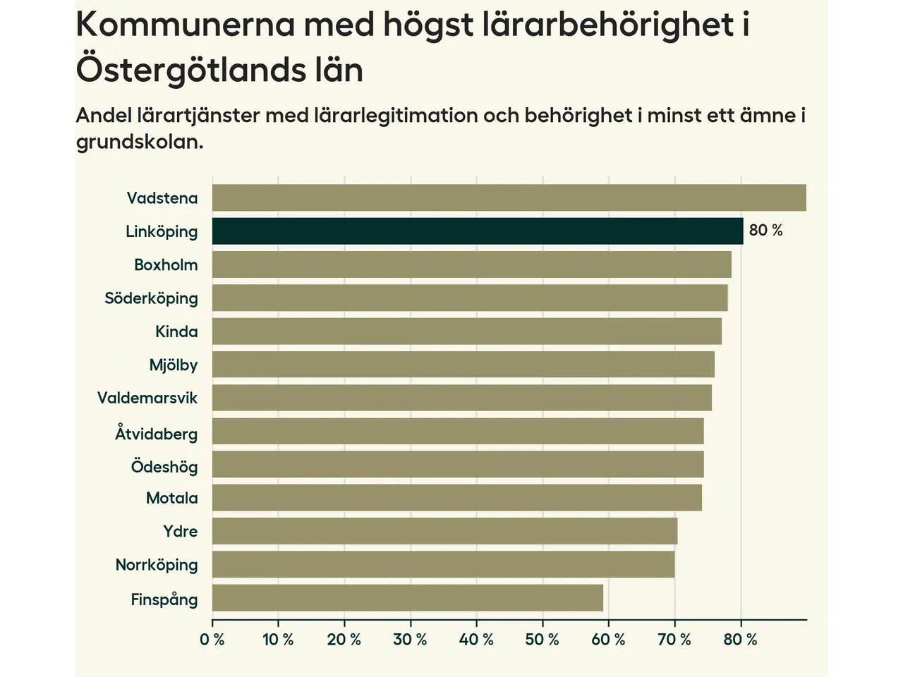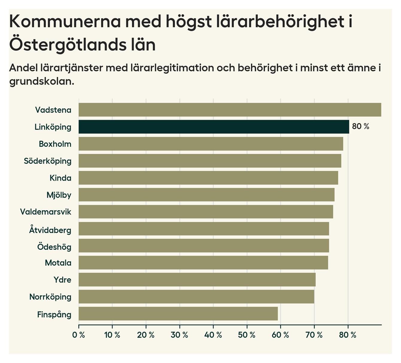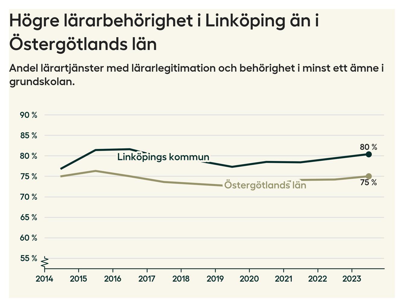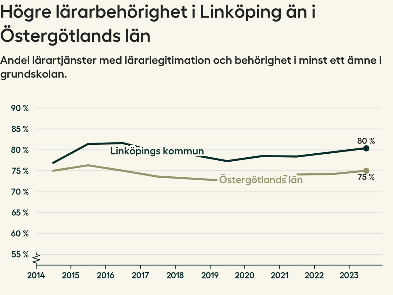 I oktober 2023 hade motsvarande 80 procent av lärarna​​1 i grundskolan i Linköpings kommun lärarlegitimation och behörighet i minst ett ämne. Det innebär att kommunen har den näst högsta lärarbehörigheten i Östergötlands län.