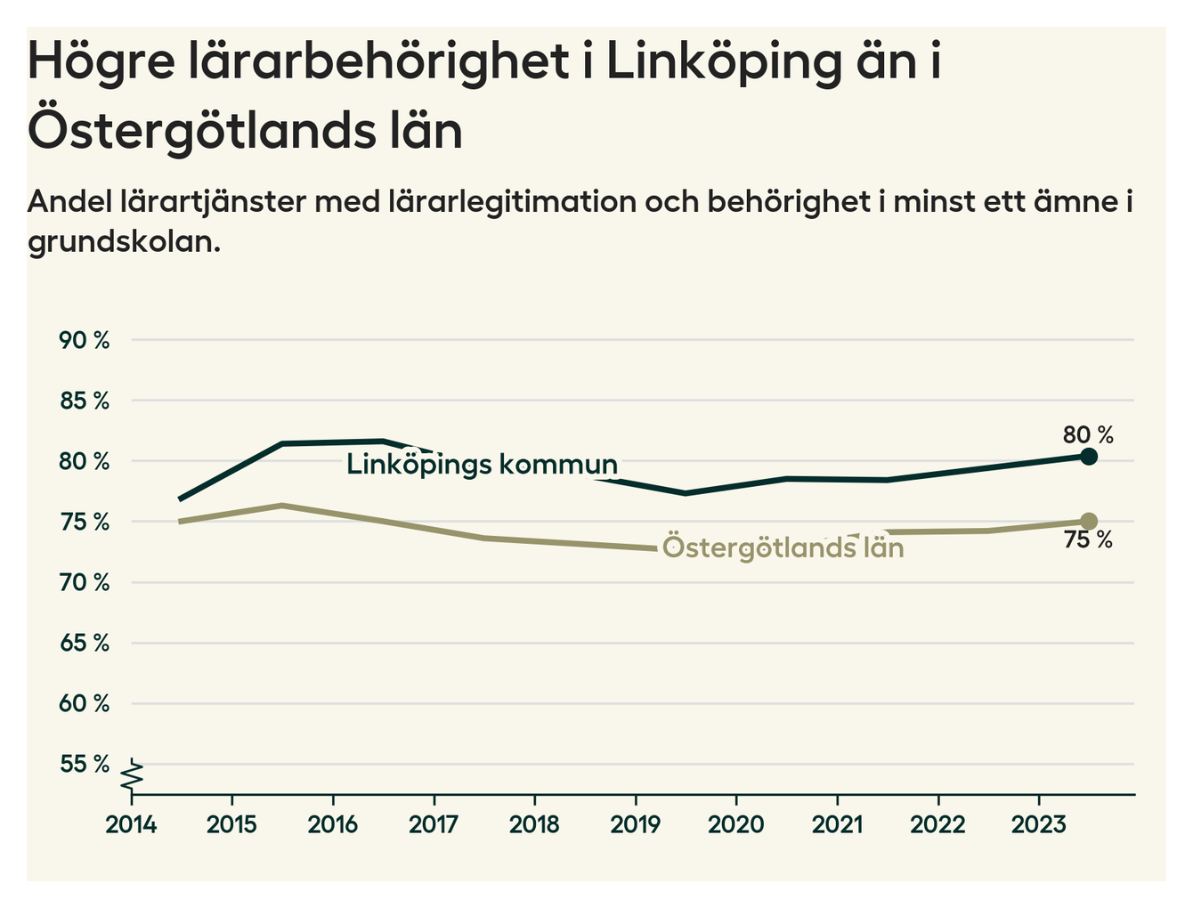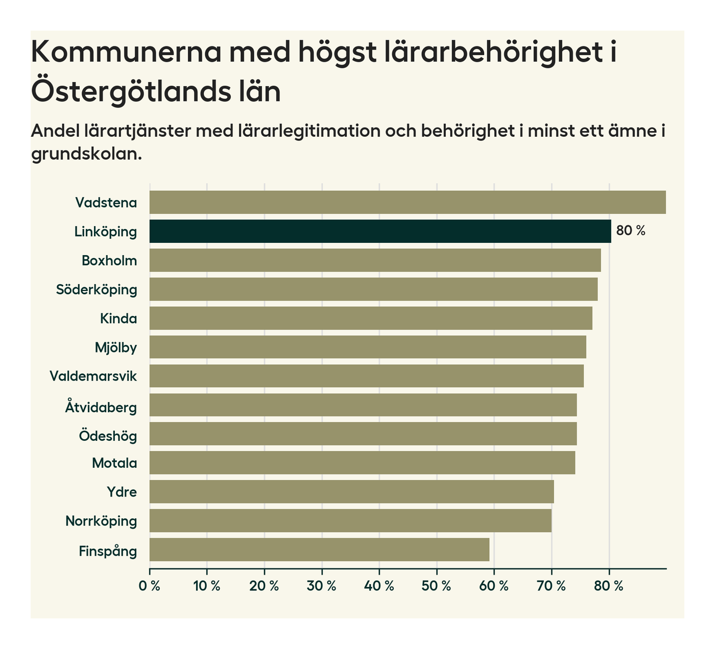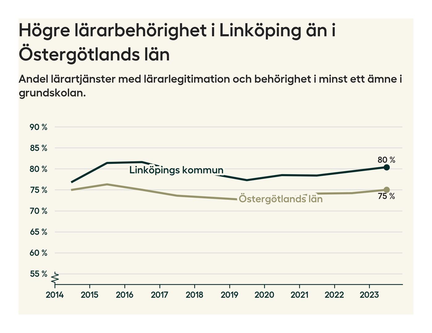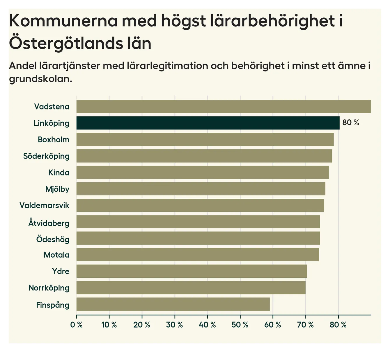 I oktober 2023 hade motsvarande 80 procent av lärarna​​1 i grundskolan i Linköpings kommun lärarlegitimation och behörighet i minst ett ämne. Det innebär att kommunen har den näst högsta lärarbehörigheten i Östergötlands län.