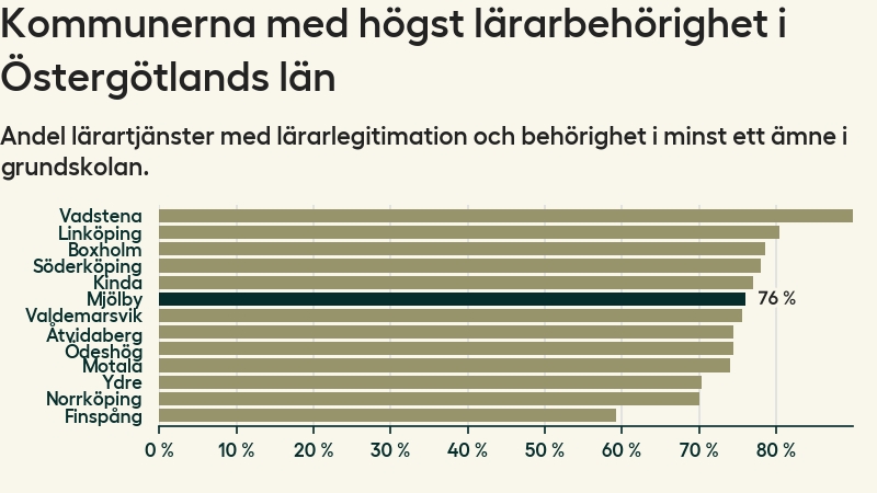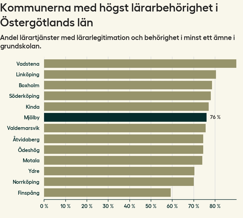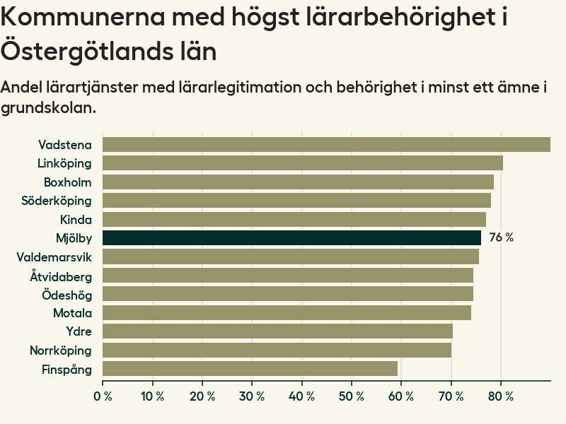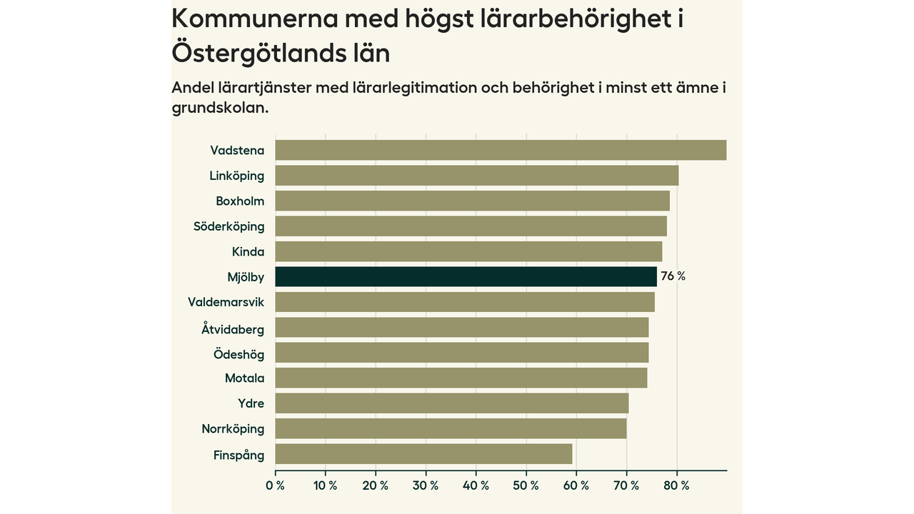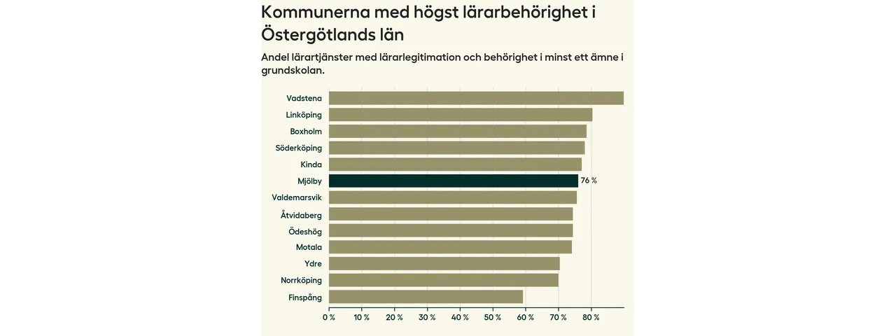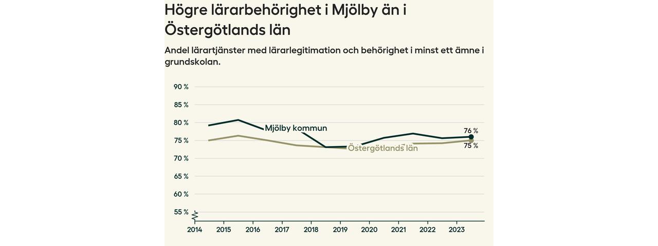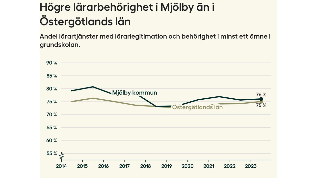 I oktober 2023 hade motsvarande 76 procent av lärarna1 i grundskolan i Mjölby kommun lärarlegitimation och behörighet i minst ett ämne.