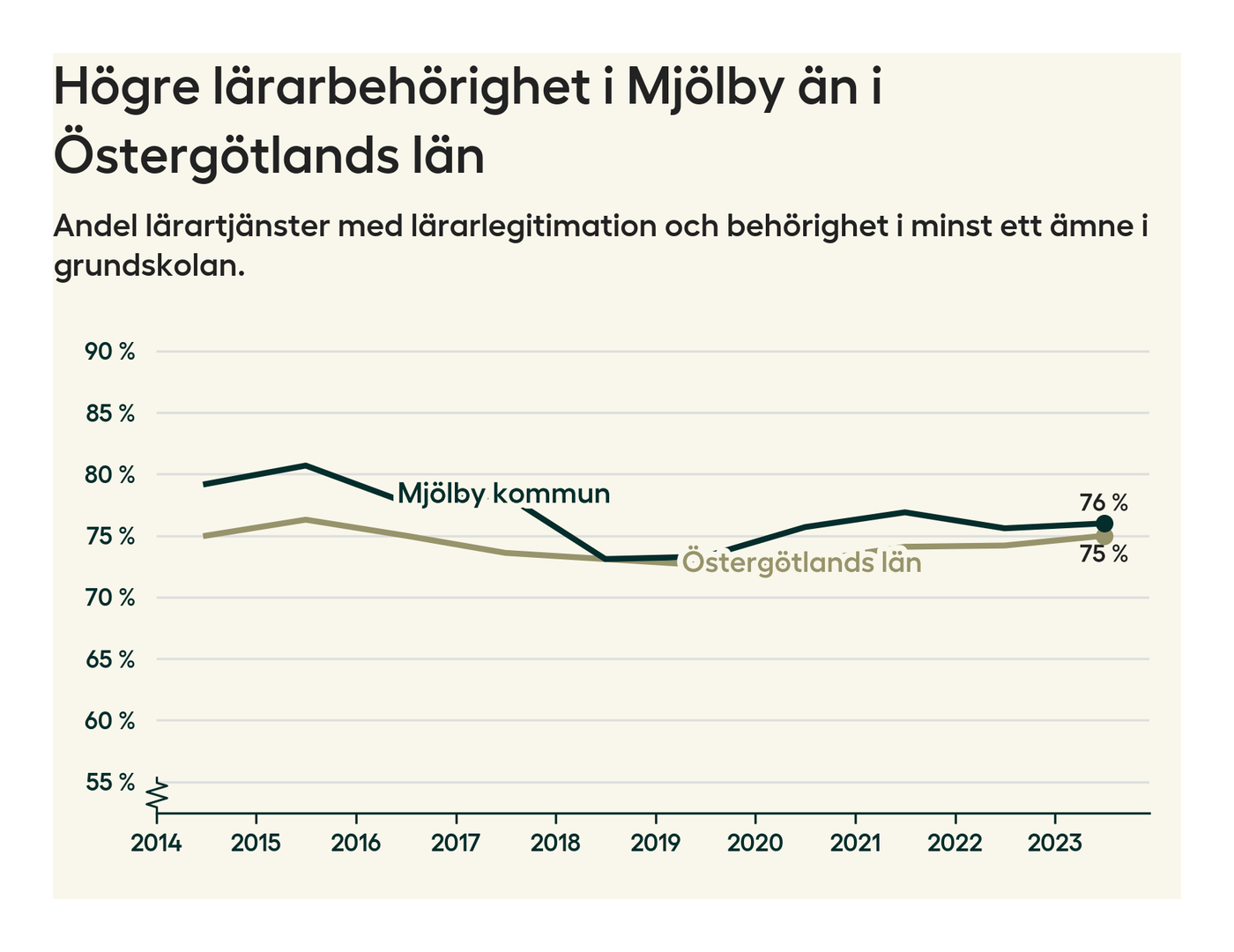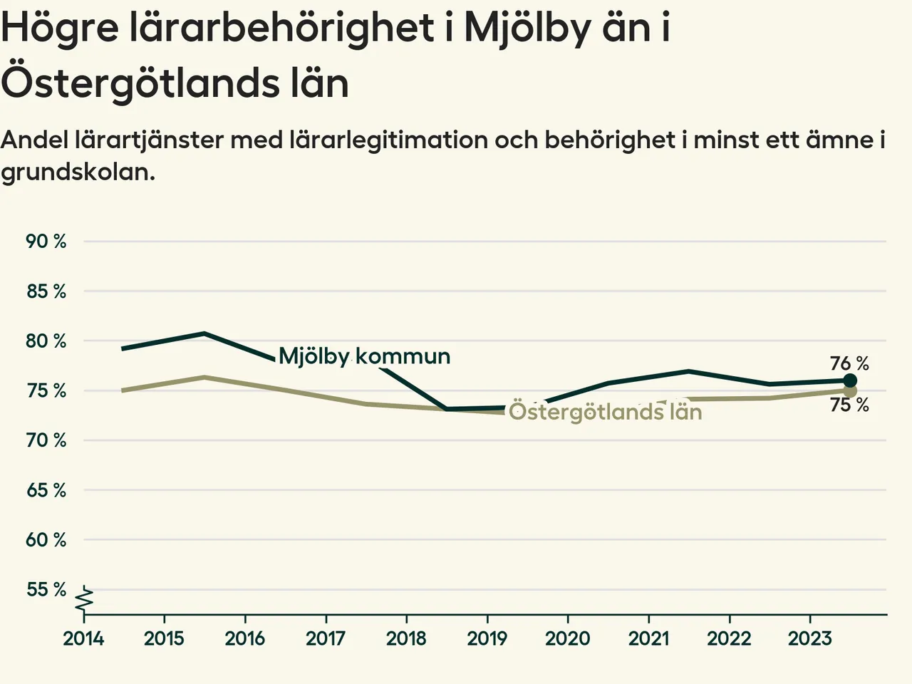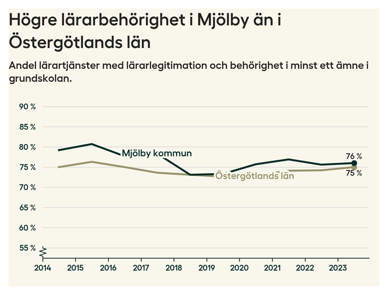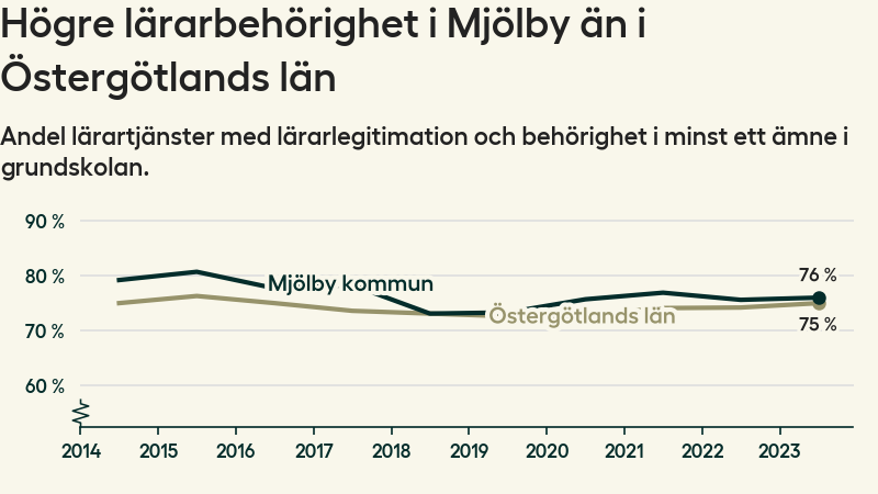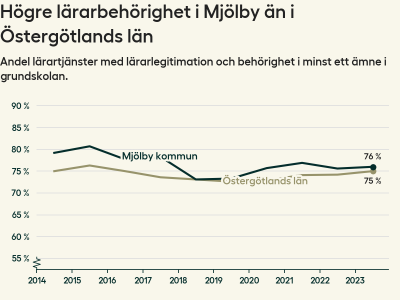 I oktober 2023 hade motsvarande 76 procent av lärarna1 i grundskolan i Mjölby kommun lärarlegitimation och behörighet i minst ett ämne.