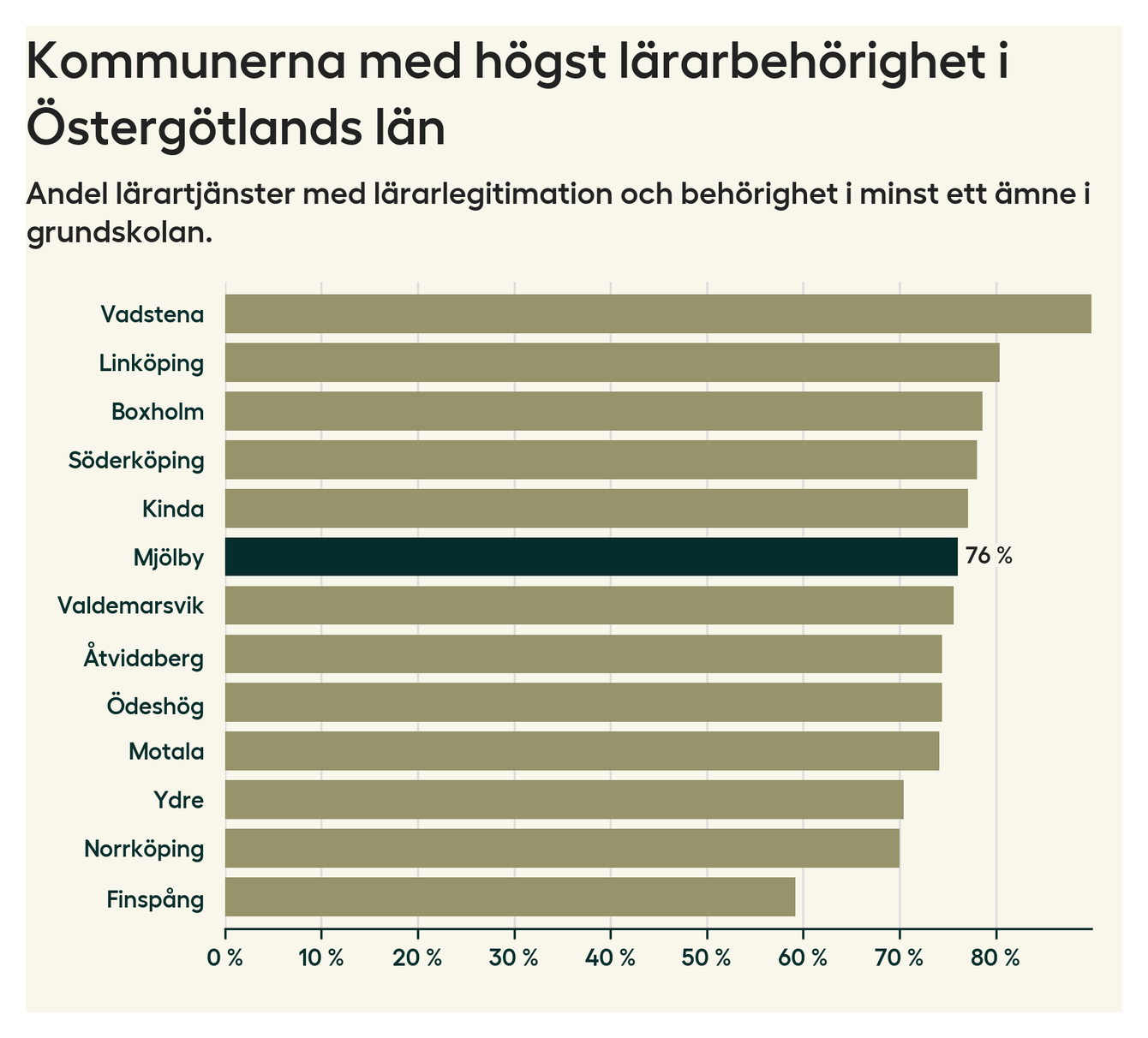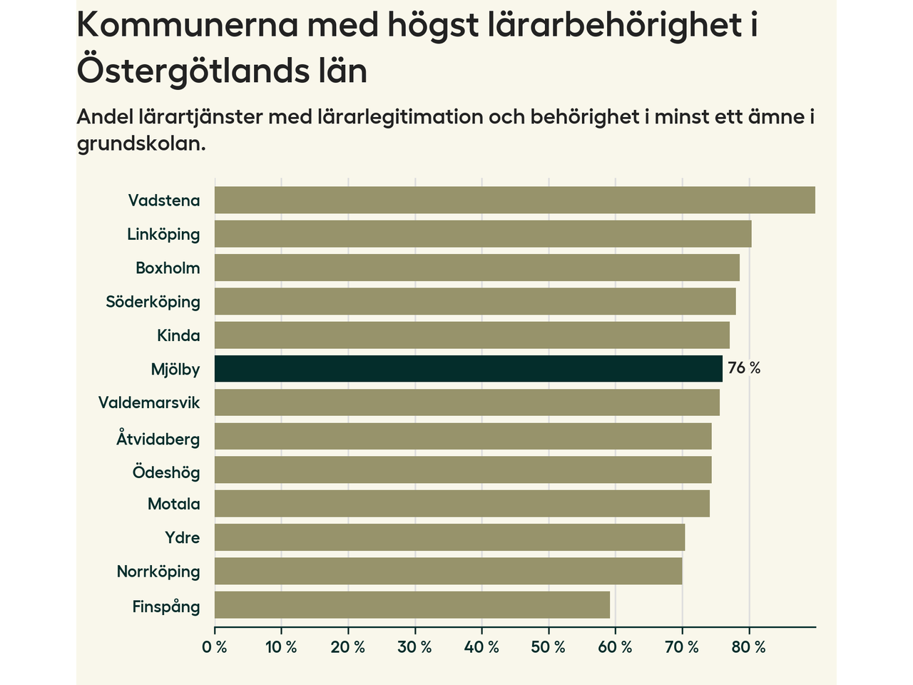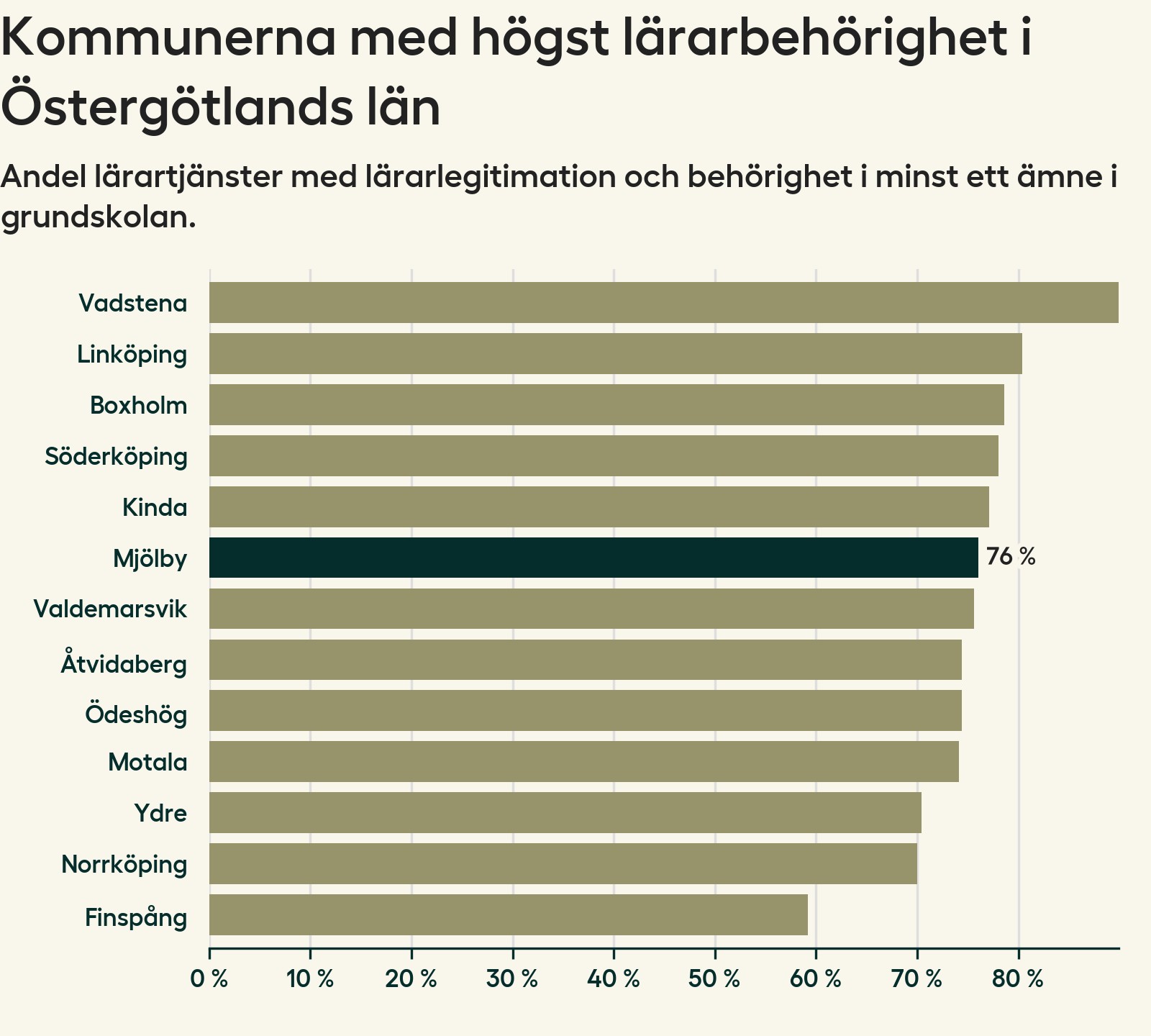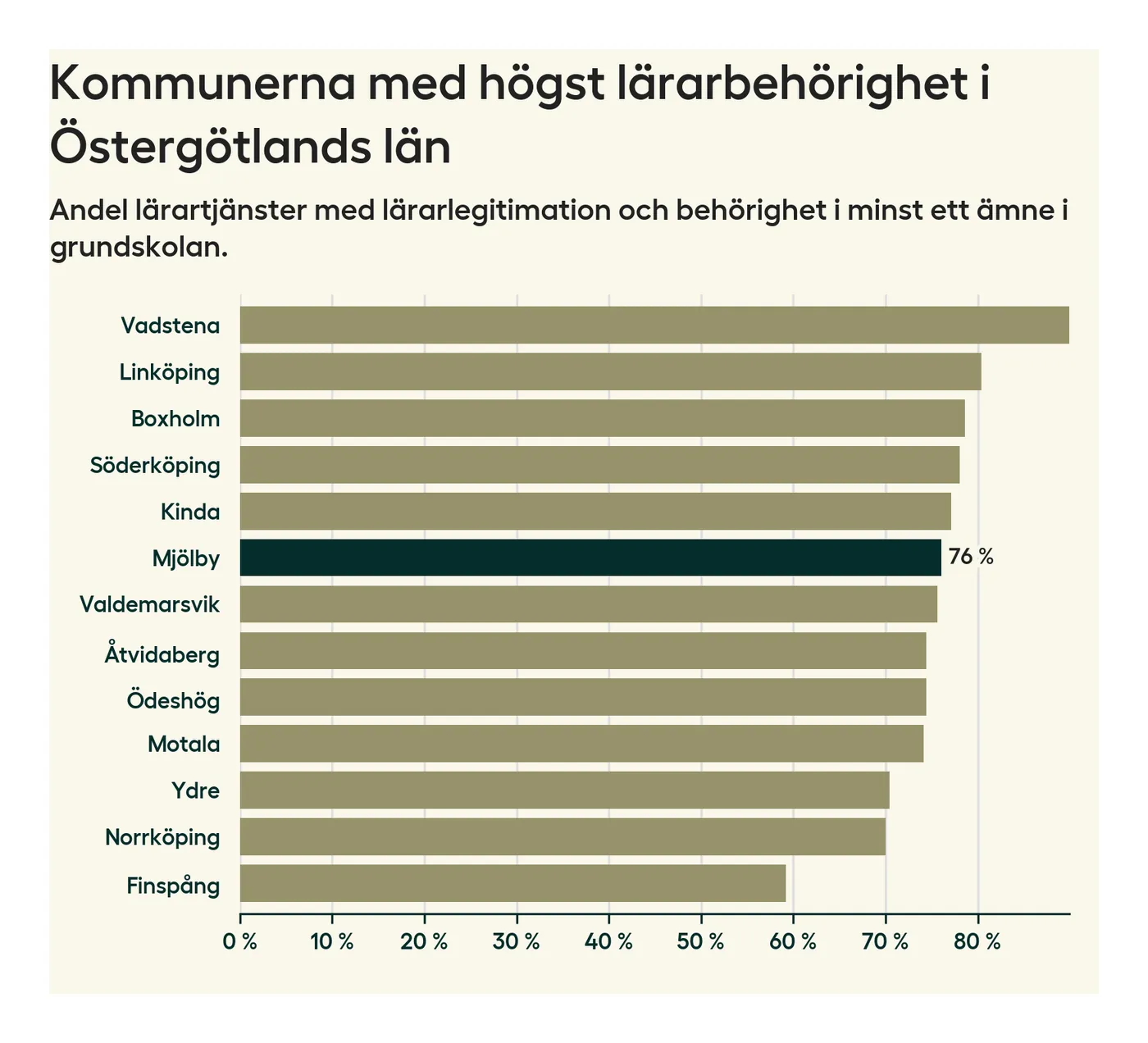 I oktober 2023 hade motsvarande 76 procent av lärarna1 i grundskolan i Mjölby kommun lärarlegitimation och behörighet i minst ett ämne.