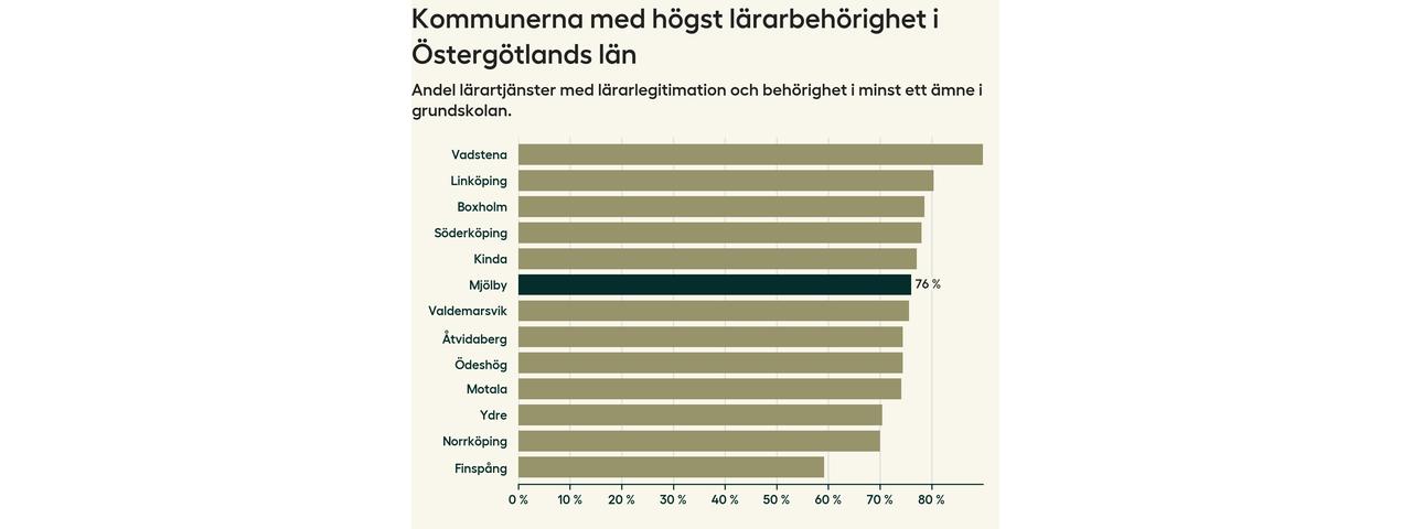 Av de sammanlagt 255 heltidstjänsterna i grundskolan i Mjölby kommun (motsvarande 294 lärare) var det 194 som hade lärarlegitimation och behörighet i minst ett ämne.