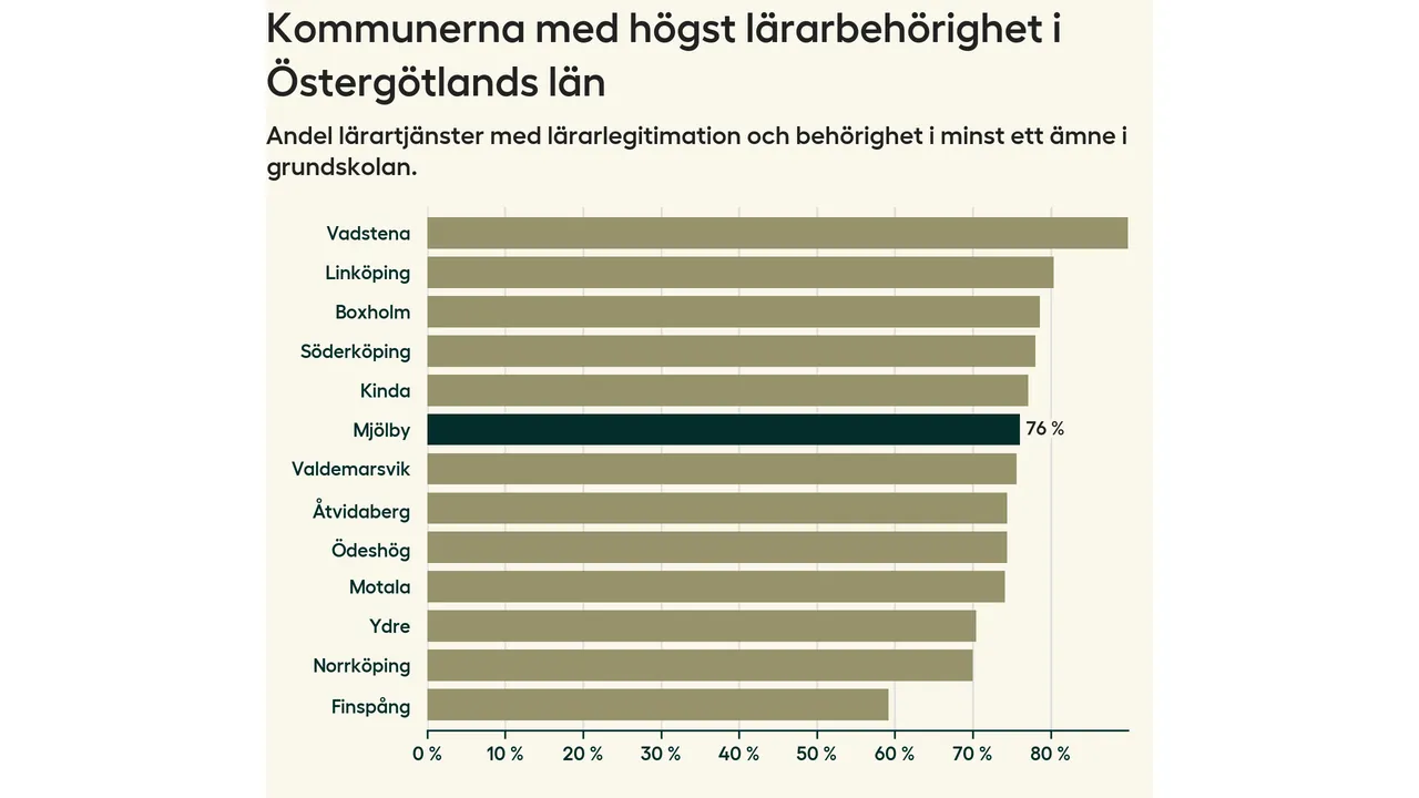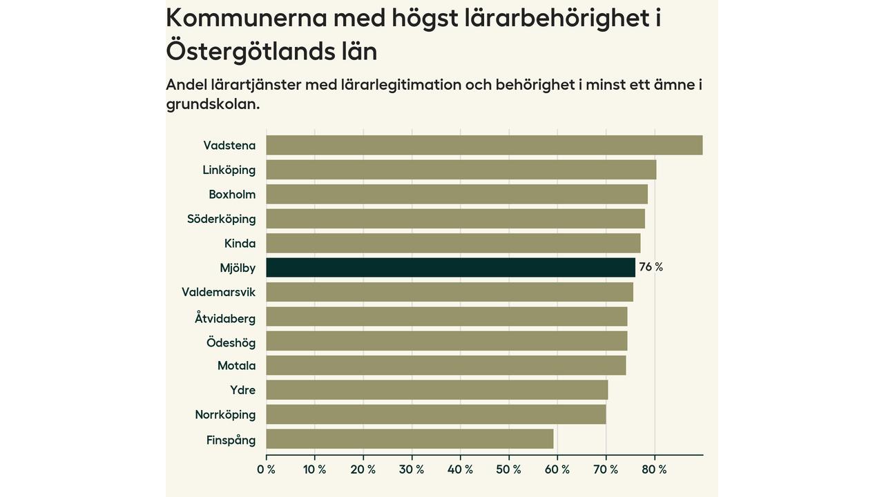 Lärarbehörigheten i Mjölby kommun ligger kvar på 76 procent, vilket är över snittet för hela landet.