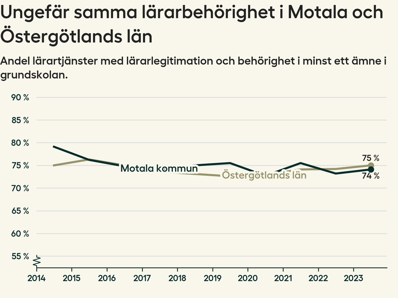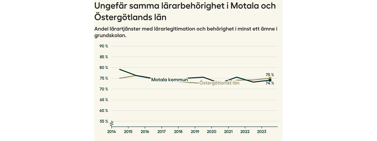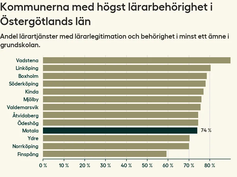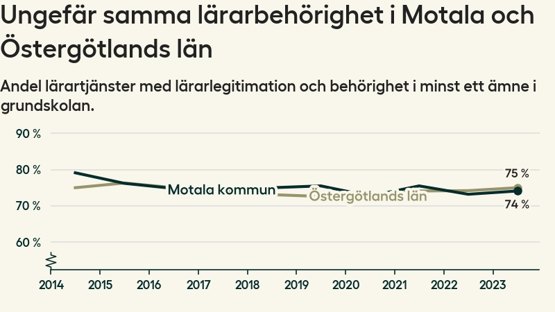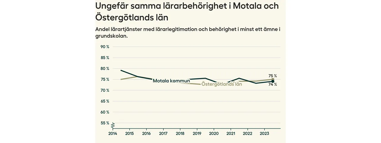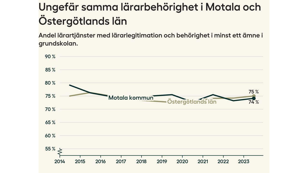 I oktober 2023 hade motsvarande 74 procent av lärarna1 i grundskolan i Motala kommun lärarlegitimation och behörighet i minst ett ämne.