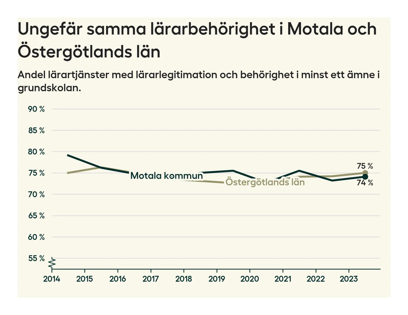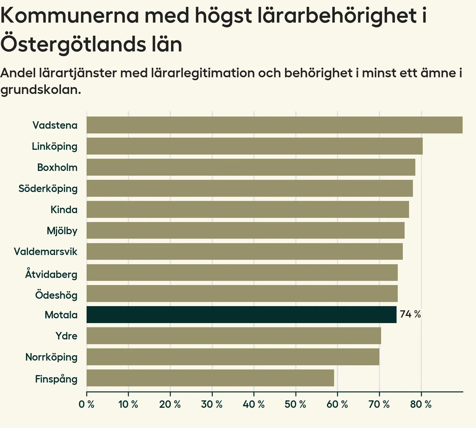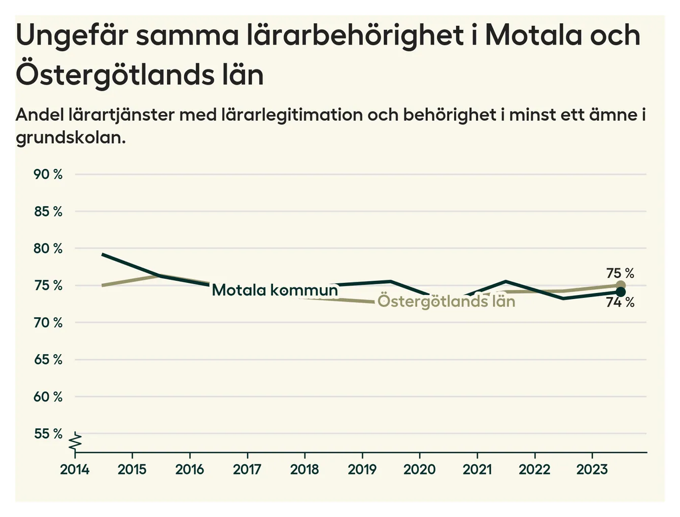 I oktober 2023 hade motsvarande 74 procent av lärarna1 i grundskolan i Motala kommun lärarlegitimation och behörighet i minst ett ämne.